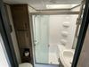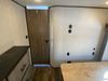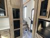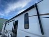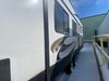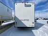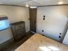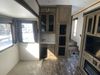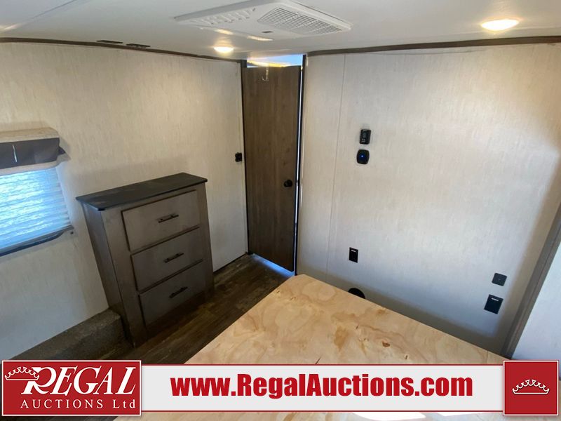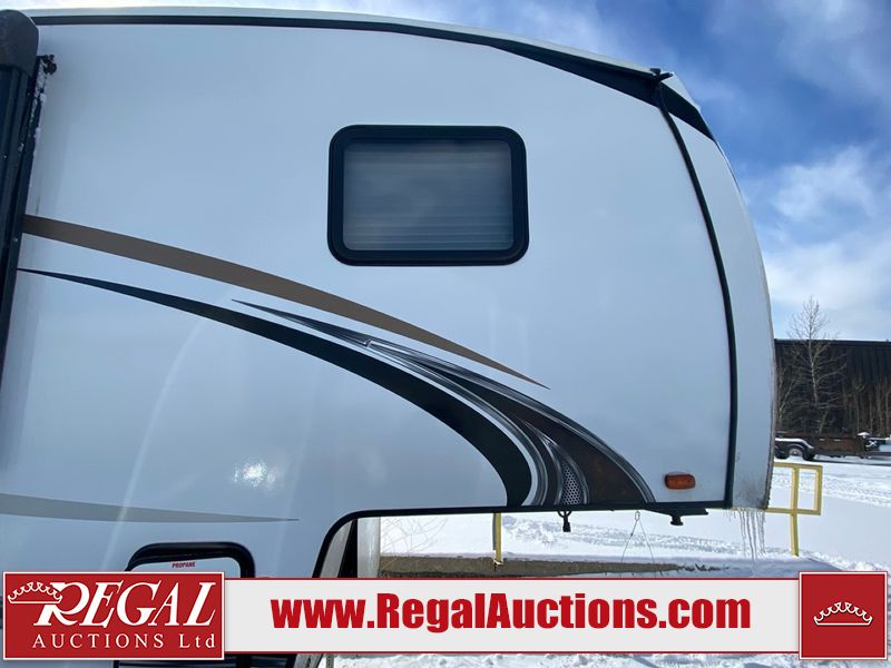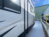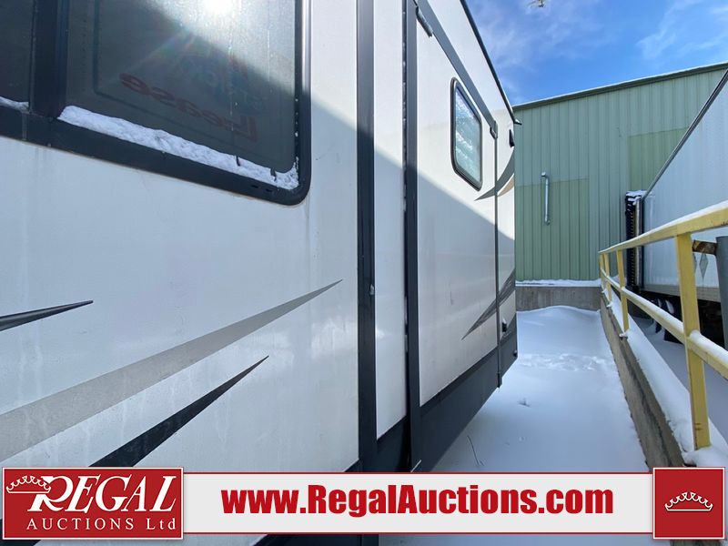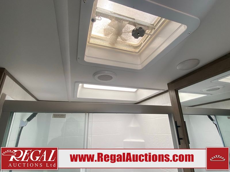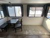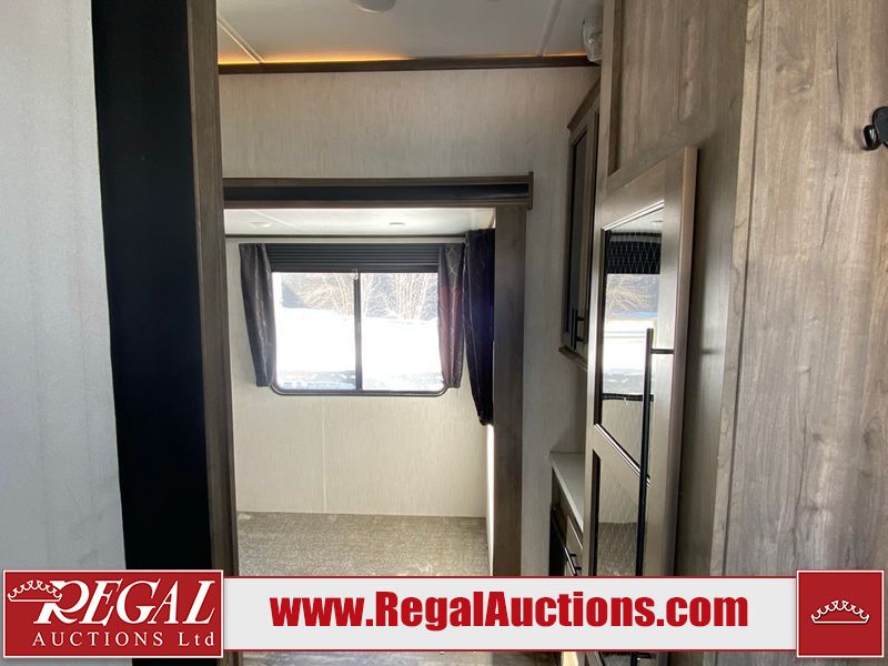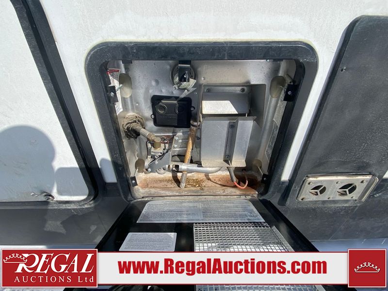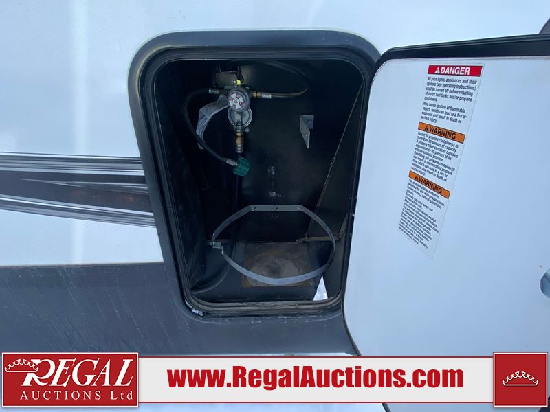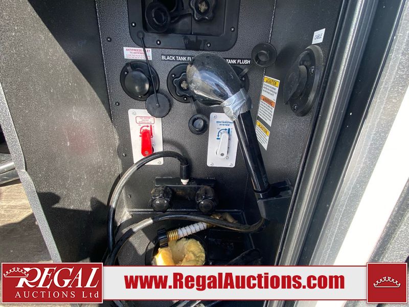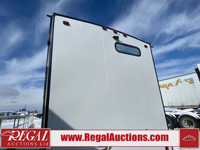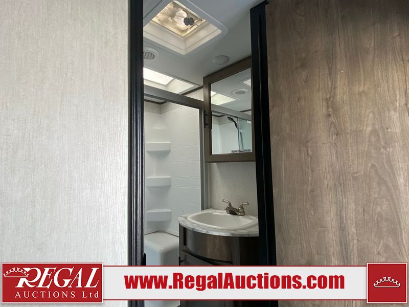 This unit is a 2022 Forest River Sabre Cobalt Series 38DBQ model tandem axel fifth wheel trailer. It has two door entry, roof air, and three slide outs accommodating the living area, kitchen, bunkhouse and master bedroom. The interior is clean. The exterior is made out of hard fiberglass. All walls are showing minor chips and scratches. The battery is dead. This unit gets power with external power applied. Tires are mounted on alloy rims and appear to be in good enough condition for use. This unit is equipped with a three burner stove, microwave, refrigerator, television, stereo system, and an exterior prep station. The layout consist of a master bedroom, bathroom at the front, dinette, kitchen at the center and bunk house with washroom at the rear.