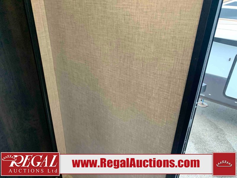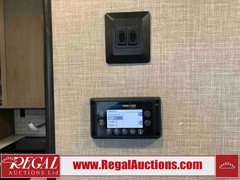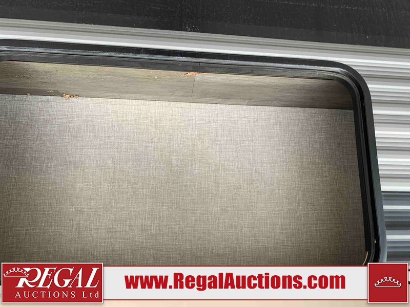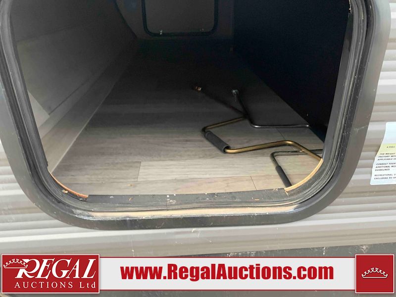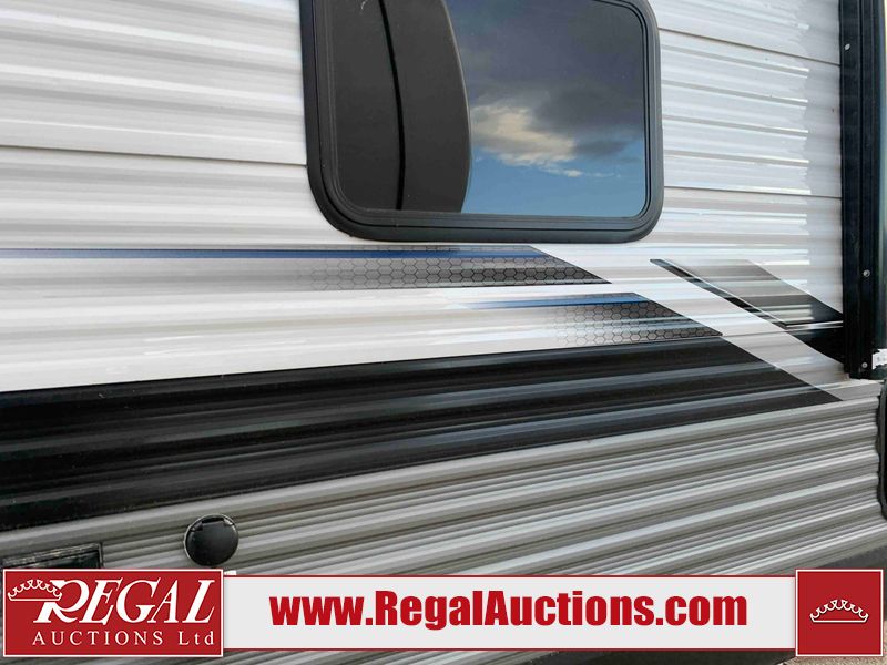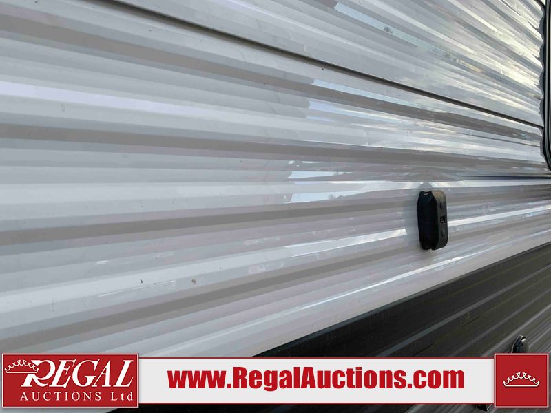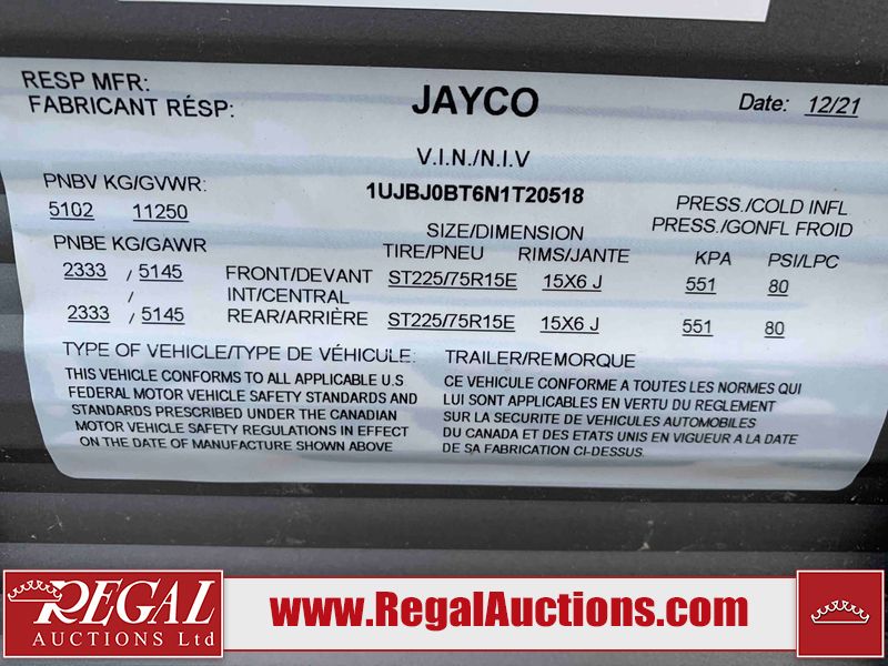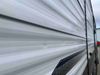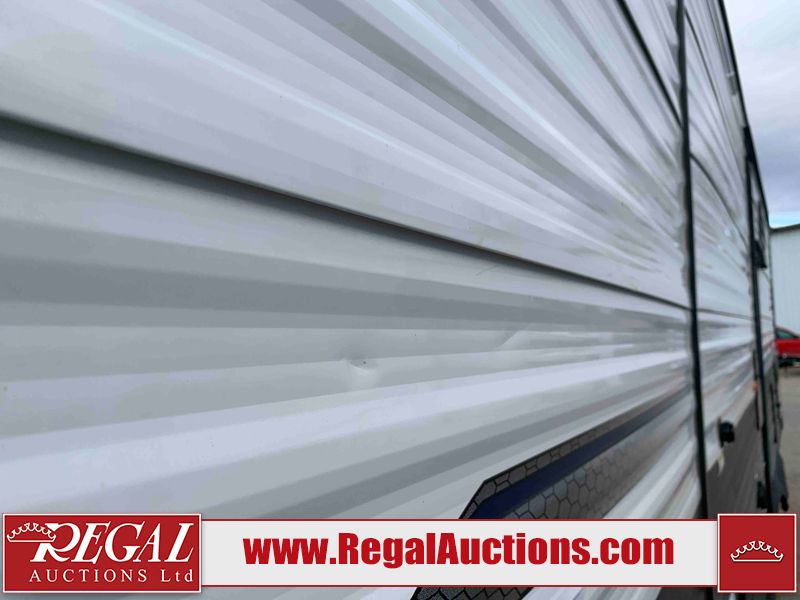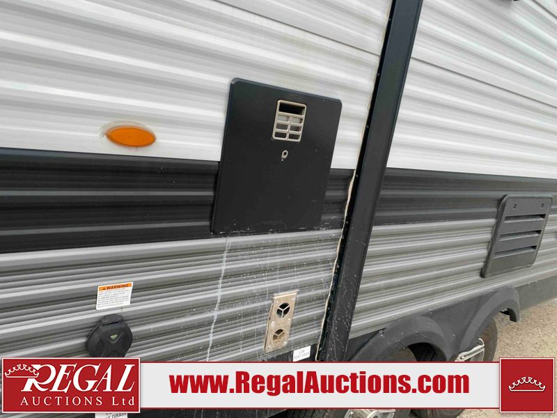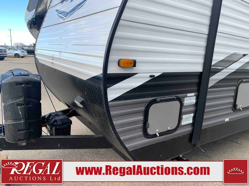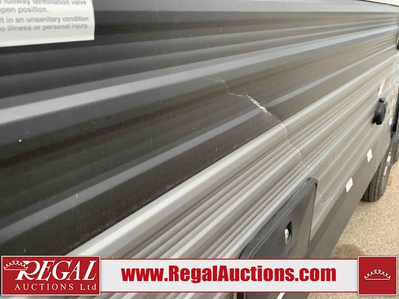 This RV is a 2022J Jayco flight 34RSBS model tandem axle bumper pole trailer. It has a single door entry, roof air, and three slide outs accommodating the master bedroom and the living area. The interior is dirty. Some walls are showing scratches and scuffs. There are drill holes on the right wall. The master bedroom, and bathroom ceiling are showing water damage. The bathroom fan trim is cracked. The right wall is lifting. The living area skylight is separating. Exterior walls are made of soft wall aluminum. Both sidewalls have scratches and scuffs. The left wall is dented. The right wall has hail damage. This unit is equipped with a battery and two propane tanks. The tires are mounted to alloy rims and appear to be in good enough condition for use. This unit is equipped with a microwave, three burner stove top, oven, refrigerator, stereo system, and a television. The layout consists of a master bedroom/bathroom in the front and a kitchenette/dinette in the rear.