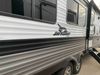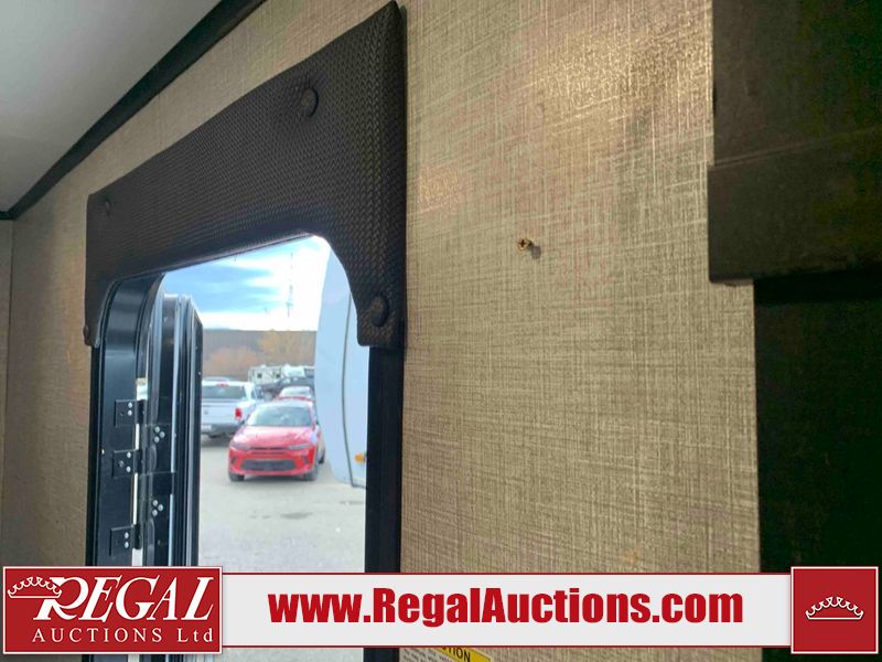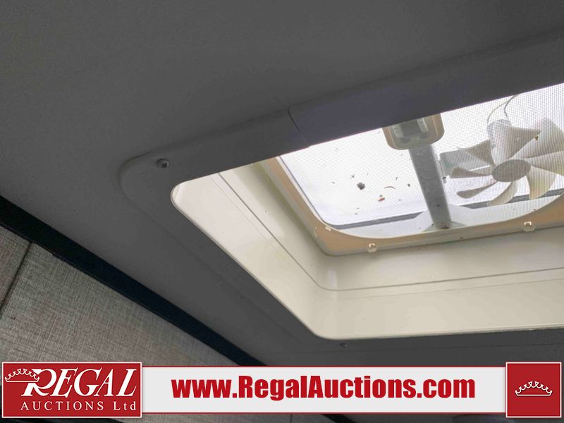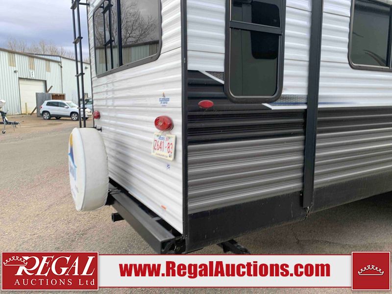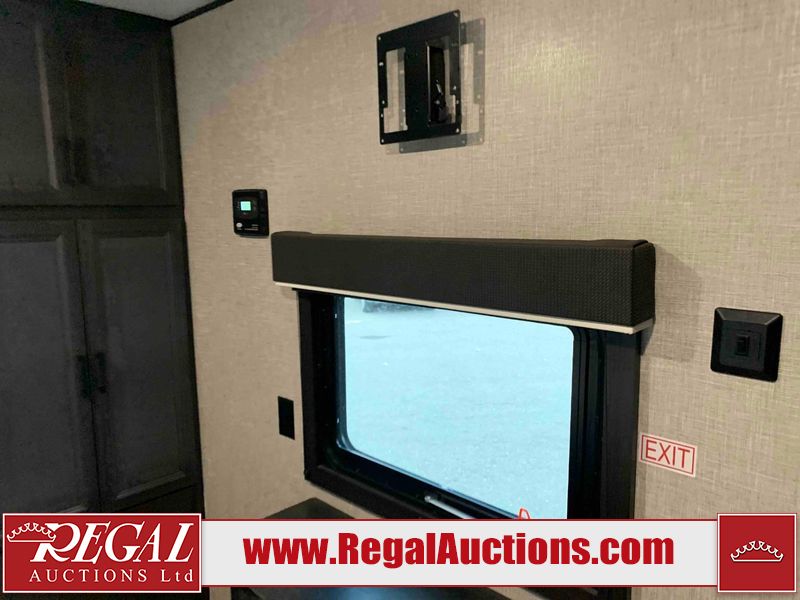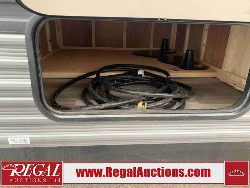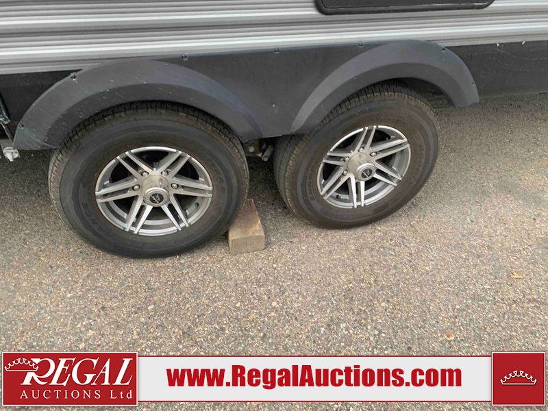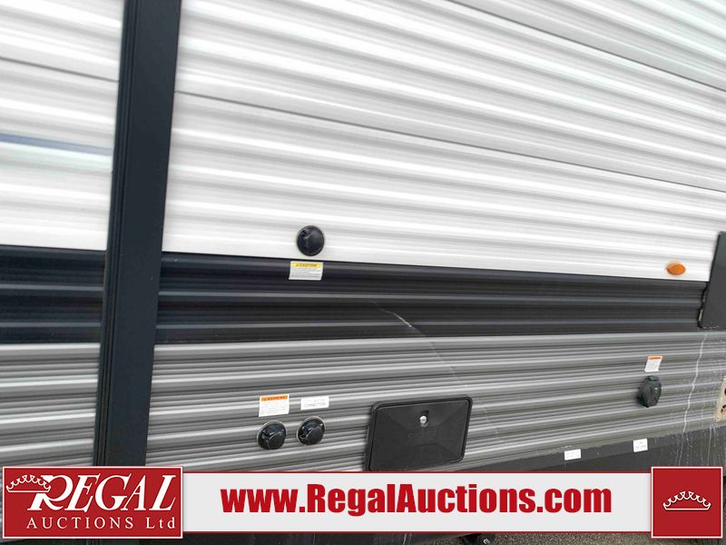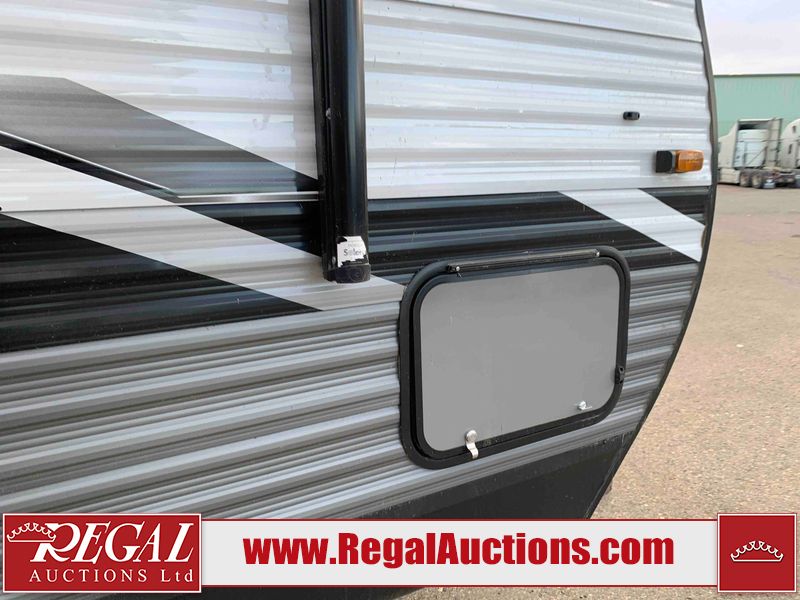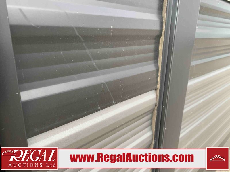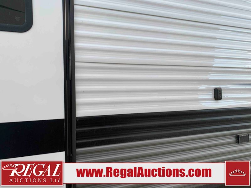 This RV is a 2022J Jayco flight 34RSBS model tandem axle bumper pole trailer. It has a single door entry, roof air, and three slide outs accommodating the master bedroom and the living area. The interior is dirty. Some walls are showing scratches and scuffs. There are drill holes on the right wall. The master bedroom, and bathroom ceiling are showing water damage. The bathroom fan trim is cracked. The right wall is lifting. The living area skylight is separating. Exterior walls are made of soft wall aluminum. Both sidewalls have scratches and scuffs. The left wall is dented. The right wall has hail damage. This unit is equipped with a battery and two propane tanks. The tires are mounted to alloy rims and appear to be in good enough condition for use. This unit is equipped with a microwave, three burner stove top, oven, refrigerator, stereo system, and a television. The layout consists of a master bedroom/bathroom in the front and a kitchenette/dinette in the rear.