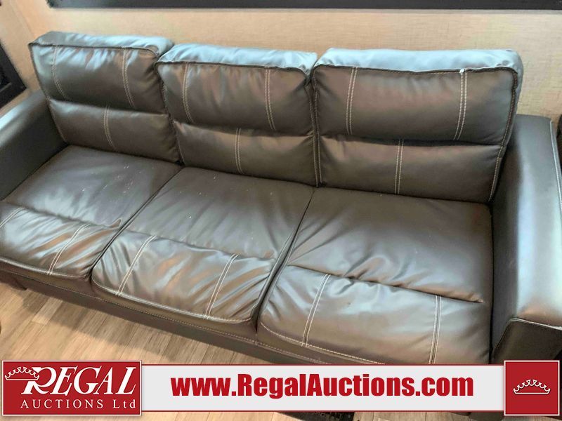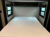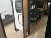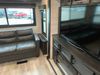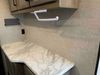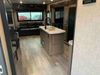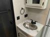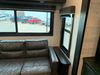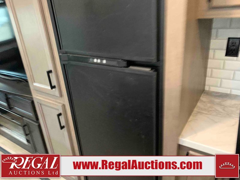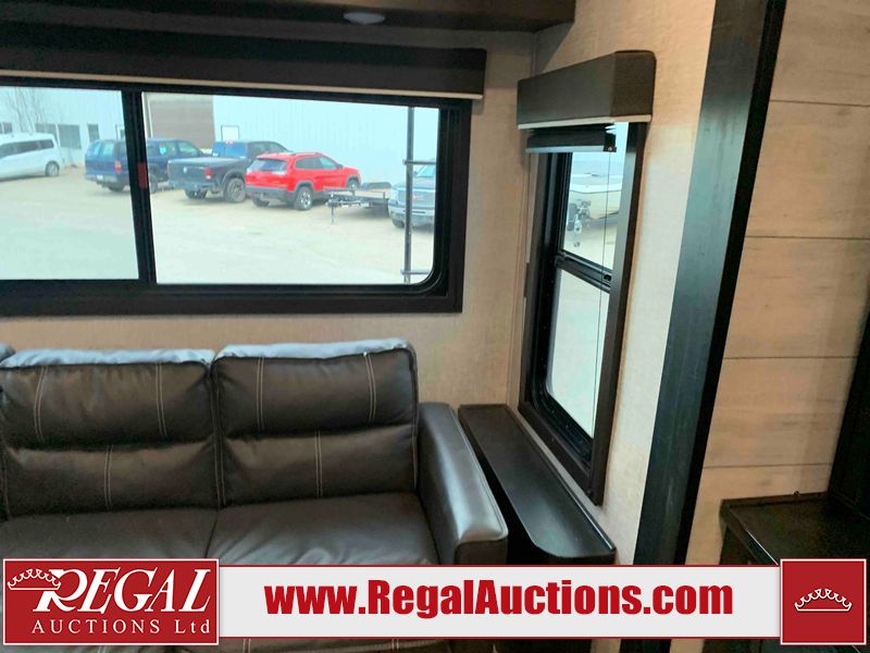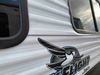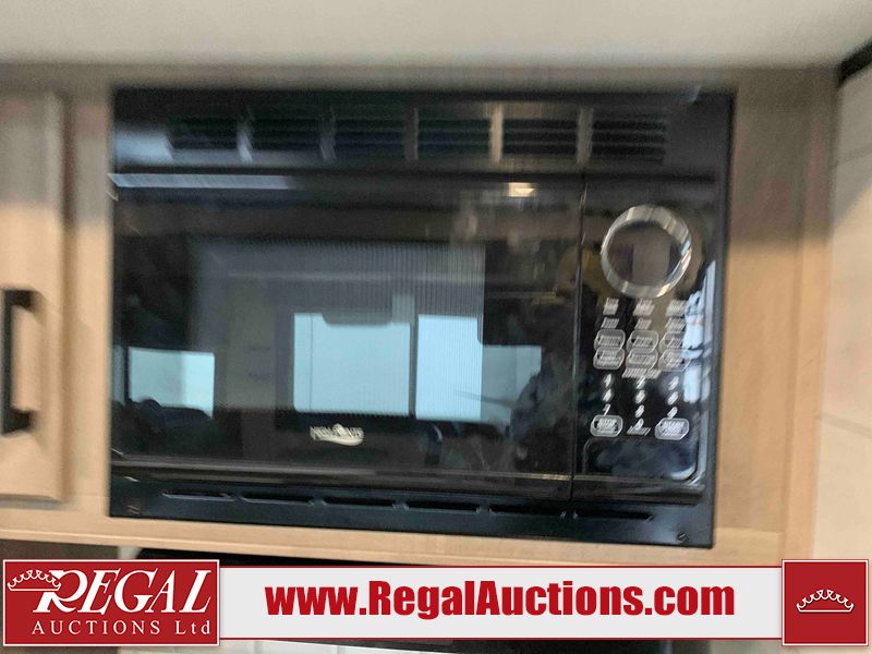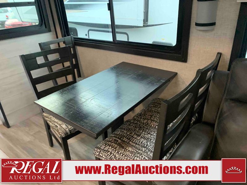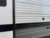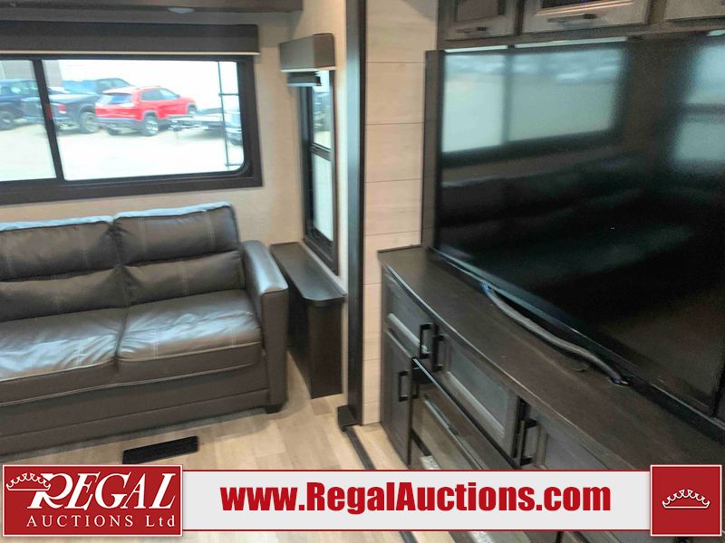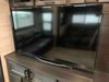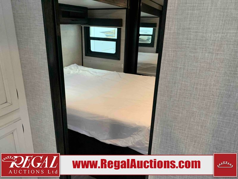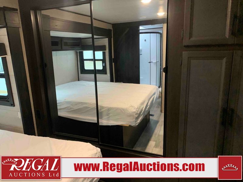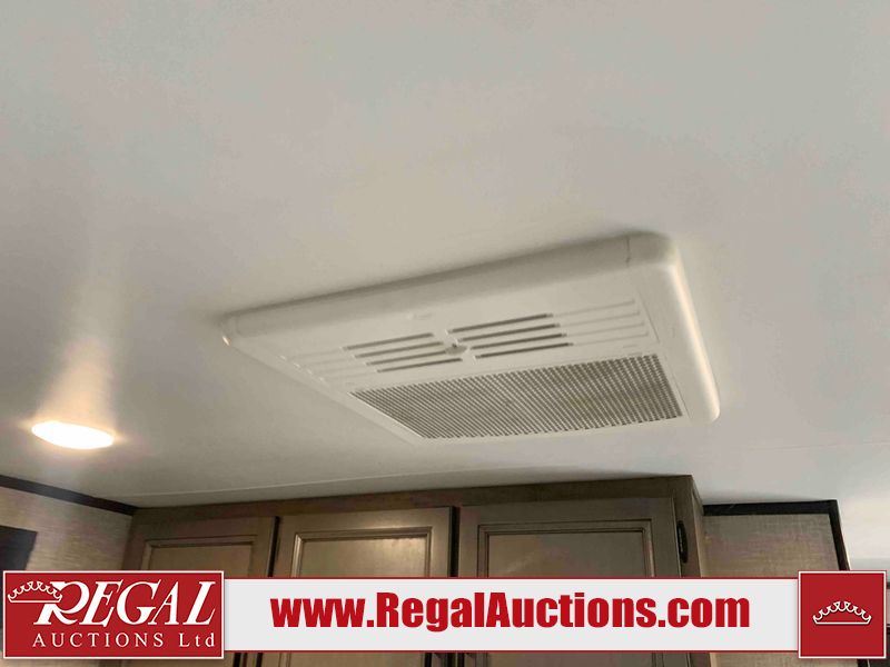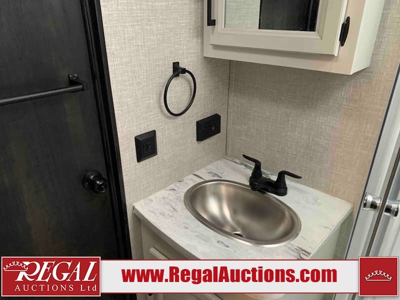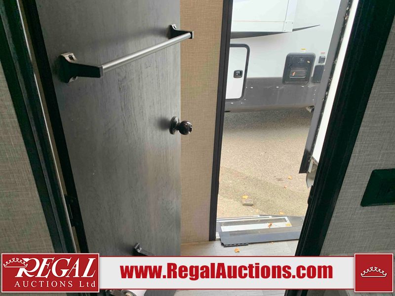 This RV is a 2022J Jayco flight 34RSBS model tandem axle bumper pole trailer. It has a single door entry, roof air, and three slide outs accommodating the master bedroom and the living area. The interior is dirty. Some walls are showing scratches and scuffs. There are drill holes on the right wall. The master bedroom, and bathroom ceiling are showing water damage. The bathroom fan trim is cracked. The right wall is lifting. The living area skylight is separating. Exterior walls are made of soft wall aluminum. Both sidewalls have scratches and scuffs. The left wall is dented. The right wall has hail damage. This unit is equipped with a battery and two propane tanks. The tires are mounted to alloy rims and appear to be in good enough condition for use. This unit is equipped with a microwave, three burner stove top, oven, refrigerator, stereo system, and a television. The layout consists of a master bedroom/bathroom in the front and a kitchenette/dinette in the rear.