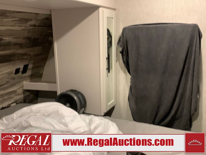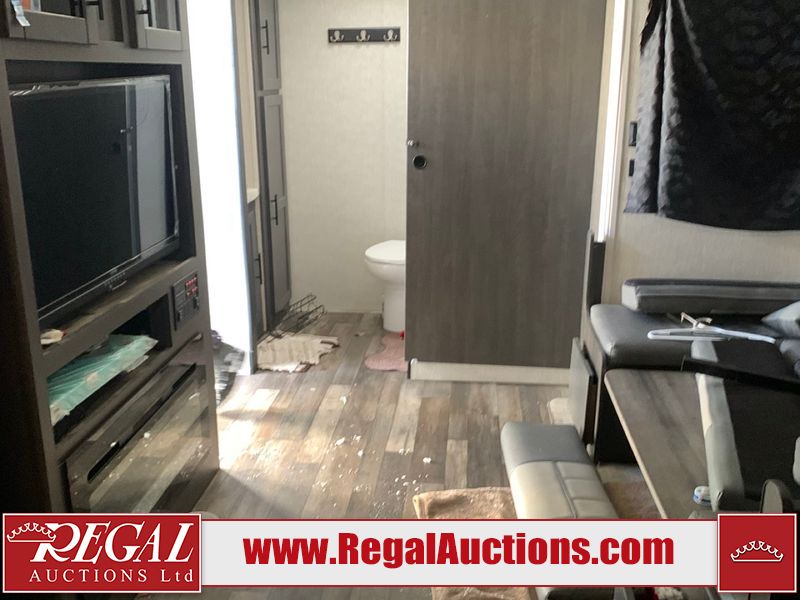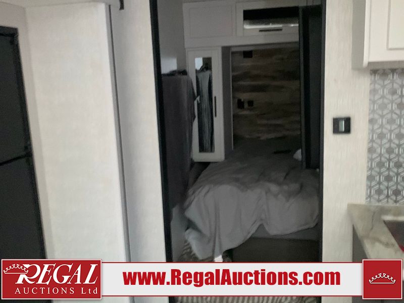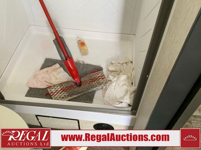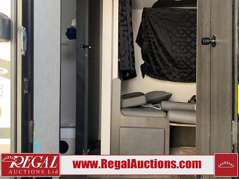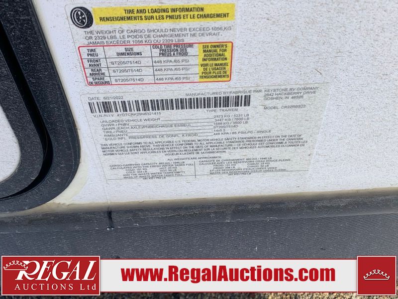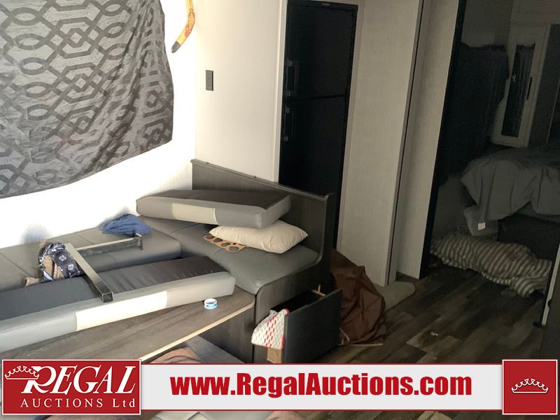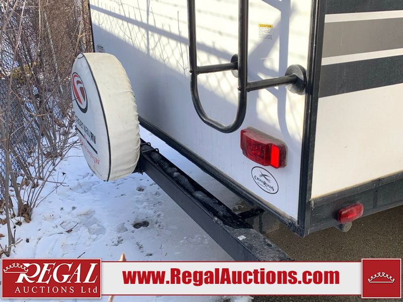 This RV is a 2023 crossroads cruiser series 22 RB model bumper pull travel trailer. This unit has a single entry door, roof air and a single slide out accommodating the living area/kitchen. The interior is dirty and full of personal items. Some of the wooden trim has scratches and scrapes. The exterior walls are made of hard wall fiberglass. The front panel has light. There are scuffs on both side panels. The slide out is operational. Alloy rims are mounted, the tires have plenty of tread remaining. The unit unit unit is equipped with two batteries and two propane tanks. The layout consist of a master bedroom at the front a kitchen/living area at the center and a washroom at the rear. This unit is equipped with a three burner stove top, oven, microwave, refrigerator, and a flatscreen television. It also has a exterior kitchen with a mini refrigerator and a two burner stove top.