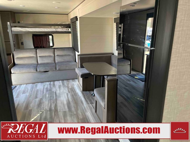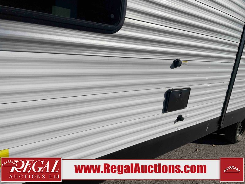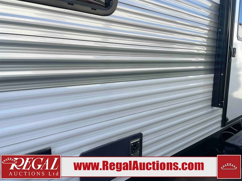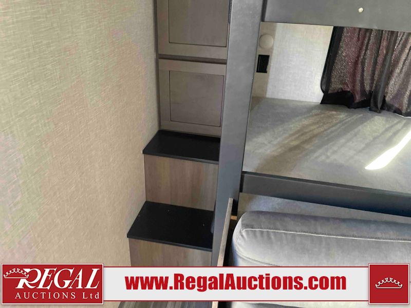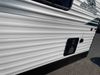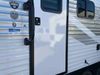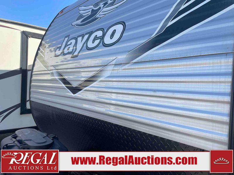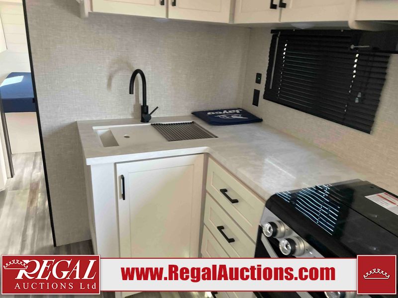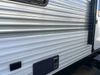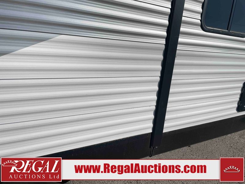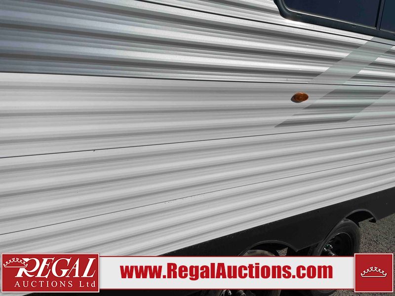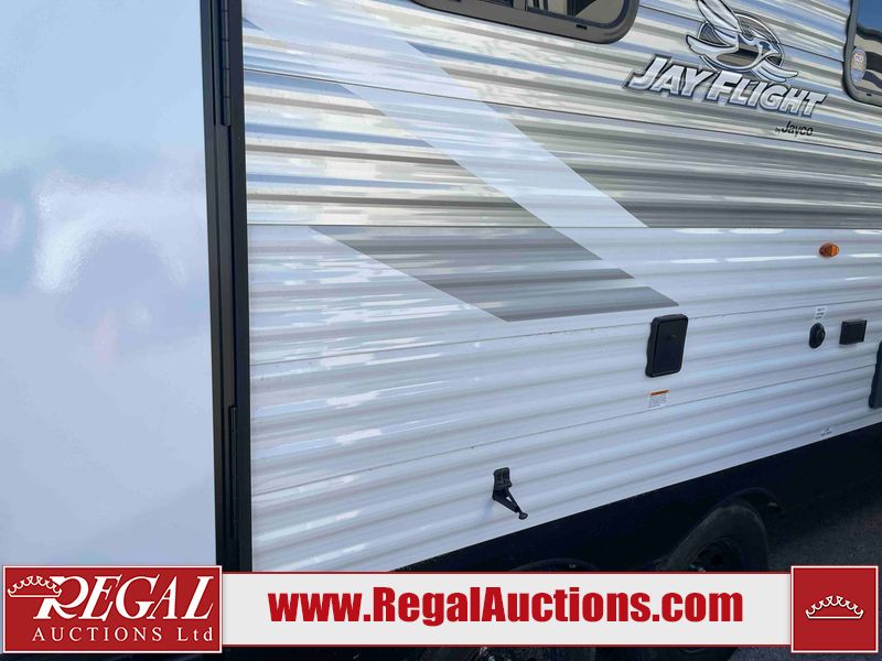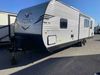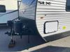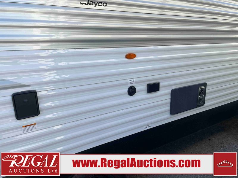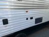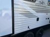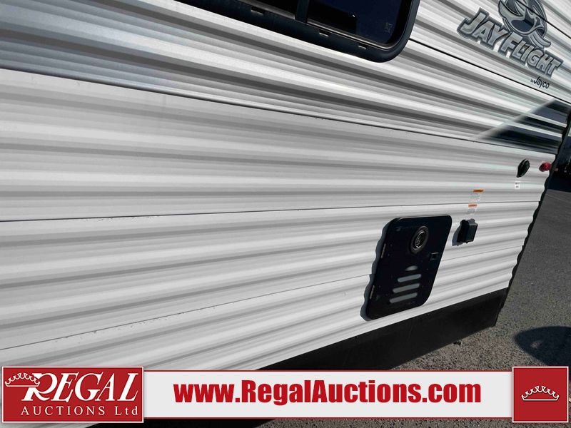This RV is a 2025 Jayco flight 287BHSW model tandem axle bumper pull trailer. It has two entry doors, roof air and a single slide out accommodating the living area. The interior is dirty. Some walls are showing scratches and scuffs. One of the kitchen cabinets is misaligned. Some wallpaper is peeling. The refrigerator wall is warped. The exterior walls are made of soft wall aluminum. All walls have scratches and scuffs. The left side fender trim is separating. The right side wall has some dents. This unit gets power with external power applied. The tires are mounted to alloy rims and appear to be a good enough condition for use. This unit is equipped with two propane tanks, battery, refrigerator, microwave, three burner stove top, oven and a stereo system. The layout consists of a master bedroom/bathroom in the front, kitchenette/dinette in the center and a bunkhouse in the rear.