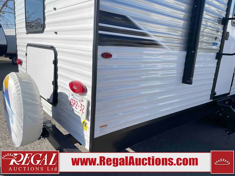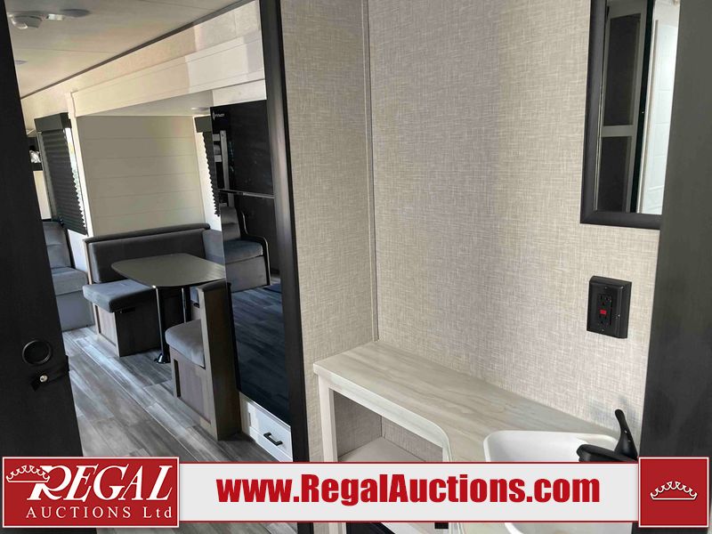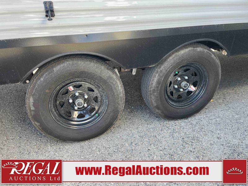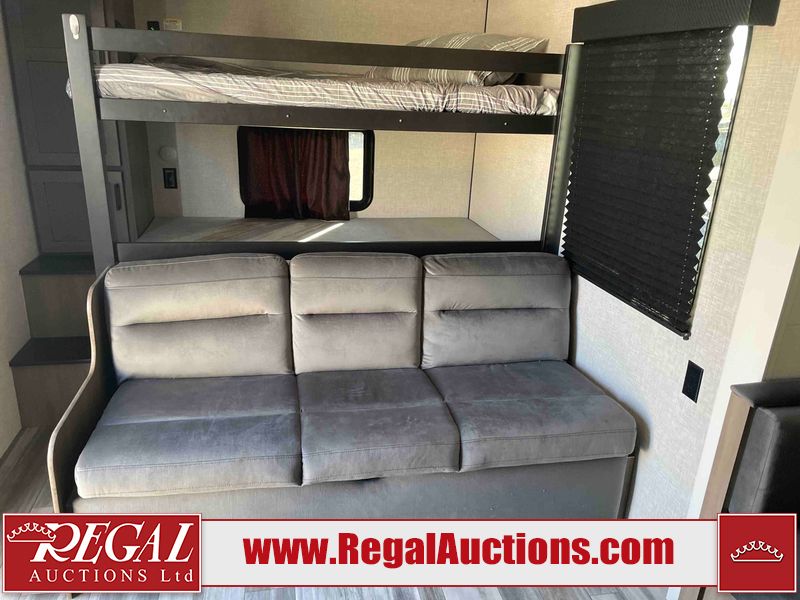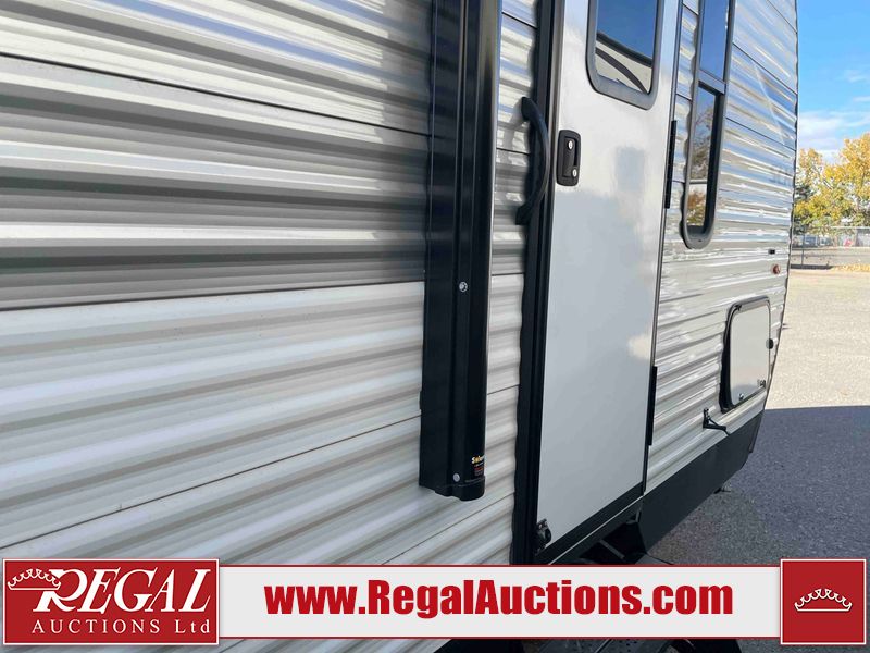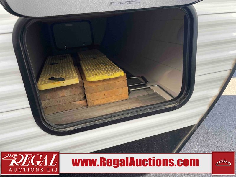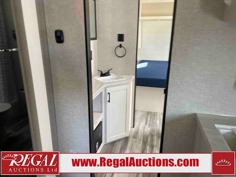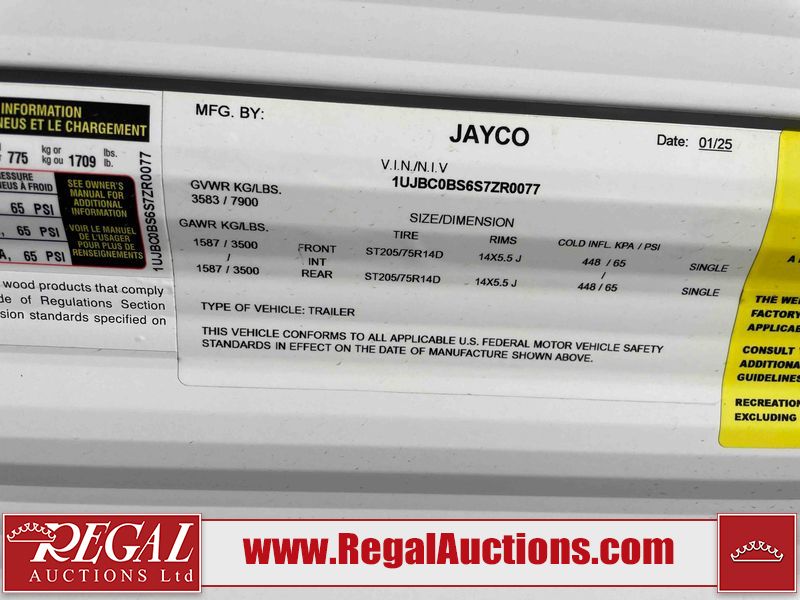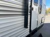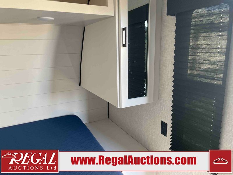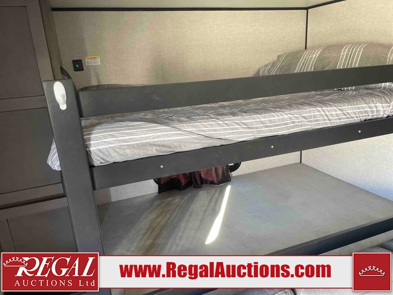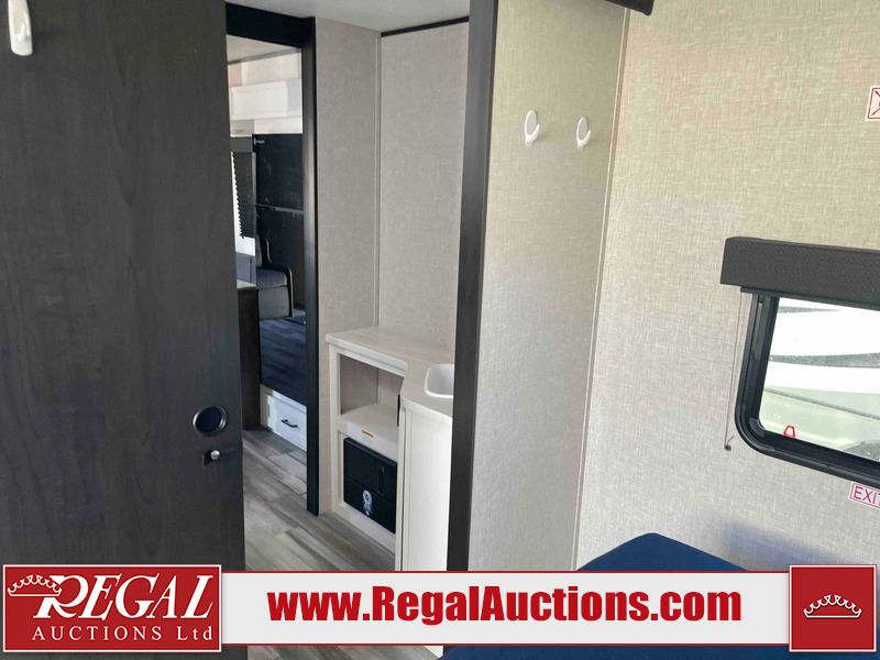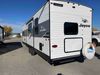 This RV is a 2025 Jayco flight 287BHSW model tandem axle bumper pull trailer. It has two entry doors, roof air and a single slide out accommodating the living area. The interior is dirty. Some walls are showing scratches and scuffs. One of the kitchen cabinets is misaligned. Some wallpaper is peeling. The refrigerator wall is warped. The exterior walls are made of soft wall aluminum. All walls have scratches and scuffs. The left side fender trim is separating. The right side wall has some dents. This unit gets power with external power applied. The tires are mounted to alloy rims and appear to be a good enough condition for use. This unit is equipped with two propane tanks, battery, refrigerator, microwave, three burner stove top, oven and a stereo system. The layout consists of a master bedroom/bathroom in the front, kitchenette/dinette in the center and a bunkhouse in the rear.