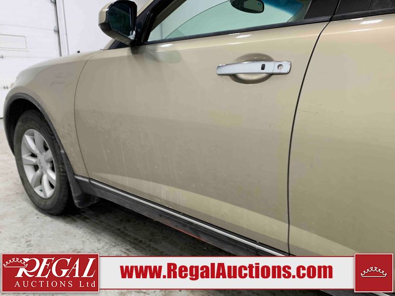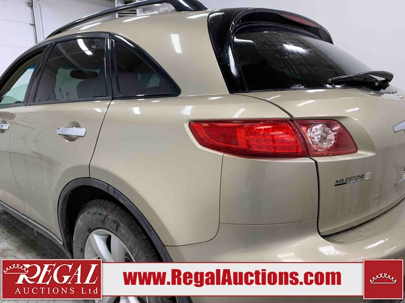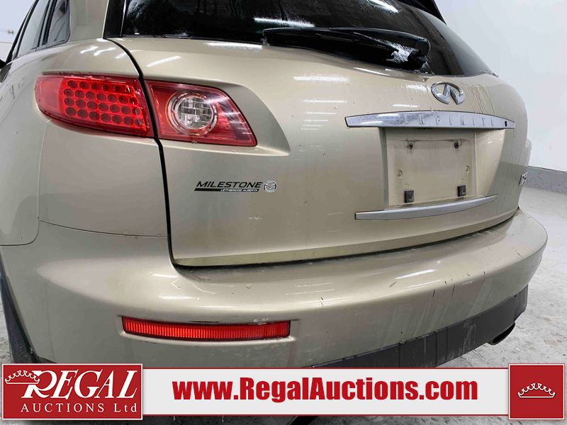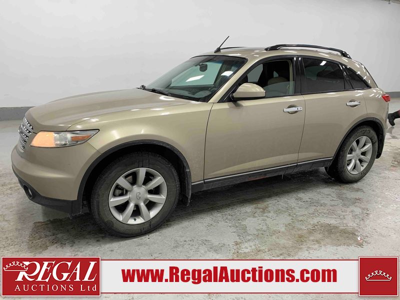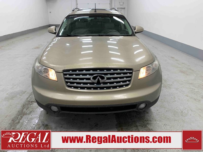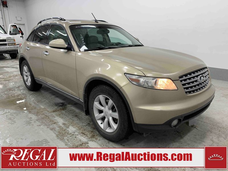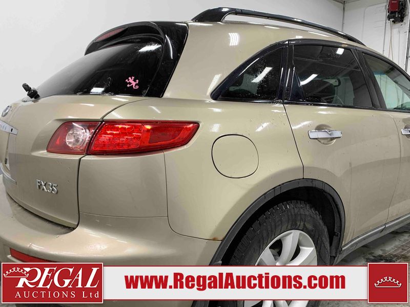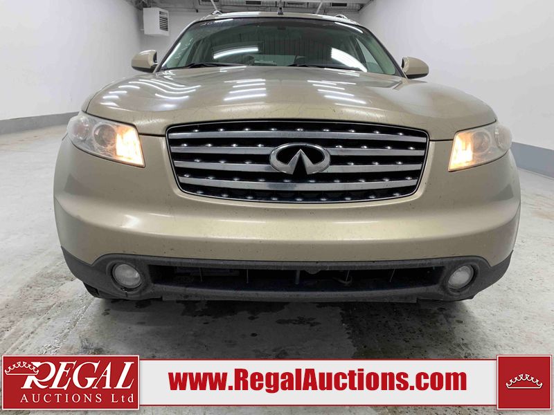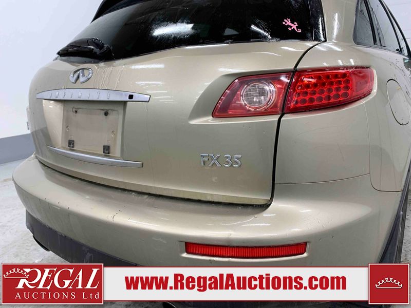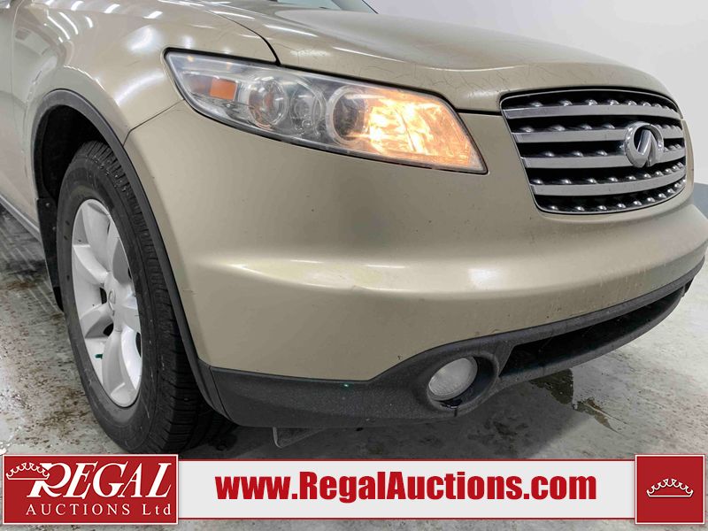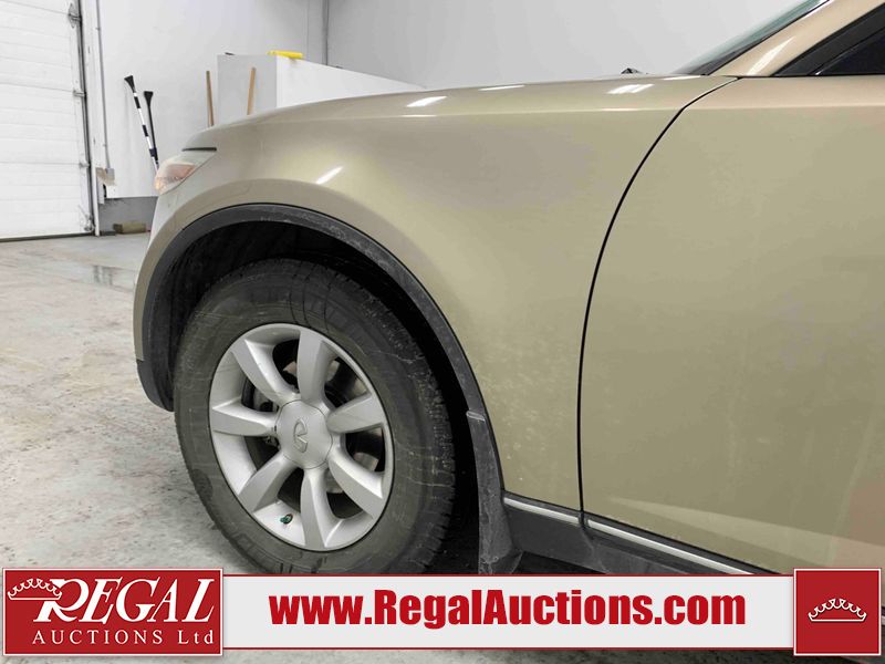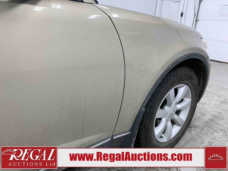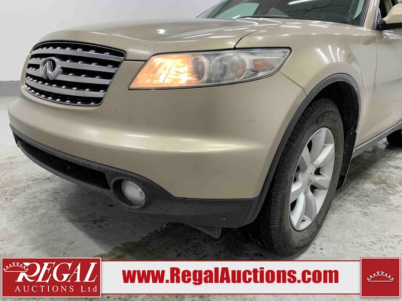 This 2004 INFINITI FX35 4D SPORT UTILITY is powered by a 3.5L V6 gasoline engine and an automatic transmission. It is equipped with all-wheel drive. The SUV has seats for 5 people. The SUV has high mileage for its age. The vehicle has high-value options including a sunroof, leather upholstery, power seats, heated seats, navigation, a backup camera, and a power lift gate. The body looks to be in fair condition overall. There are minimal chips on the front bumper, hood, and rear bumper. There are scratches on the front bumper, rear bumper, and right front fender. There is rust on the right rear fender. There are very minor chips in many areas around the body. There are very minor scratches in many areas around the body. The interior looks to be in fair condition overall. The driver's seat, passenger seat, and rear seats are worn. The doors are dirty. The windshield looks to be in good condition. All of the tires have lots of tread remaining. This SUV is being sold by an automotive broker. Regal Auctions Ltd. makes no guarantee or warranty, either express or implied, with respect to the data provided in this report. The information has been provided from the consignor and from sources generally believed to be reliable, however the accuracy of this information cannot be guaranteed by Regal Auctions.