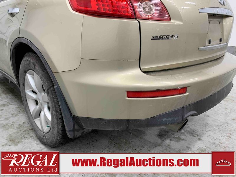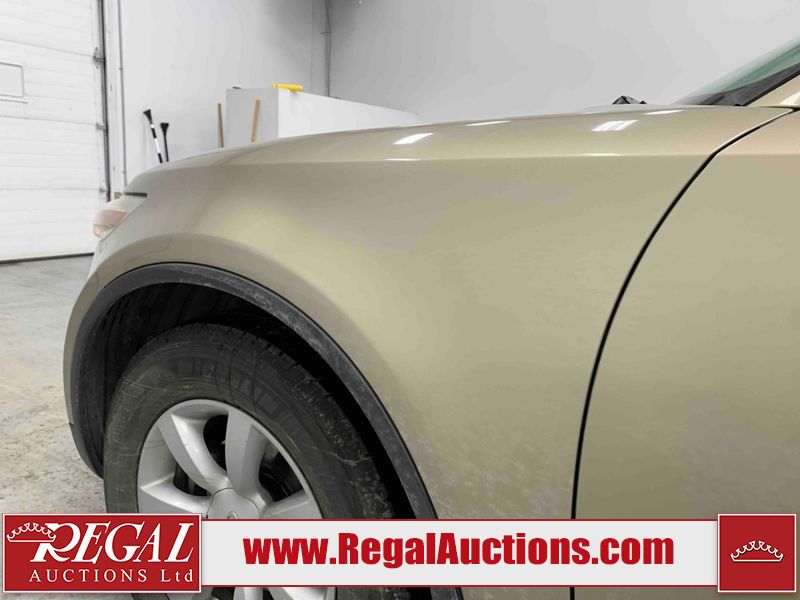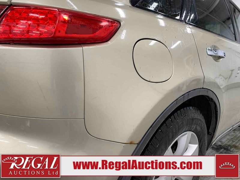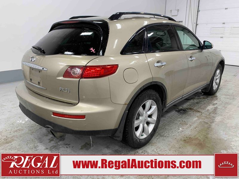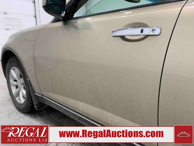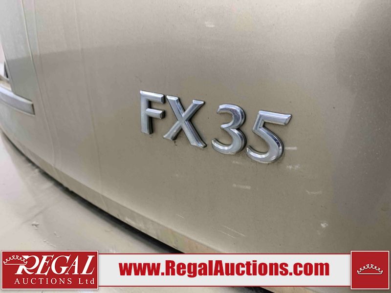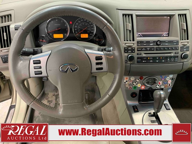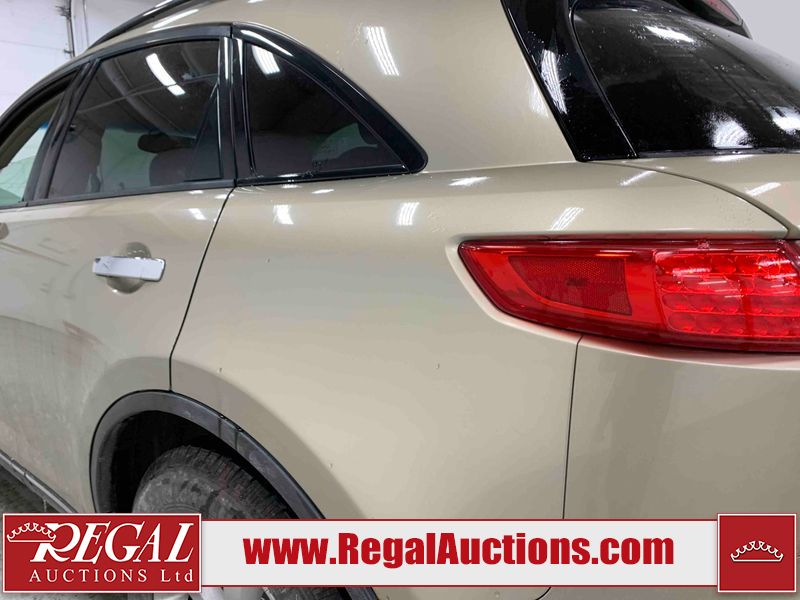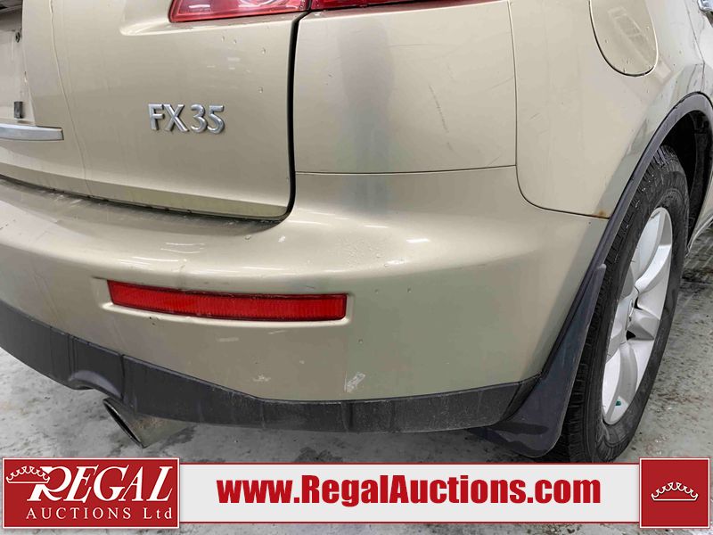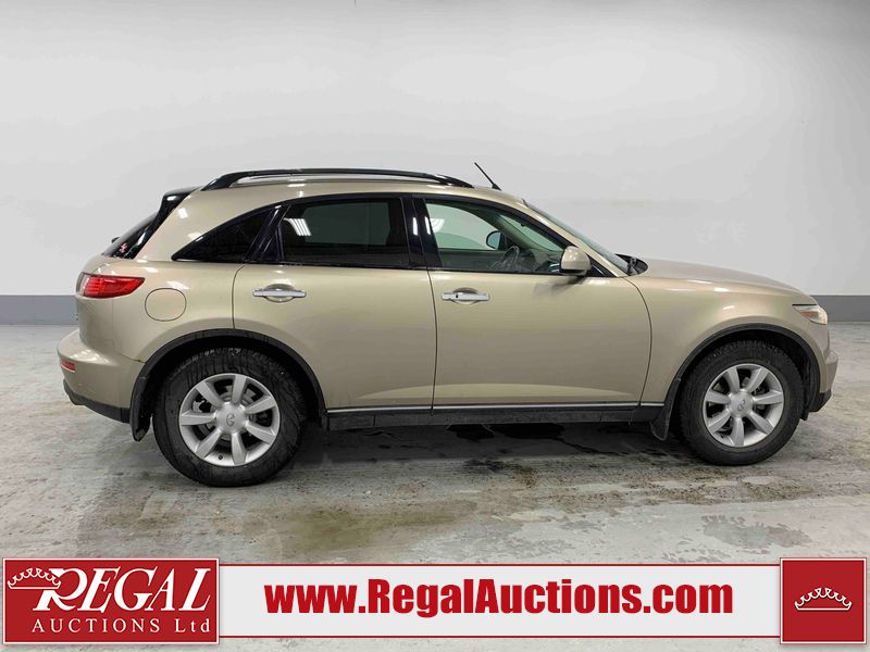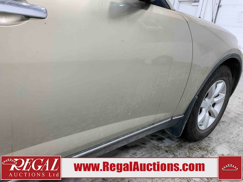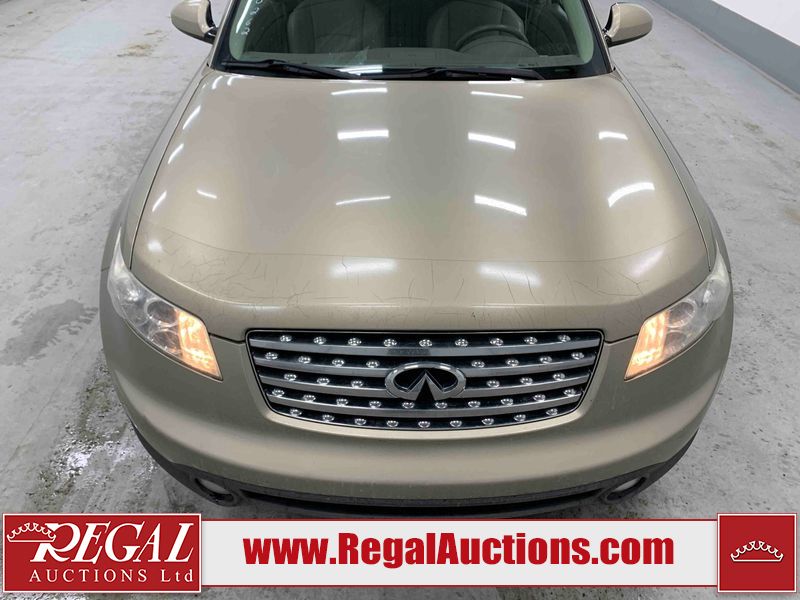 This 2004 INFINITI FX35 4D SPORT UTILITY is powered by a 3.5L V6 gasoline engine and an automatic transmission. It is equipped with all-wheel drive. The SUV has seats for 5 people. The SUV has high mileage for its age. The vehicle has high-value options including a sunroof, leather upholstery, power seats, heated seats, navigation, a backup camera, and a power lift gate. The body looks to be in fair condition overall. There are minimal chips on the front bumper, hood, and rear bumper. There are scratches on the front bumper, rear bumper, and right front fender. There is rust on the right rear fender. There are very minor chips in many areas around the body. There are very minor scratches in many areas around the body. The interior looks to be in fair condition overall. The driver's seat, passenger seat, and rear seats are worn. The doors are dirty. The windshield looks to be in good condition. All of the tires have lots of tread remaining. This SUV is being sold by an automotive broker. Regal Auctions Ltd. makes no guarantee or warranty, either express or implied, with respect to the data provided in this report. The information has been provided from the consignor and from sources generally believed to be reliable, however the accuracy of this information cannot be guaranteed by Regal Auctions.