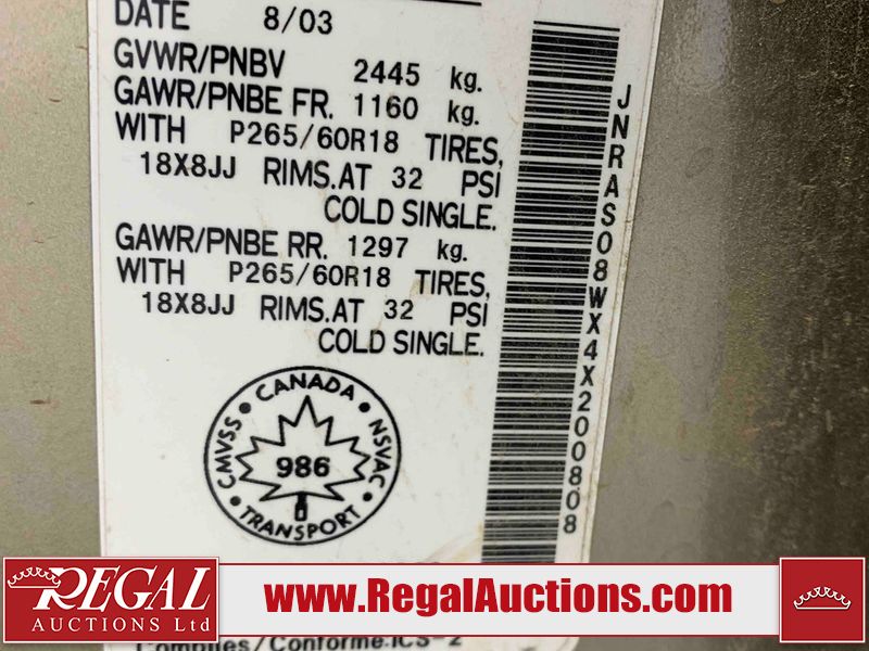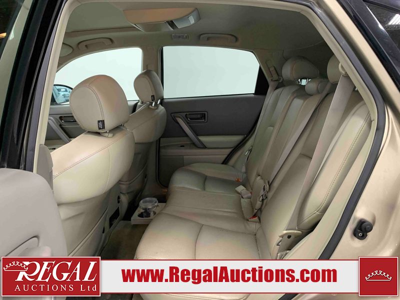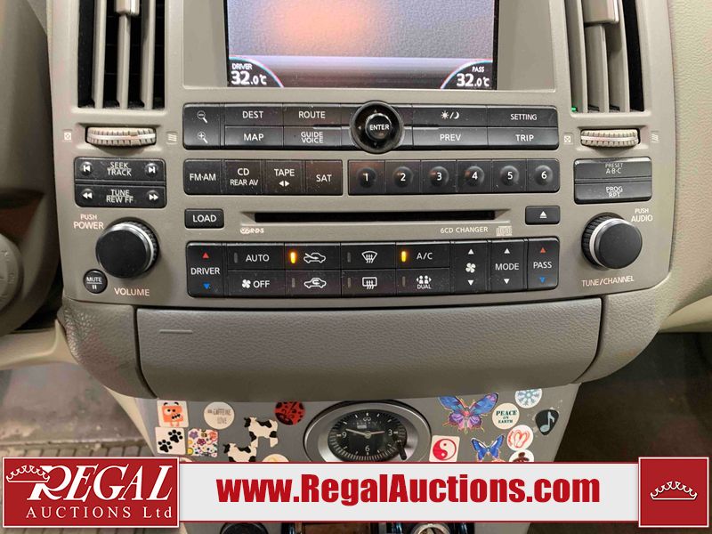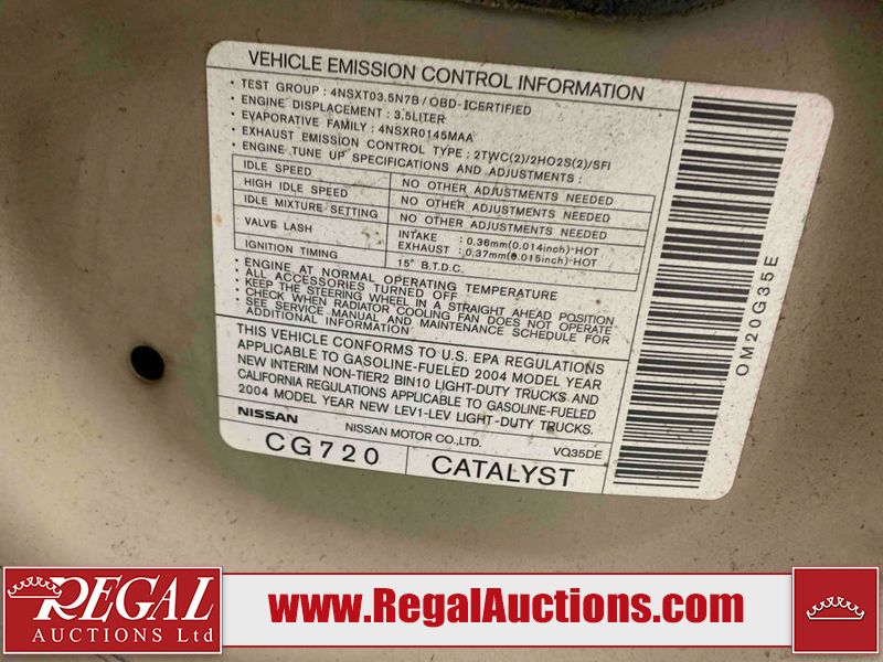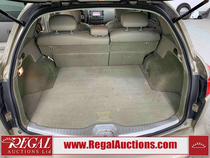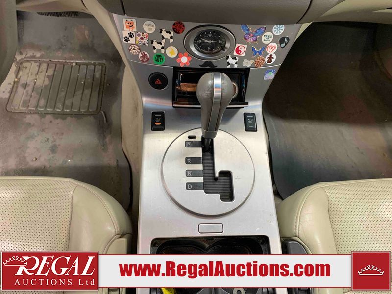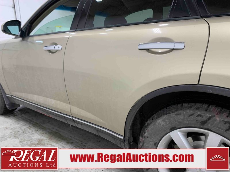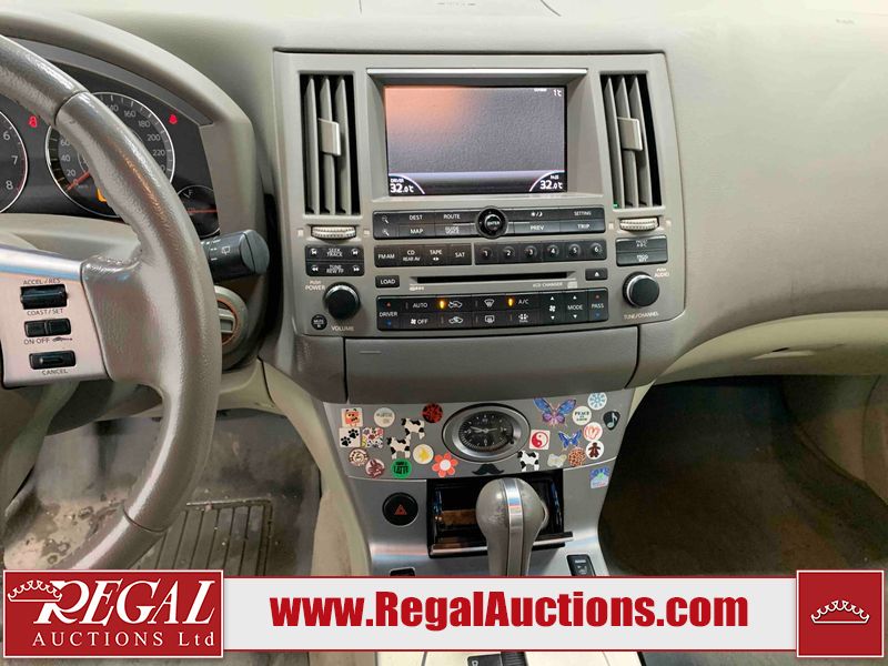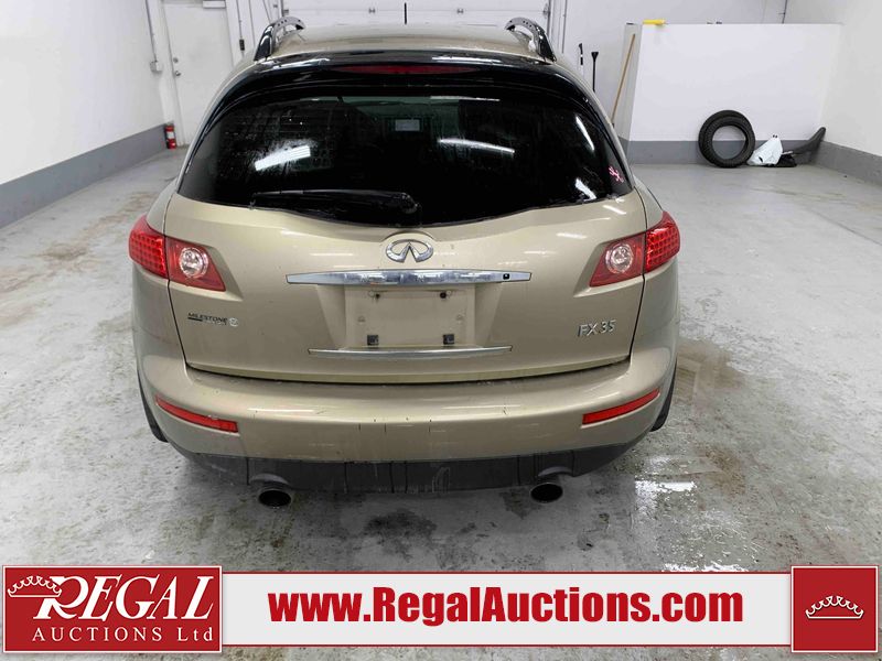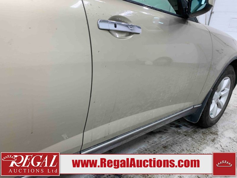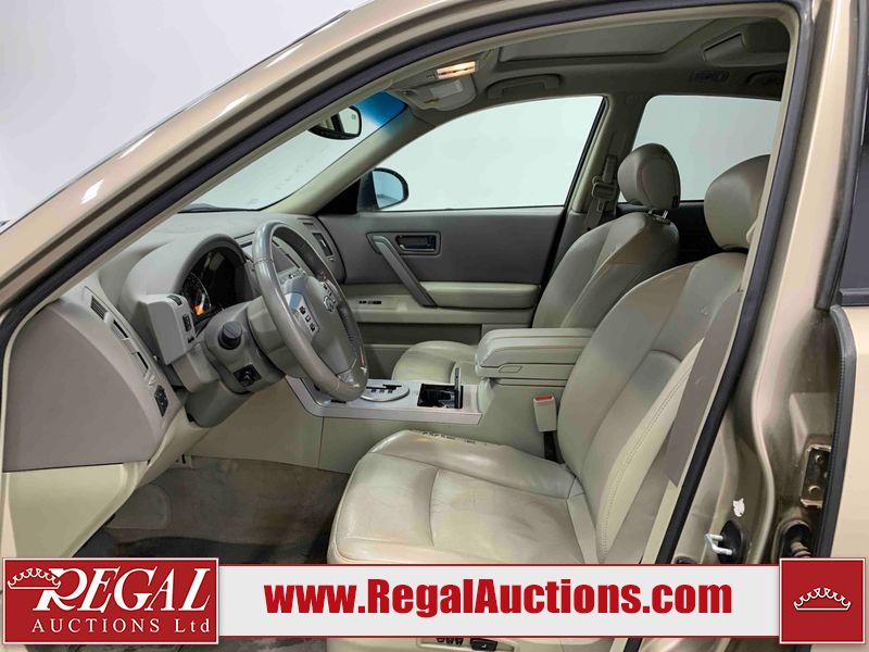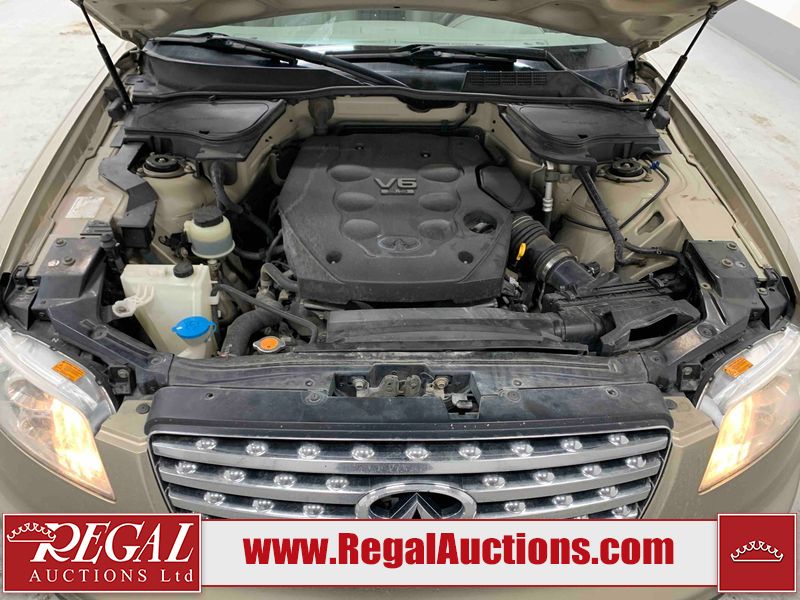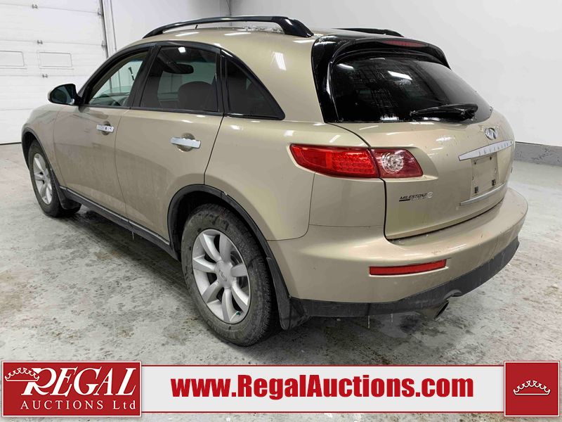 This 2004 INFINITI FX35 4D SPORT UTILITY is powered by a 3.5L V6 gasoline engine and an automatic transmission. It is equipped with all-wheel drive. The SUV has seats for 5 people. The SUV has high mileage for its age. The vehicle has high-value options including a sunroof, leather upholstery, power seats, heated seats, navigation, a backup camera, and a power lift gate. The body looks to be in fair condition overall. There are minimal chips on the front bumper, hood, and rear bumper. There are scratches on the front bumper, rear bumper, and right front fender. There is rust on the right rear fender. There are very minor chips in many areas around the body. There are very minor scratches in many areas around the body. The interior looks to be in fair condition overall. The driver's seat, passenger seat, and rear seats are worn. The doors are dirty. The windshield looks to be in good condition. All of the tires have lots of tread remaining. This SUV is being sold by an automotive broker. Regal Auctions Ltd. makes no guarantee or warranty, either express or implied, with respect to the data provided in this report. The information has been provided from the consignor and from sources generally believed to be reliable, however the accuracy of this information cannot be guaranteed by Regal Auctions.