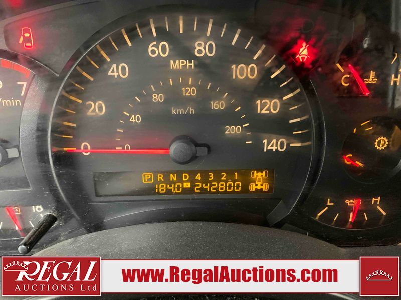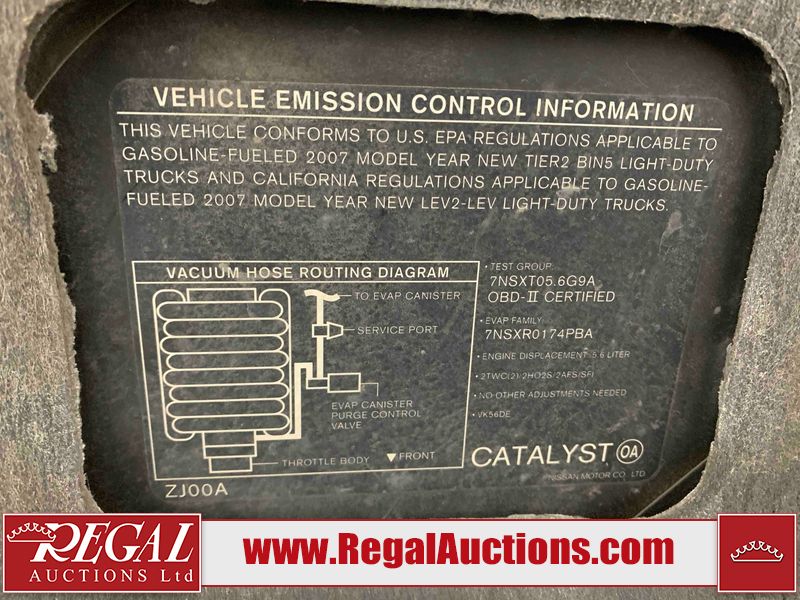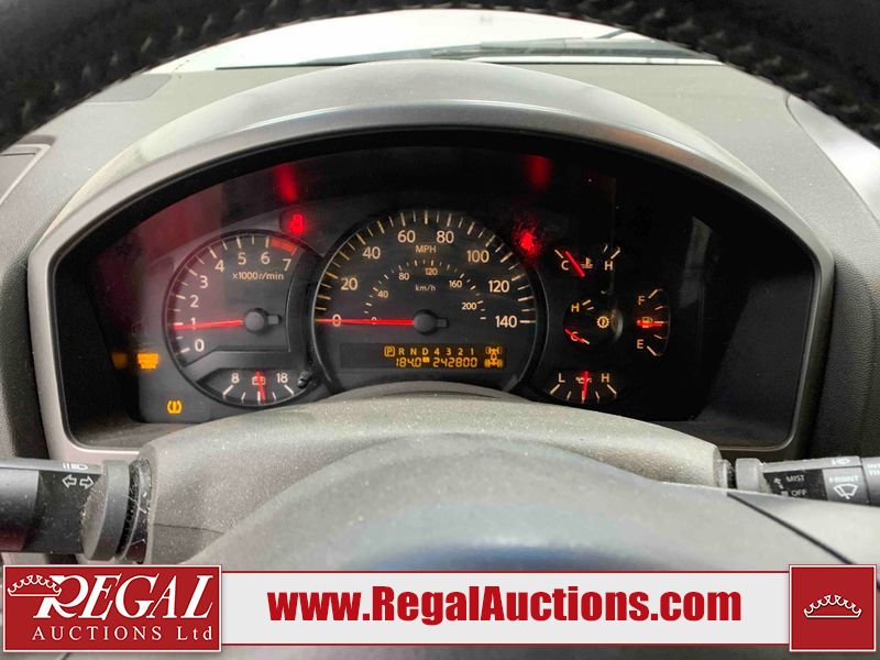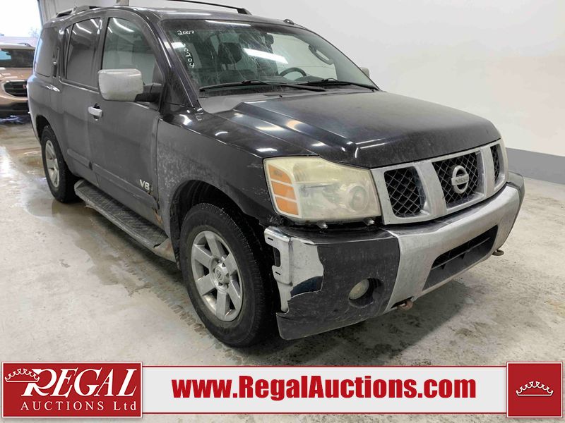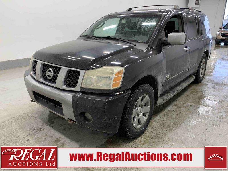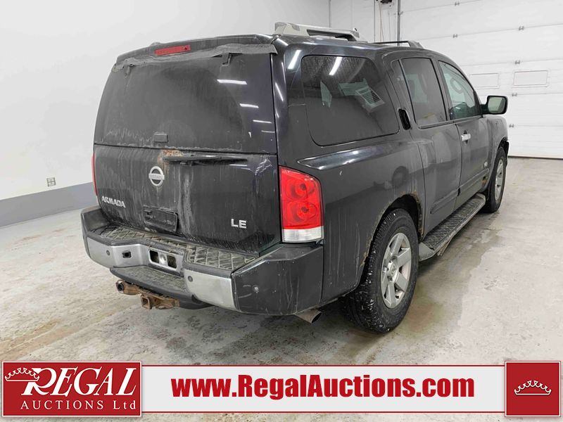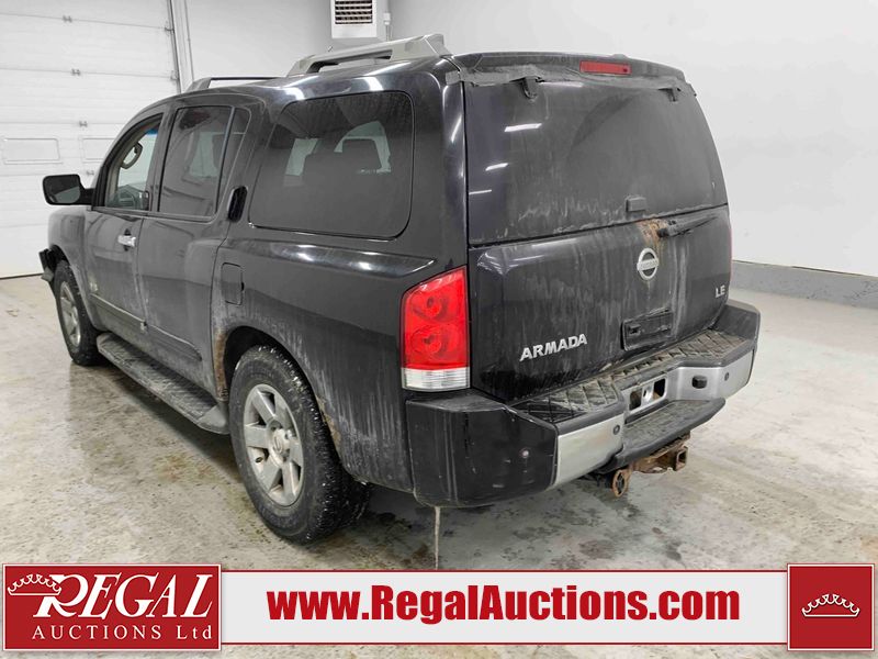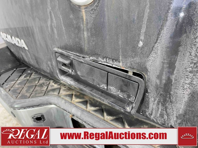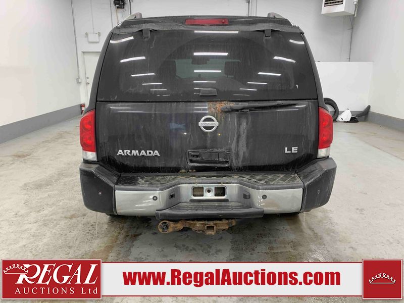 This 2007 NISSAN ARMADA 4D SPORT UTILITY is powered by a 5.6L V8 gasoline engine and an automatic transmission. It is equipped with four-wheel drive. The SUV has seats for 7 people. The SUV has high mileage for its age. The odometer is in miles and its reading, 242,800 miles, translates into 388,480 kilometers. The vehicle has high-value options including a sunroof, leather upholstery, power seats, heated seats, a DVD Player, and a backup camera. The Airbag light is on. The body looks to be in rough condition overall. The front bumper is broken. There is very bad rust on the left rear fender, rear door, right rear fender, and right front door. There is moderate paint fade on the hood. There is pronounced rust on the right front fender. There are slight chips on the hood, left front fender, left front door, left rear door, right rear door, right front door, and right front fender. There is minor rust on the hood, roof, and left front fender. There is incidental dent damage on the roof. There is slight paint fade on the roof. There are minimal scratches on the left front door, left rear door, left rear fender, rear bumper, right rear fender, right rear door, right front door, and right front fender. There are very minor chips on the grille. There are very minor scratches in a few areas around the body. The interior looks to be in fair condition overall. The driver's seat is worn. The doors are dirty. The carpet is dirty. The windshield is cracked. The passenger side front tire is nearly bald and should be replaced. The rest of the tries have lots of tread remaining. This SUV is being sold by a private individual. The vehicle will be sold with the following declarations: Auctioneer Announcement "*SPEEDO IN MILES**REAR DOOR INOPERABLE* *AIRBAG LIGHT FLASHING*" and Odometer in Miles (See Footnote 1). Footnotes: 1) The vehicle's odometer reading is in miles and not kilometers. (1 Mile = 1.6 Kilometers). Regal Auctions Ltd. makes no guarantee or warranty, either express or implied, with respect to the data provided in this report. The information has been provided from the consignor and from sources generally believed to be reliable, however the accuracy of this information cannot be guaranteed by Regal Auctions.