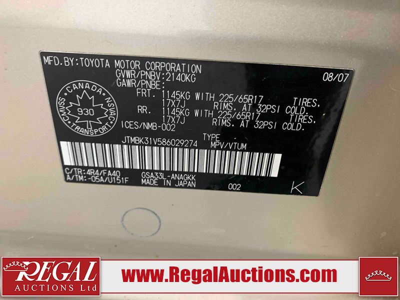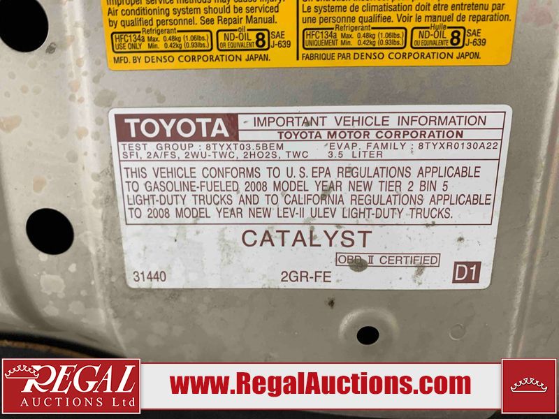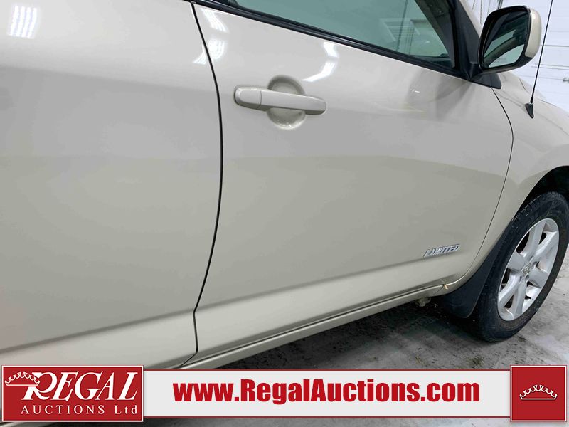 This 2008 TOYOTA RAV4 LTD 4D SPORT UTILITY 4WD is powered by a 3.5L V6 gasoline engine and an automatic transmission. It is equipped with four-wheel drive. The SUV has seats for 5 people. The SUV has low mileage for its age. The vehicle has high-value options including a sunroof and power seats. The body looks to be in fair condition overall. There are slight chips on the front bumper, hood, and roof. There are minor scratches on the front bumper, hood, roof, left front door, left rear door, left rear fender, rear bumper, right rear fender, and right rear door. There is slight rust on the hood. There is minimal dent damage on the left rear door, left rear fender, right rear fender, and right rear door. There are very minor chips in many areas around the body. There are very minor scratches in some areas around the body. The fog lights are broken. The interior looks to be in good condition overall. There are moderate stains on the driver's seat. The windshield is chipped. The tires are all worn. This SUV is being sold by an automotive broker. Regal Auctions Ltd. makes no guarantee or warranty, either express or implied, with respect to the data provided in this report. The information has been provided from the consignor and from sources generally believed to be reliable, however the accuracy of this information cannot be guaranteed by Regal Auctions.