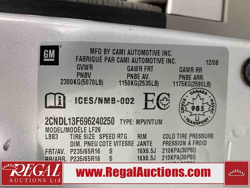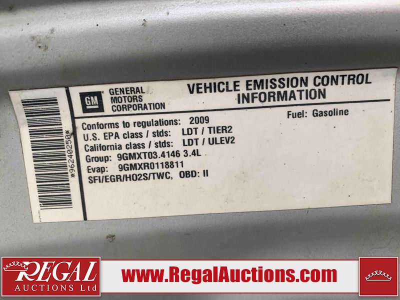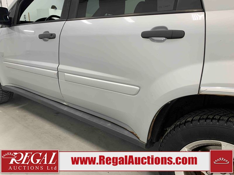 This 2009 CHEVROLET EQUINOX 4D UTILITY FWD is powered by a 3.4L V6 gasoline engine and an automatic transmission. It is a two-wheel drive model. The SUV has seats for 5 people. The mileage is average considering the SUV's age. The Tire Pressure light is on. The body looks to be in rough condition overall. There is very bad dent damage on the rear door. There are minor chips on the front bumper, hood, left front fender, and rear bumper. There are minimal scratches on the front bumper, roof, left front door, left rear door, left rear fender, rear bumper, rear door, right rear door, right front door, and right front fender. There is minor rust on the hood, left front fender, left rear door, left rear fender, and rear door. There is minimal dent damage on the hood, left front fender, left front door, right rear fender, and right rear door. There is paint peeling on the left rear door and rear door. There are very minor chips in many areas around the body. There are very minor scratches in a few areas around the body. The headlight lenses are hazy. The interior looks to be in fair condition overall. The dashboard and doors are worn. The driver's seat, passenger seat, and rear seats are stained. The windshield looks to be in good condition. All of the tires have lots of tread remaining. This SUV is being sold by an automotive broker. The vehicle will be sold with the following declarations: Auctioneer Announcement "*CLIMATE CONTROL DOESNT BLOW HOT AIR* ". Regal Auctions Ltd. makes no guarantee or warranty, either express or implied, with respect to the data provided in this report. The information has been provided from the consignor and from sources generally believed to be reliable, however the accuracy of this information cannot be guaranteed by Regal Auctions.