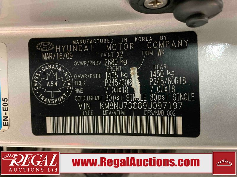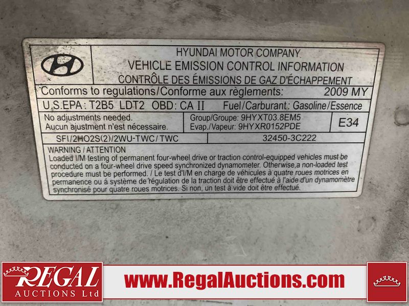 This 2009 HYUNDAI VERACRUZ 4D UTILITY is powered by a 3.8L V6 gasoline engine and an automatic transmission. It is equipped with all-wheel drive. The SUV has seats for 7 people. The SUV has low mileage for its age. The vehicle has high-value options including a sunroof, leather upholstery, power seats, and heated seats. The Airbag light is on. The body looks to be in fair condition overall. There are extensive scratches on the front bumper. There is minor dent damage on the hood. There is rust on the roof. There are scratches on the left rear door, left rear fender, rear bumper, rear door, right rear fender, right rear door, right front door, and right front fender. There are very minor scratches in a few areas around the body. There are very minor chips on the hood. The interior looks to be in fair condition overall. The driver's seat and passenger seat are worn. The passenger seat is torn. The driver side mirror housing is broken. The passenger side front tire is nearly bald and should be replaced. The rest of the tries have lots of tread remaining. This SUV is being sold by an automotive broker. The vehicle will be sold with the following declarations: Claims Total $5000 - $9999 (See Footnote 1), Out of Province - BC (See Footnote 2), and Out of Province - AB OVERRIDE (See Footnote 3). Footnotes: 1) The vehicle's total recorded insurance claims history is between $5,000 - $9,999. This is the amount of money that was paid out by an insurance company for repairs to cover claims against the vehicle's insurance policy. This information is provided by CarFax. 2) The vehicle's last registered jurisdiction is British Columbia. The purchaser must have the vehicle undergo and pass an Out of Province inspection before it can be registered in Alberta. 3) Out of province inspection for registering the vehicle in Alberta has been completed. Regal Auctions Ltd. makes no guarantee or warranty, either express or implied, with respect to the data provided in this report. The information has been provided from the consignor and from sources generally believed to be reliable, however the accuracy of this information cannot be guaranteed by Regal Auctions.