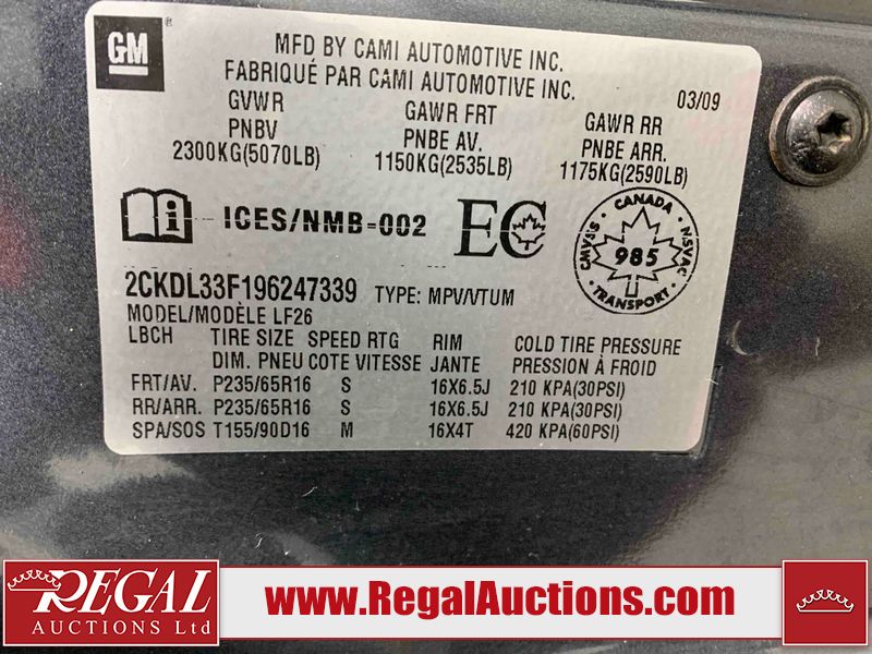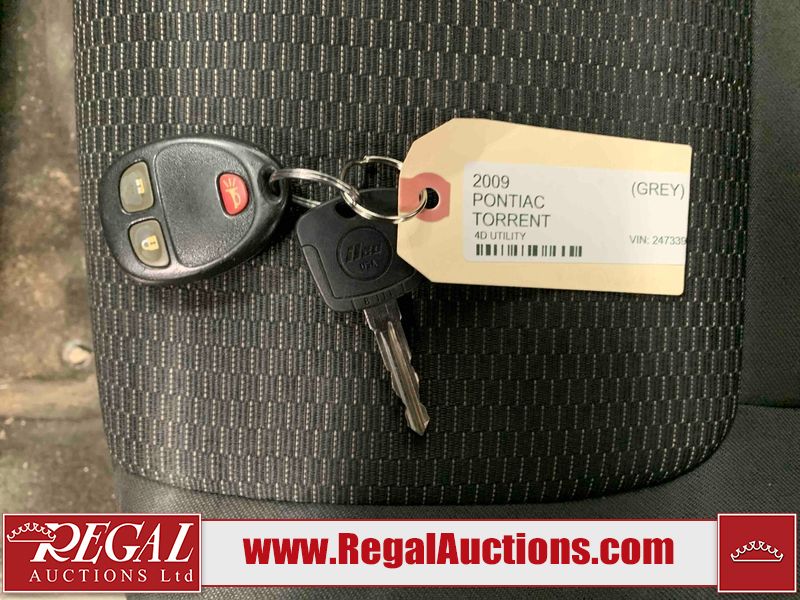 This 2009 PONTIAC TORRENT 4D UTILITY FWD is powered by a 3.4L 6 cylinder gasoline engine and an automatic transmission. It is a two wheel drive model. The SUV has seats for 5 people. The mileage is average considering the SUV's age. The body looks to be in fair condition overall. There are pronounced scratches on the hood. There is moderate rust on the rear door. There are chips on the front bumper, hood, left front fender, left rear door, and right front fender. There is dent damage on the front bumper, hood, and roof. There are scratches on the left front door, left rear door, left rear fender, rear bumper, right rear fender, right rear door, and right front door. There is minor paint peeling on the rear bumper. There are very minor chips in a few areas around the body. There is very minor dent damage on the right front fender. The interior looks to be in good condition overall. The rear seats are torn. The carpet is dirty. The windshield looks to be in good condition. All of the tires have lots of tread remaining. This SUV is being sold by an automotive broker. The vehicle will be sold with the following declarations: Claims Total $5000 - $9999 (See Footnote 1), Out of Province - BC (See Footnote 2), and Out of Province - AB OVERRIDE (See Footnote 3). Footnotes: 1) The vehicle's total recorded insurance claims history is between $5,000 - $9,999. This is the amount of money that was paid out by an insurance company for repairs to cover claims against the vehicle's insurance policy. This information is provided by CarFax. 2) The vehicle's last registered jurisdiction is British Columbia. The purchaser must have the vehicle undergo and pass an Out of Province inspection before it can be registered in Alberta. 3) Out of province inspection for registering the vehicle in Alberta has been completed. Regal Auctions Ltd. makes no guarantee or warranty, either express or implied, with respect to the data provided in this report. The information has been provided from the consignor and from sources generally believed to be reliable, however the accuracy of this information cannot be guaranteed by Regal Auctions.