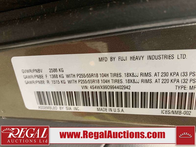 This 2009 SUBARU TRIBECA 4D UTILITY AWD 3.6L is powered by a 0.0 liter 6 cylinder gasoline engine and an automatic transmission. It is equipped with four wheel drive. The SUV has seats for 7 people. The SUV has high mileage for its age. The vehicle has high value options including a sunroof, leather upholstery, power seats, heated seats, a DVD Player, and a backup camera. *CHECK ENGINE LIGHT IS ON* (See Footnote 1) The body looks to be in fair condition overall. There is noteworthy rust on the left rear door and right rear fender. There are slight chips on the front bumper, hood, rear bumper, right rear door, and right front fender. There is minimal dent damage on the left rear door, left rear fender, and right rear fender. There is slight rust on the left rear fender. There are scratches on the rear bumper, right rear door, and right front door. There are scratches in many areas around the body. There are chips in many areas around the body. There is dent damage on the right rear door. The headlight lenses are hazy. The interior looks to be in good condition overall. The windshield is chipped. All of the tires have lots of tread remaining. This SUV is being sold by a franchise dealership. The vehicle will be sold with the following declarations: Dealership Trade-In (See Footnote 2) and Mechanical Problems (See Footnote 1). Footnotes: 1) We've identified some mechanical problems with the vehicle. However, the vehicle has not undergone a mechanical inspection and our findings are not to be considered a complete evaluation of the vehicle's mechanical condition. Review our Buyer Protection Policy to see how Regal Auctions protects you from undisclosed mechanical problems. 2) This vehicle is being sold on behalf of a franchise dealership. Franchise Dealerships are automotive sales companies who are directly connected to an automotive manufacturer like Ford, Tesla, Honda, BMW, or similar. Regal Auctions Ltd. makes no guarantee or warranty, either express or implied, with respect to the data provided in this report. The information has been provided from the consignor and from sources generally believed to be reliable, however the accuracy of this information cannot be guaranteed by Regal Auctions.