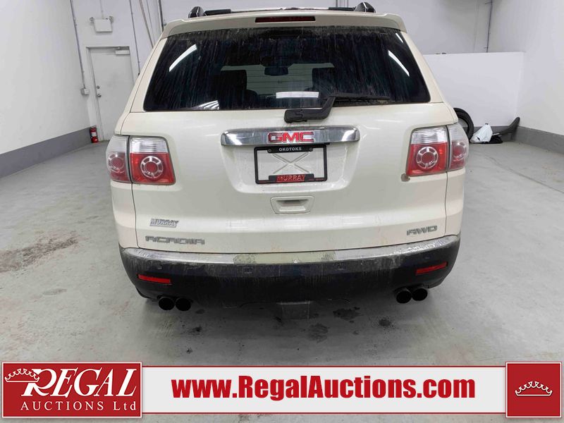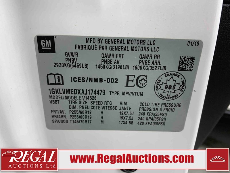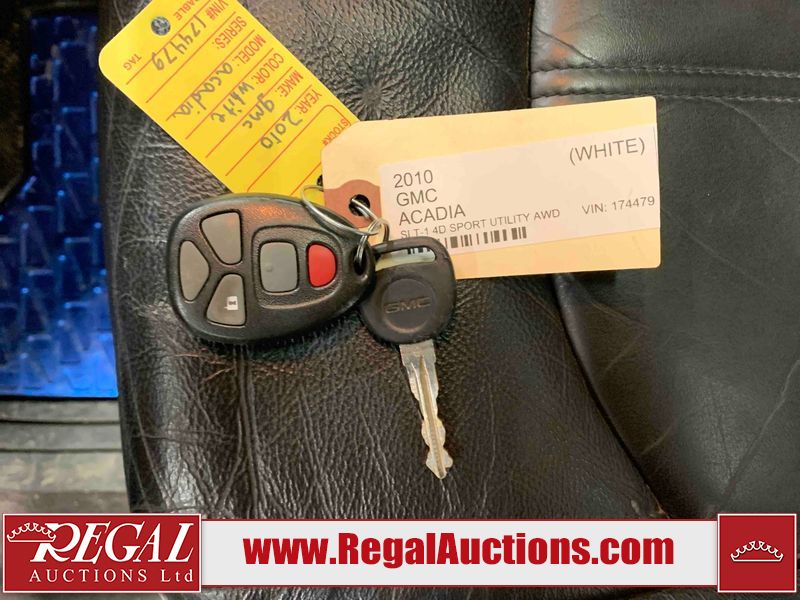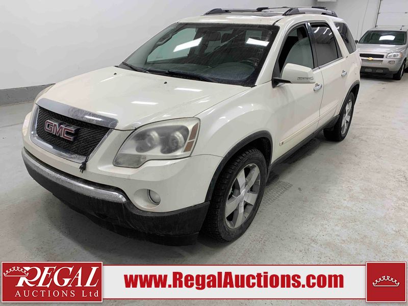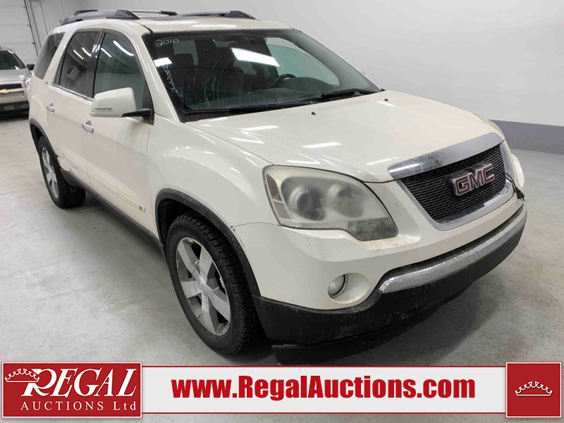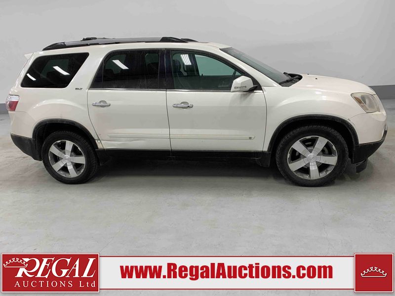 This 2010 GMC ACADIA SLT-1 4D SPORT UTILITY AWD is powered by a 3.6L V6 gasoline engine and an automatic transmission. It is equipped with all-wheel drive. The SUV has seats for 7 people. The SUV has high mileage for its age. The vehicle has high-value options including a sunroof, leather upholstery, power seats, heated seats, a DVD Player, a backup camera, and a power liftgate. The Check Engine and Airbag lights are on. The body looks to be in fair condition overall. There is considerable dent damage on the right rear fender and right rear door. There is a fair amount of dent damage on the left rear fender. There are scratches on the front bumper, left rear fender, rear bumper, right rear fender, right rear door, right front door, and right front fender. There are slight chips on the hood and left rear fender. There is minor rust on the roof, left rear door, and rear door. There are very minor chips in some areas around the body. There are very minor scratches in a few areas around the body. The headlight lenses are hazy. The chrome on the front and rear bumpers is peeling. The interior looks to be in good condition overall. The windshield is cracked. All of the tires have lots of tread remaining. This SUV is being sold by an automotive broker. Regal Auctions Ltd. makes no guarantee or warranty, either express or implied, with respect to the data provided in this report. The information has been provided from the consignor and from sources generally believed to be reliable, however the accuracy of this information cannot be guaranteed by Regal Auctions.