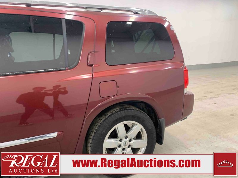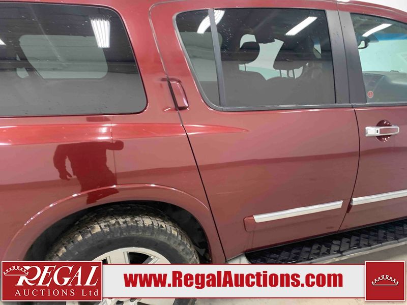 This 2010 NISSAN ARMADA SE 4D UTILITY 4WD 5.6L is powered by a 8 cylinder gasoline engine and an automatic transmission. It is equipped with four wheel drive. The SUV has seats for 7 people. The mileage is average considering the SUV's age. The vehicle has high value options including a sunroof, leather upholstery, power seats, heated seats, a DVD Player, navigation, a backup camera, and a power lift gate. The rear door does not open. The body looks to be in fair condition overall. There are chips on the front bumper, hood, roof, left front fender, left front door, left rear door, rear bumper, and right front fender. There are slight scratches on the front bumper, left front fender, left rear door, left rear fender, rear bumper, rear door, right rear fender, right rear door, and right front door. There is incidental rust on the hood and roof. There are very minor chips in many areas around the body. There are very minor scratches in a few areas around the body. The headlight lenses are hazy. The interior looks to be in good condition overall. The windshield is cracked. The unit rear window is detached, held by duct tape. All of the tires are nearly bald and should be replaced.