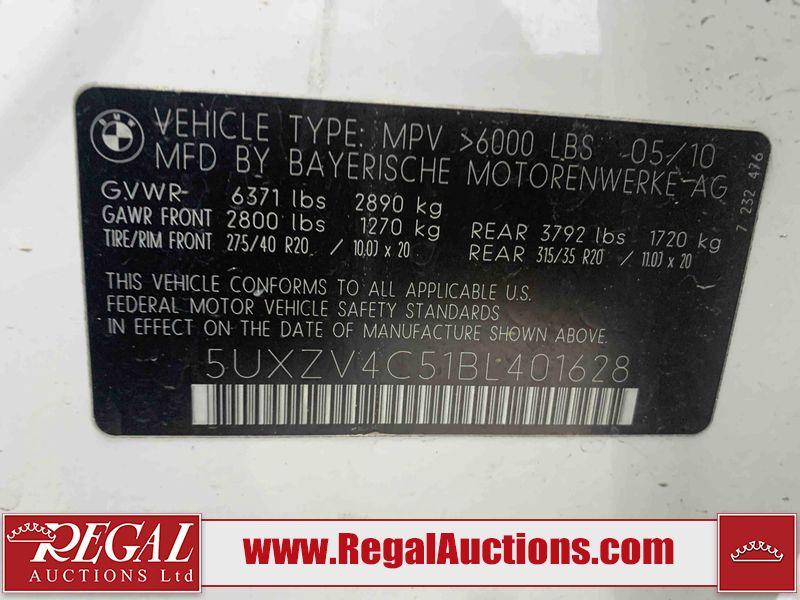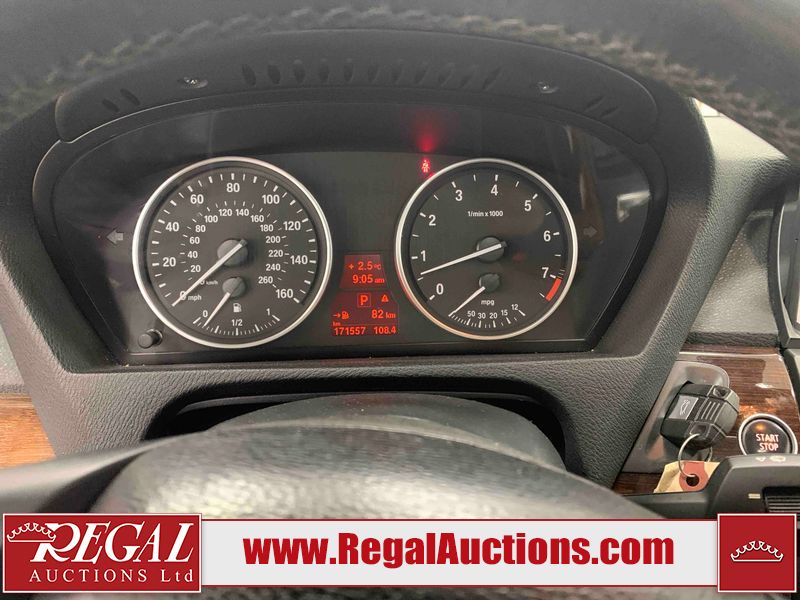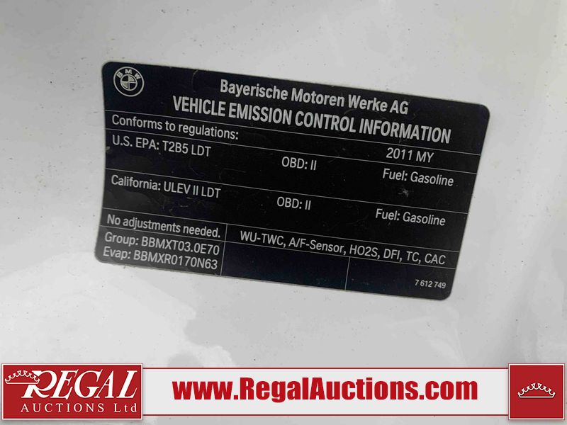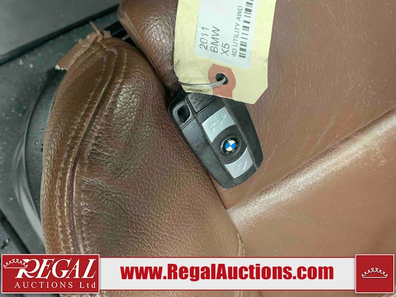 This 2011 BMW X5 4D UTILITY AWD is powered by a 3.0L V6 gasoline engine and an automatic transmission. It is equipped with all-wheel drive. The SUV has seats for 7 people. The SUV has low mileage for its age. The vehicle has high-value options including a sunroof, leather upholstery, power seats, and a backup camera. The Stability Control light is on. The body looks to be in fair condition overall. There are scratches on the front bumper, hood, left front fender, left front door, rear bumper, and right rear fender. There are chips on the front bumper and rear bumper. There is slight dent damage on the right rear door. There are very minor chips in many areas around the body. There is very minor dent damage on the roof. There are very minor scratches in many areas around the body. The interior looks to be in fair condition overall. The driver's seat, passenger seat, and rear seats are worn. The windshield is chipped. All of the tires have lots of tread remaining. This SUV is being sold by an automotive broker. The vehicle will be sold with the following declarations: Out of Province - BC (See Footnote 1) and Out of Province - AB OVERRIDE (See Footnote 2). Footnotes: 1) The vehicle's last registered jurisdiction is British Columbia. The purchaser must have the vehicle undergo and pass an Out of Province inspection before it can be registered in Alberta. 2) Out of province inspection for registering the vehicle in Alberta has been completed. Regal Auctions Ltd. makes no guarantee or warranty, either express or implied, with respect to the data provided in this report. The information has been provided from the consignor and from sources generally believed to be reliable, however the accuracy of this information cannot be guaranteed by Regal Auctions.
