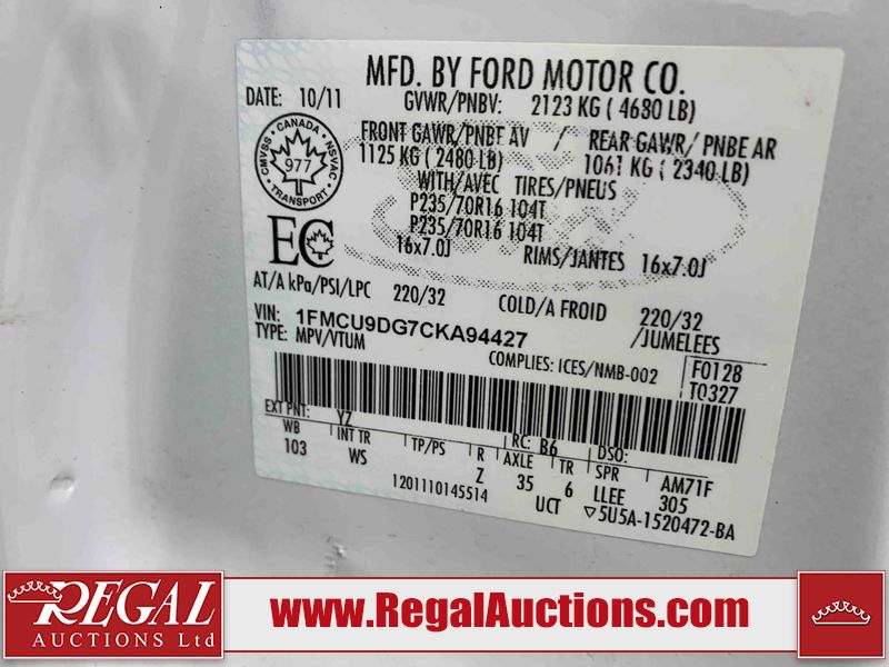 This 2012 FORD ESCAPE 4D UTILITY is powered by a 3.0L V6 gasoline engine and an automatic transmission. It is a two-wheel drive model. The SUV has seats for 5 people. The SUV has high mileage for its age. The Tire Pressure light is on. The body looks to be in rough condition overall. There is extensive rust on the right rear fender. There is some rust on the hood, left rear fender, and rear door. There is moderate paint peeling on the left front fender and right front fender. There are chips on the front bumper, grille, hood, roof, left front fender, left front door, left rear door, left rear fender, rear bumper, rear door, right rear fender, right rear door, right front door, and right front fender. There are scratches on the front bumper, hood, roof, left front fender, left rear fender, rear bumper, rear door, right rear fender, right rear door, right front door, and right front fender. There is slight hail on the hood and roof. There is rust on the roof and right rear door. There is paint peeling on the left rear fender and rear door. There are very minor scratches in a few areas around the body. The headlight lenses are hazy. The front bumper is misaligned. The interior looks to be in good condition overall. The windshield looks to be in good condition. All of the tires have lots of tread remaining. This SUV is being sold by a franchise dealership. The vehicle will be sold with the following declarations: Dealership Trade-In (See Footnote 1), Hail Damage (See Footnote 2), and Out of Province - BC (See Footnote 3). Footnotes: 1) This vehicle is being sold on behalf of a franchise dealership. Franchise Dealerships are automotive sales companies who are directly connected to an automotive manufacturer like Ford, Tesla, Honda, BMW, or similar. 2) This vehicle shows signs of damage from a hail storm. Hail damage is not always clearly visible in photographs. 3) The vehicle's last registered jurisdiction is British Columbia. The purchaser must have the vehicle undergo and pass an Out of Province inspection before it can be registered in Alberta. Regal Auctions Ltd. makes no guarantee or warranty, either express or implied, with respect to the data provided in this report. The information has been provided from the consignor and from sources generally believed to be reliable, however the accuracy of this information cannot be guaranteed by Regal Auctions.