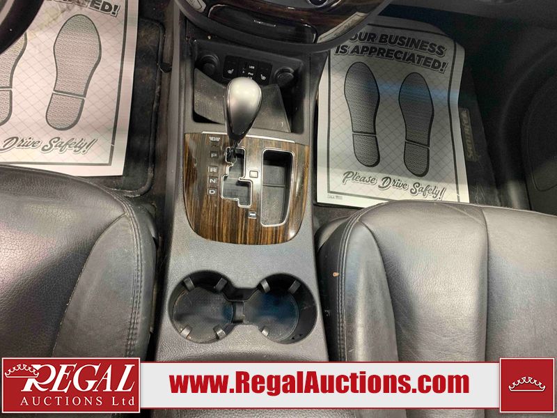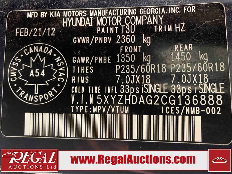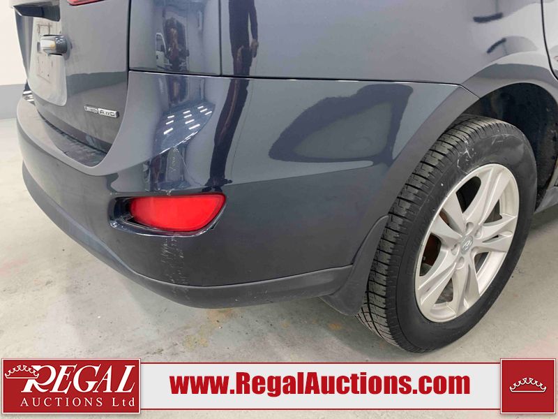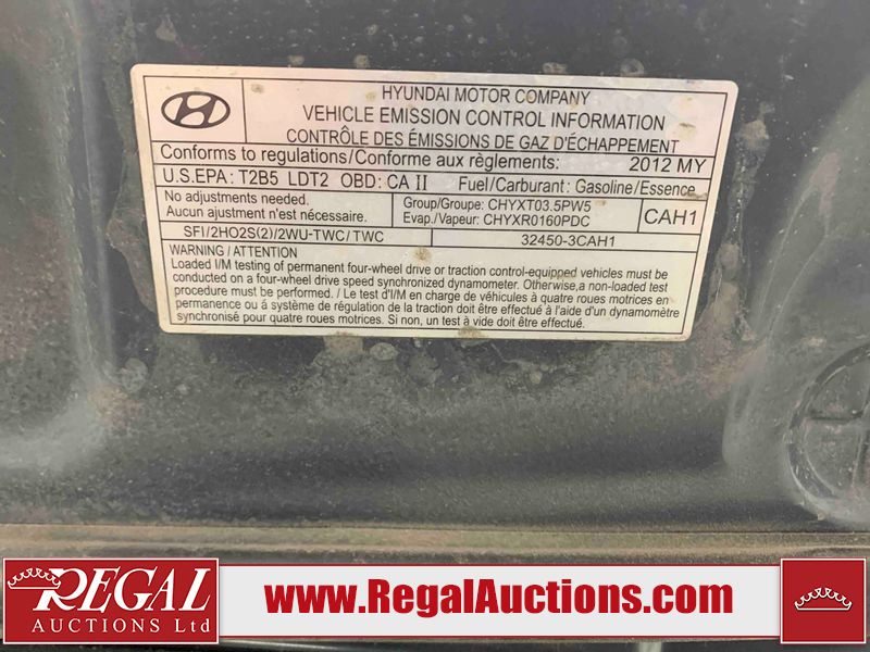 This 2012 HYUNDAI SANTA FE 4D SPORT UTILITY is powered by a 3.5L V6 gasoline engine and an automatic transmission. It is equipped with all-wheel drive. The SUV has seats for 5 people. The SUV has low mileage for its age. The vehicle has high-value options including a sunroof, leather upholstery, power seats, heated seats, navigation, and a backup camera. The body looks to be in rough condition overall. The rear bumper is cracked. There is noteworthy chrome peeling on the grille. There are scratches on the front bumper, hood, roof, left front fender, left front door, left rear door, left rear fender, rear bumper, and right rear door. There are slight chips on the front bumper, roof, rear bumper, and right rear door. There is slight rust on the hood, roof, and right rear fender. There is dent damage on the left front fender, left front door, left rear door, left rear fender, rear door, right rear fender, right rear door, and right front door. There is paint peeling on the right rear fender. There are very minor chips in many areas around the body. There is very minor dent damage in a few areas around the body. There are very minor scratches in some areas around the body. The interior looks to be in fair condition overall. The dashboard, driver's seat, passenger seat, rear seats, and doors are worn. The windshield is cracked. All of the tires have lots of tread remaining. This SUV is being sold by a franchise dealership. The vehicle will be sold with the following declarations: Claims Total $3000 - $4999 (See Footnote 1) and Dealership Trade-In (See Footnote 2). Footnotes: 1) The vehicle's total recorded insurance claims history is between $3,000 - $4,999. This is the amount of money that was paid out by an insurance company for repairs to cover claims against the vehicle's insurance policy. This information is provided by CarFax. 2) This vehicle is being sold on behalf of a franchise dealership. Franchise Dealerships are automotive sales companies who are directly connected to an automotive manufacturer like Ford, Tesla, Honda, BMW, or similar. Regal Auctions Ltd. makes no guarantee or warranty, either express or implied, with respect to the data provided in this report. The information has been provided from the consignor and from sources generally believed to be reliable, however the accuracy of this information cannot be guaranteed by Regal Auctions.
