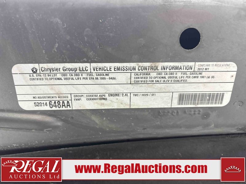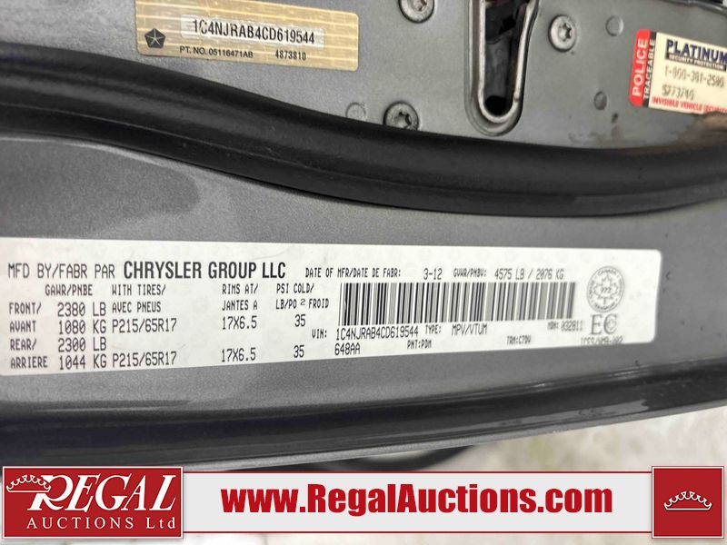 This 2012 JEEP PATRIOT SPORT 4D UTILITY is powered by a 2.4L 4-cylinder gasoline engine and an automatic transmission. It is equipped with four-wheel drive. The SUV has seats for 5 people. The mileage is average considering the SUV's age. The body looks to be in fair condition overall. There is some hail on the hood and roof. There is rust on the left front fender, left rear fender, and right rear fender. There are scratches on the left front door and rear bumper. There is hail on the rear door. There are very minor chips in many areas around the body. There are very minor scratches in many areas around the body. The interior looks to be in good condition overall. The windshield looks to be in good condition. All of the tires have lots of tread remaining. This SUV is being sold by an automotive broker. The vehicle will be sold with the following declarations: Hail Damage (See Footnote 1). Footnotes: 1) This vehicle shows signs of damage from a hail storm. Hail damage is not always clearly visible in photographs. Regal Auctions Ltd. makes no guarantee or warranty, either express or implied, with respect to the data provided in this report. The information has been provided from the consignor and from sources generally believed to be reliable, however the accuracy of this information cannot be guaranteed by Regal Auctions.