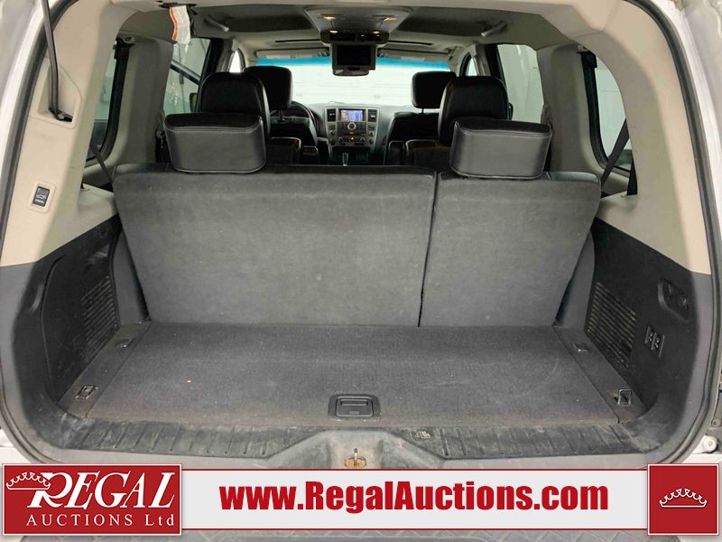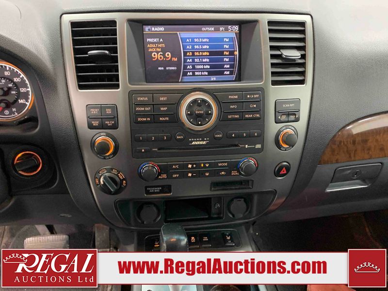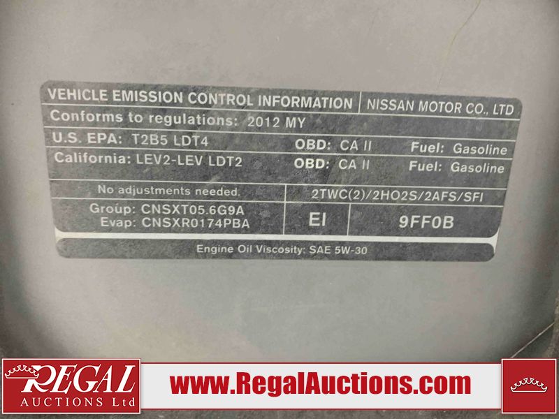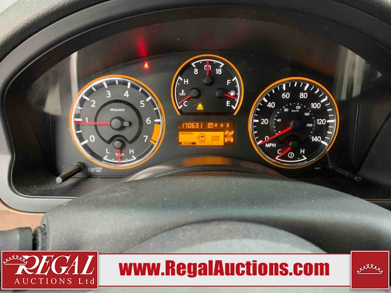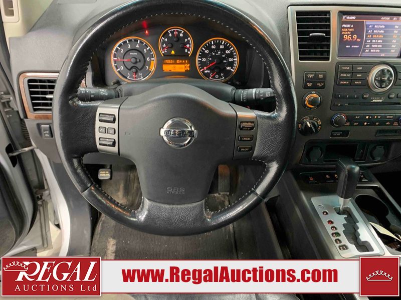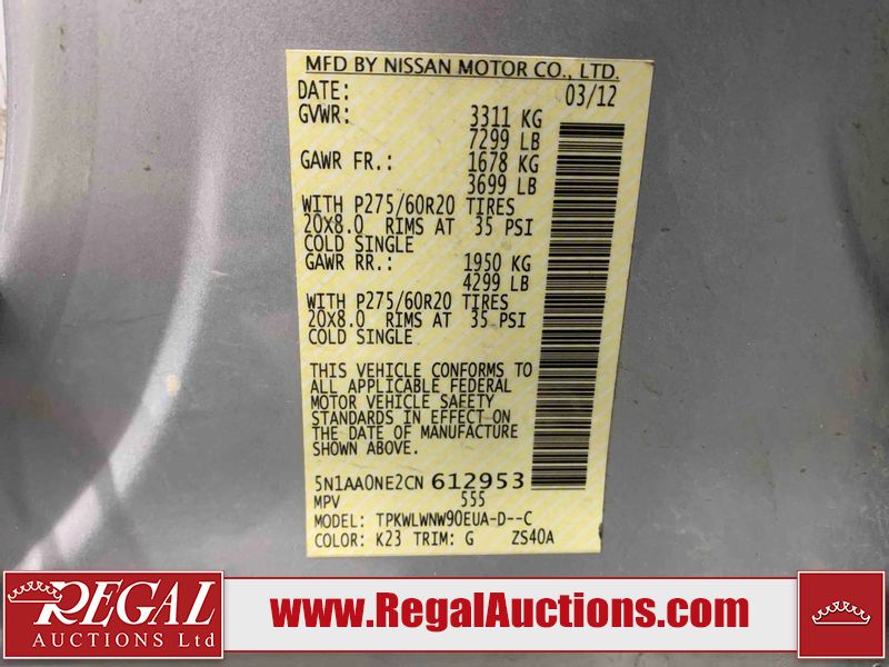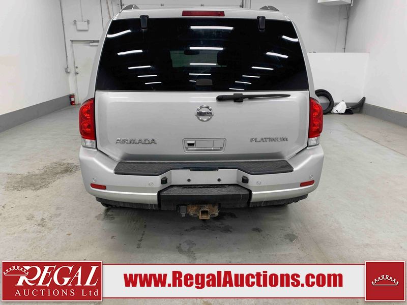 This 2012 NISSAN ARMADA 4D UTILITY 4WD is powered by a 5.6L V8 gasoline engine and an automatic transmission. It is equipped with four-wheel drive. The SUV has seats for 7 people. The SUV has high mileage for its age. The odometer is in miles and its reading, 170,631 miles, translates into 273,009 kilometers. The vehicle has high-value options including a sunroof, leather upholstery, power seats, heated seats, a DVD Player, navigation, a backup camera, and a power liftgate. The body looks to be in good condition overall. There are minor chips on the front bumper, hood, left front door, left rear door, right rear door, right front door, and right front fender. There are minor scratches on the left front fender, left rear fender, rear bumper, and right rear fender. There are very minor chips on the grille. There are very minor scratches in many areas around the body. The 3M on the hood is peeling. The interior looks to be in good condition overall. The driver's seat is worn. The windshield is cracked. The passenger front tire is worn. The rest of the tires all have lots of tread remaining. This SUV is being sold by an automotive broker. The vehicle will be sold with the following declarations: Odometer in Miles (See Footnote 1) and Claims Total $5000 - $9999 (See Footnote 2). Footnotes: 1) The vehicle's odometer reading is in miles and not kilometers. (1 Mile = 1.6 Kilometers). 2) The vehicle's total recorded insurance claims history is between $5,000 - $9,999. This is the amount of money that was paid out by an insurance company for repairs to cover claims against the vehicle's insurance policy. This information is provided by CarFax. Regal Auctions Ltd. makes no guarantee or warranty, either express or implied, with respect to the data provided in this report. The information has been provided from the consignor and from sources generally believed to be reliable, however the accuracy of this information cannot be guaranteed by Regal Auctions.
