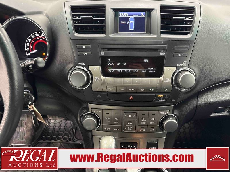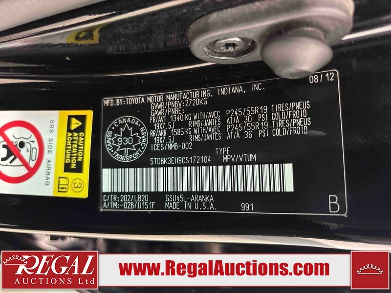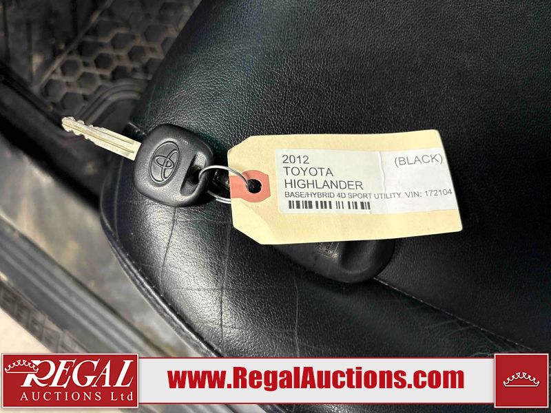 This 2012 TOYOTA HIGHLANDER HYBRID 4D SPORT UTILITY is powered by a 3.5 liter 6-cylinder hybrid engine and an automatic transmission. It is equipped with four-wheel drive. The SUV has seats for 7 people. The SUV has high mileage for its age. The vehicle has high-value options, including a sunroof, leather upholstery, power seats, heated seats, and a backup camera. The Tire Pressure light is on. The body looks to be in good condition overall. There are chips on the front bumper and left front door. There is minor rust on the roof. There are very minor scratches in many areas around the body. There are very minor chips in many areas around the body. There is very minor dent damage on the rear door. The interior looks to be in good condition overall. The windshield is chipped. All of the tires have lots of tread remaining. This SUV is being sold by an automotive broker. Regal Auctions Ltd. makes no guarantee or warranty, either express or implied, with respect to the data provided in this report. The information has been provided from the consignor and from sources generally believed to be reliable, however the accuracy of this information cannot be guaranteed by Regal Auctions.