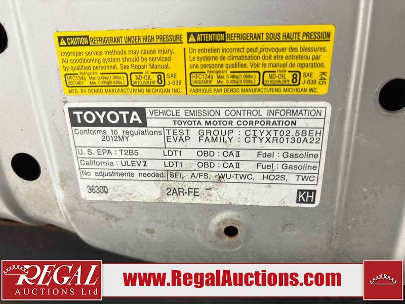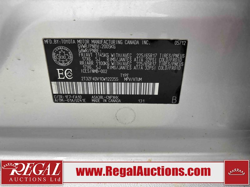 This 2012 TOYOTA RAV4 4D UTILITY is powered by a 2.5 4-cylinder gasoline engine and an automatic transmission. It is a two wheel drive model. The SUV has seats for 5 people. The SUV has low mileage for its age. The vehicle has high-value options including a sunroof. The body looks to be in fair condition overall. The rear bumper is cracked. There is incidental rust on the roof. There are chips on the left front fender and right front door. There is minor dent damage on the left front fender and right front fender. There are minor scratches on the left front door, left rear fender, rear bumper, and right rear door. The rear bumper is drill holes. There are very minor chips in many areas around the body. There are very minor scratches in many areas around the body. There is very minor dent damage on the rear bumper. The interior looks to be in good condition overall. The windshield is chipped. The front tires are both worn. The rear tires are nearly bald and should be replaced. This SUV is being sold by an automotive broker. Regal Auctions Ltd. makes no guarantee or warranty, either express or implied, with respect to the data provided in this report. The information has been provided from the consignor and from sources generally believed to be reliable, however the accuracy of this information cannot be guaranteed by Regal Auctions.