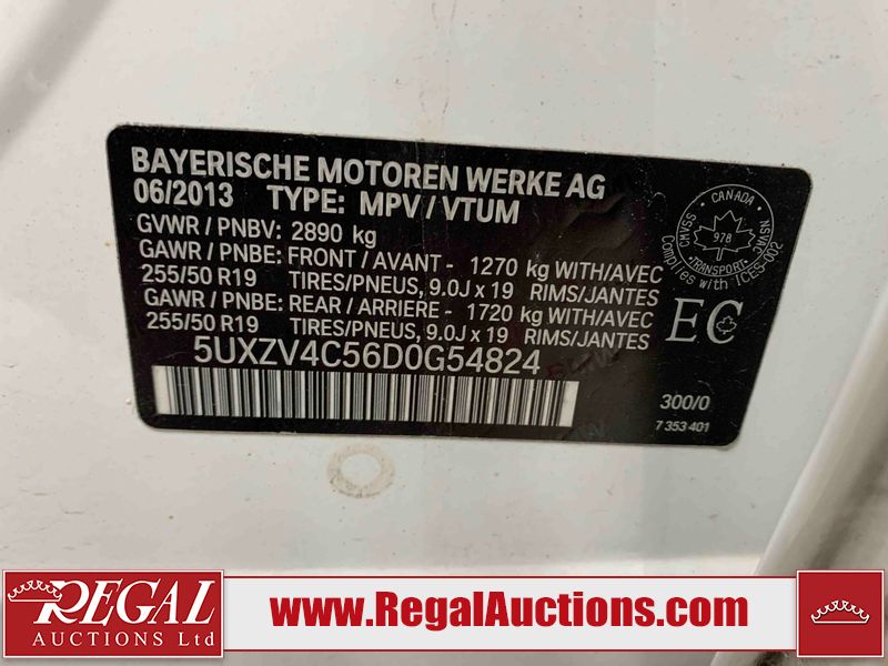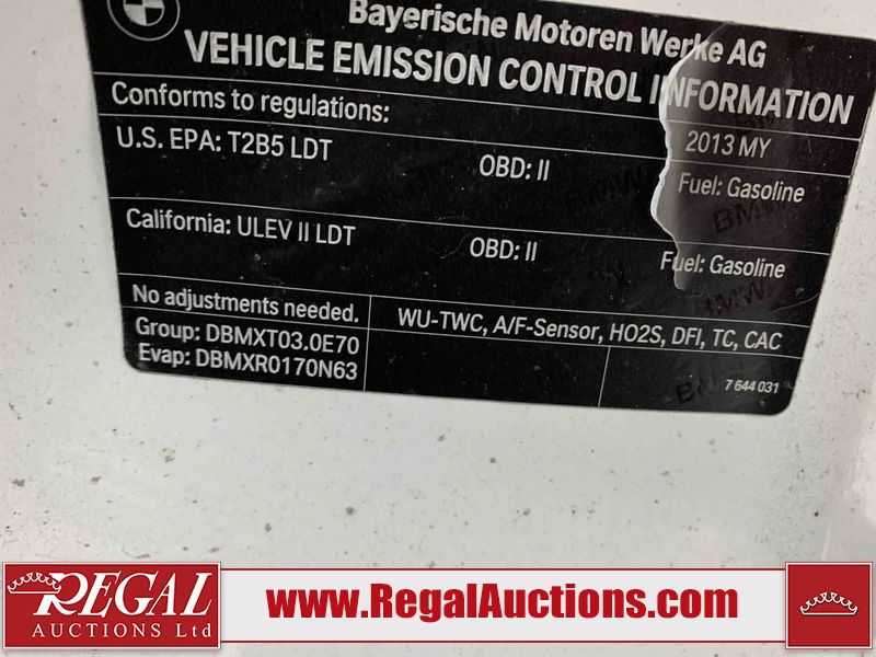 This 2013 BMW X5 XDRIVE35I 4D SPORT UTILITY is powered by a turbocharged 3.0L V6 gasoline engine and an automatic transmission. It is equipped with all-wheel drive. The SUV has seats for 7 people. The SUV has low mileage for its age. The vehicle has high-value options including a sunroof, leather upholstery, power seats, heated seats, navigation, a backup camera, and a power liftgate. The body looks to be in good condition overall. There are minor chips on the front bumper and rear door. There are scratches on the rear bumper, rear door, right rear fender, and right rear door. There are very minor chips in many areas around the body. There are very minor scratches in a few areas around the body. The interior looks to be in good condition overall. The windshield looks to be in good condition. The passenger front tire is worn. The rest of the tires all have lots of tread remaining. This SUV is being sold by an automotive broker. The vehicle will be sold with the following declarations: Claims Total $10,000 - $14,999 (See Footnote 1), Out of Province - BC (See Footnote 2), and Out of Province - AB OVERRIDE (See Footnote 3). Footnotes: 1) The vehicle's total recorded insurance claims history is between $10,000 - $14,999. This is the amount of money that was paid out by an insurance company for repairs to cover claims against the vehicle's insurance policy. This information is provided by CarFax. 2) The vehicle's last registered jurisdiction is British Columbia. The purchaser must have the vehicle undergo and pass an Out of Province inspection before it can be registered in Alberta. 3) Out of province inspection for registering the vehicle in Alberta has been completed. Regal Auctions Ltd. makes no guarantee or warranty, either express or implied, with respect to the data provided in this report. The information has been provided from the consignor and from sources generally believed to be reliable, however the accuracy of this information cannot be guaranteed by Regal Auctions.