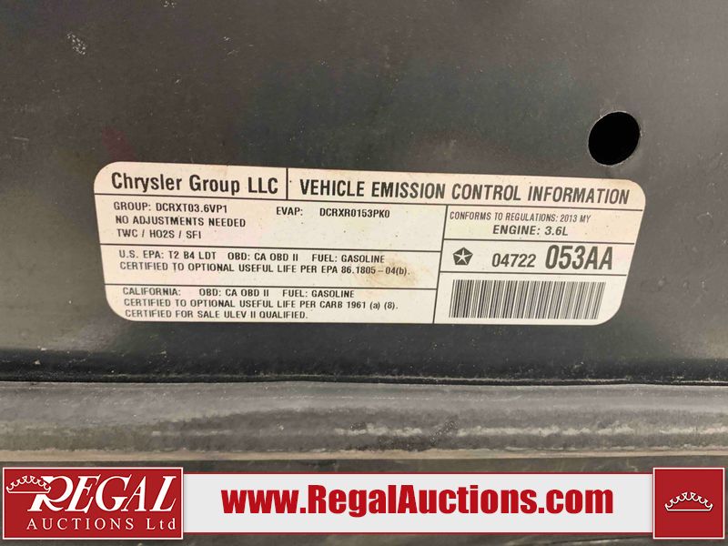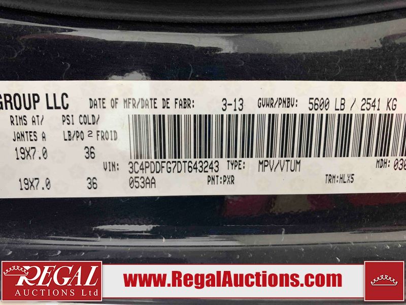 This 2013 DODGE JOURNEY R/T 4D UTILITY AWD is powered by a 3.6L V6 gasoline engine and an automatic transmission. It is equipped with all-wheel drive. The SUV has seats for 5 people. R/T is a very popular trim level. The vehicle has high-value options including a sunroof, leather upholstery, power/heated seats, navigation, and a backup camera. The body looks to be in fair condition overall. There is severe rust on the right rear fender. The front bumper is broken. There is a fair amount of rust on the roof, left rear fender, and right front door. There are some scratches on the rear bumper. There is some dent damage on the right front fender. There are minimal chips on the front bumper, hood, left rear door, and right rear door. There are chips in a few areas around the body. There are scratches in many areas around the body. The interior looks to be in good condition overall. The windshield looks to be in good condition. Both rear tires and the driver's side front tire are all worn. The passenger side front tire has lots of tread remaining. This SUV is being sold by an automotive broker. The vehicle will be sold with the following declarations: Claims Total $5000 - $9999 (See Footnote 1), Out of Province - BC (See Footnote 2), Out of Province - AB OVERRIDE (See Footnote 3), and True Mileage Unknown (See Footnote 4). Footnotes: 1) The vehicle's total recorded insurance claims history is between $5,000 - $9,999. This is the amount of money that was paid out by an insurance company for repairs to cover claims against the vehicle's insurance policy. This information is provided by CarFax. 2) The vehicle's last registered jurisdiction is British Columbia. The purchaser must have the vehicle undergo and pass an Out of Province inspection before it can be registered in Alberta. 3) Out of province inspection for registering the vehicle in Alberta has been completed. 4) The accuracy and history of the odometer reading cannot be verified and the current odometer reading is not believed to be correct. Regal Auctions Ltd. makes no guarantee or warranty, either express or implied, with respect to the data provided in this report. The information has been provided from the consignor and from sources generally believed to be reliable, however the accuracy of this information cannot be guaranteed by Regal Auctions.