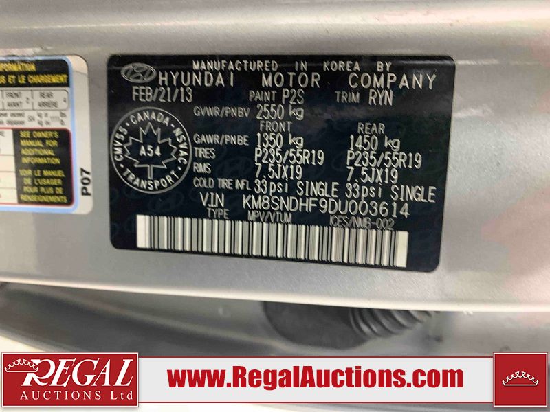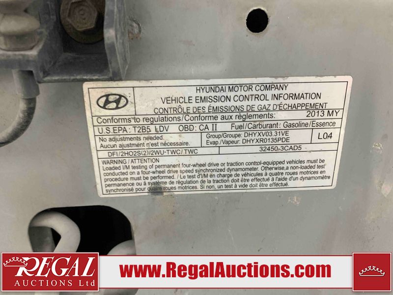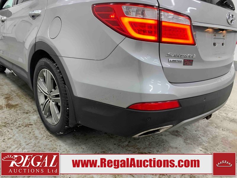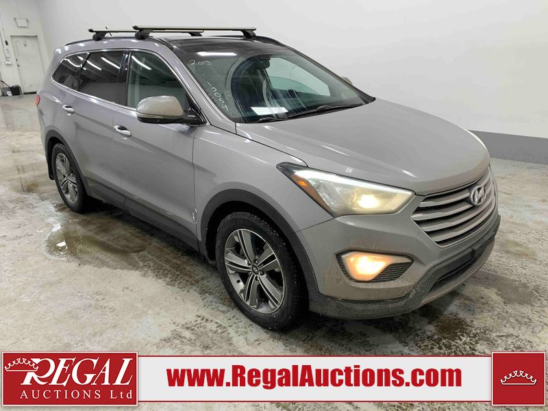 This 2013 HYUNDAI SANTA FE XL LIMITED 4D SPORT UTILITY is powered by a 3.3L 6 cylinder gasoline engine and an automatic transmission. It is equipped with four wheel drive. The SUV has seats for 6 people. The SUV has low mileage for its age. The vehicle has high value options including a sunroof, leather upholstery, power seats, heated seats, navigation, a backup camera, and a power lift gate. The body looks to be in fair condition overall. There is slight dent damage on the left front door. There are scratches on the left rear fender, rear bumper, right rear fender, and right rear door. There are chips on the rear bumper. There are very minor chips in many areas around the body. There are very minor scratches in many areas around the body. There is very minor dent damage on the left rear door. The interior looks to be in good condition overall. The windshield is chipped. All of the tires have lots of tread remaining. This SUV is being sold by an automotive broker. Regal Auctions Ltd. makes no guarantee or warranty, either express or implied, with respect to the data provided in this report. The information has been provided from the consignor and from sources generally believed to be reliable, however the accuracy of this information cannot be guaranteed by Regal Auctions.