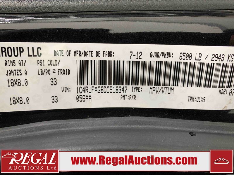 This 2013 JEEP GRAND CHEROKEE LAREDO 4D UTILITY is powered by a 3.6L 6 cylinder gasoline engine and an automatic transmission. It is equipped with four wheel drive. The SUV has seats for 5 people. The mileage is average considering the SUV's age. LAREDO is a very popular trim level. The vehicle has high value options including a sunroof, leather upholstery, power seats, heated seats, and a backup camera. The body looks to be in fair condition overall. There is noteworthy paint overspray on the roof. There is moderate rust on the left front fender. There are conspicuous scratches on the right rear door. There are chips on the front bumper, hood, and left front fender. There is rust on the roof. There are minimal scratches on the left front door, left rear door, and rear bumper. There is incidental dent damage on the right rear door. There are very minor scratches in many areas around the body. There are very minor chips in many areas around the body. The interior looks to be in good condition overall. The windshield is cracked. All of the tires have lots of tread remaining. This SUV is being sold by a franchise dealership. The vehicle will be sold with the following declarations: Dealership Trade-In (See Footnote 1). Footnotes: 1) This vehicle is being sold on behalf of a franchise dealership. Franchise Dealerships are automotive sales companies who are directly connected to an automotive manufacturer like Ford, Tesla, Honda, BMW, or similar. Regal Auctions Ltd. makes no guarantee or warranty, either express or implied, with respect to the data provided in this report. The information has been provided from the consignor and from sources generally believed to be reliable, however the accuracy of this information cannot be guaranteed by Regal Auctions.