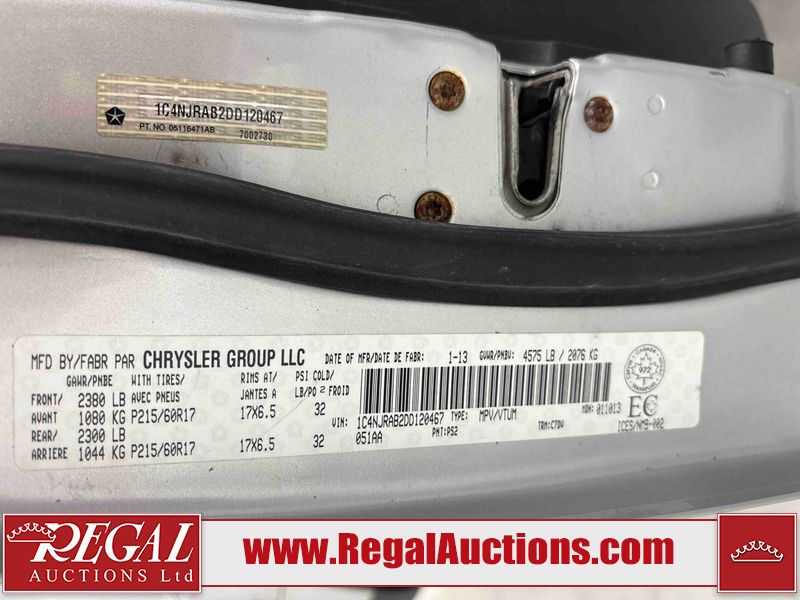This 2013 JEEP PATRIOT 4D UTILITY is powered by a 2.4L 4-cylinder gasoline engine and an automatic transmission. It is equipped with four-wheel drive. The SUV has seats for 5 people. The SUV has low mileage for its age. The vehicle has high-value options including navigation. The body looks to be in fair condition overall. The front bumper is cracked. The front bumper is drill holes. There is rust on the left front fender. There are scratches on the left front door and left rear door. There is minor dent damage on the left front door. There are very minor chips in many areas around the body. There are very minor scratches in many areas around the body. There is very minor dent damage on the left rear fender. The interior looks to be in good condition overall. The windshield is chipped. All of the tires have lots of tread remaining. This SUV is being sold by an automotive broker. Regal Auctions Ltd. makes no guarantee or warranty, either express or implied, with respect to the data provided in this report. The information has been provided from the consignor and from sources generally believed to be reliable, however the accuracy of this information cannot be guaranteed by Regal Auctions.
