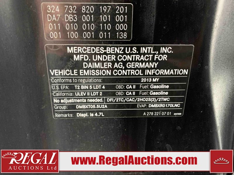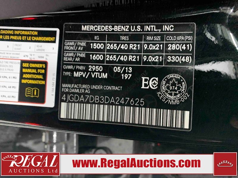 This 2013 MERCEDES-BENZ ML 550 4D UTILITY is powered by a 4.7L V8 cylinder gasoline engine and an automatic transmission. It is equipped with four wheel drive. The SUV has seats for 5 people. The SUV has low mileage for its age. The vehicle has high value options including a sunroof, leather upholstery, power seats, heated seats, a DVD Player, navigation, a backup camera, and a power lift gate. The body looks to be in good condition overall. The grille is cracked. The front bumper has parts missing. There are slight scratches on the front bumper. There are very minor chips in many areas around the body. There are very minor scratches in many areas around the body. The interior looks to be in fair condition overall. The driver's seat and doors are worn. The windshield looks to be in good condition. All of the tires have lots of tread remaining. This SUV is being sold by a franchise dealership. The vehicle will be sold with the following declarations: Dealership Trade-In (See Footnote 1). Footnotes: 1) This vehicle is being sold on behalf of a franchise dealership. Franchise Dealerships are automotive sales companies who are directly connected to an automotive manufacturer like Ford, Tesla, Honda, BMW, or similar. Regal Auctions Ltd. makes no guarantee or warranty, either express or implied, with respect to the data provided in this report. The information has been provided from the consignor and from sources generally believed to be reliable, however the accuracy of this information cannot be guaranteed by Regal Auctions.