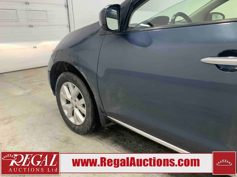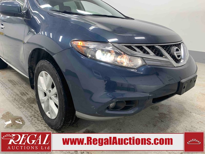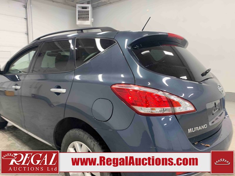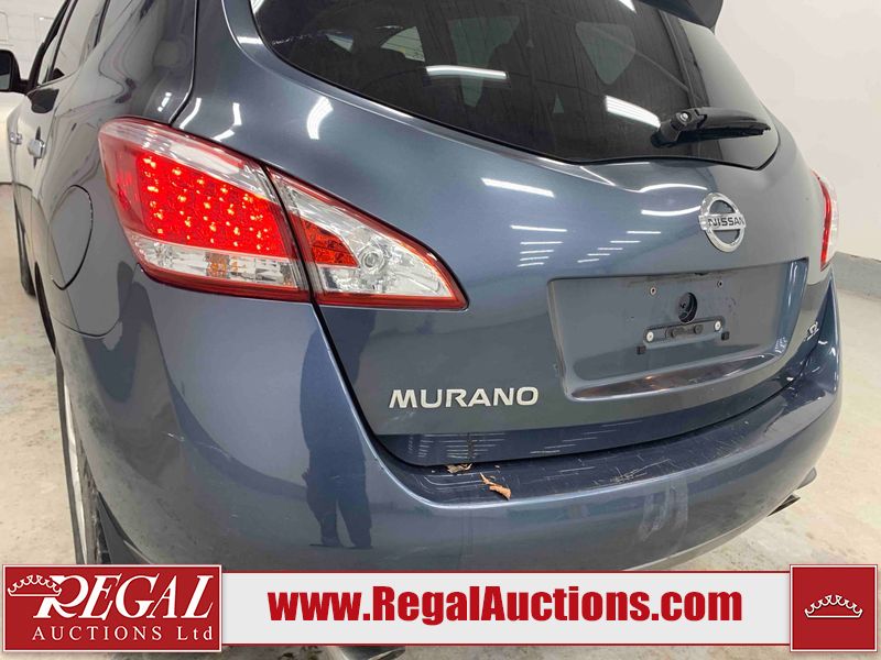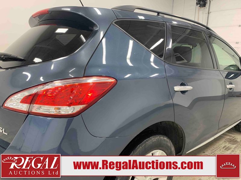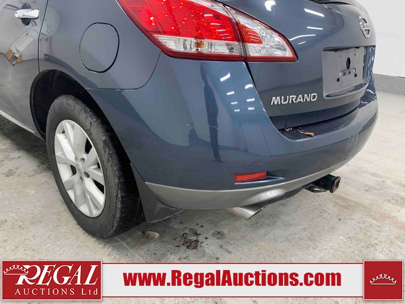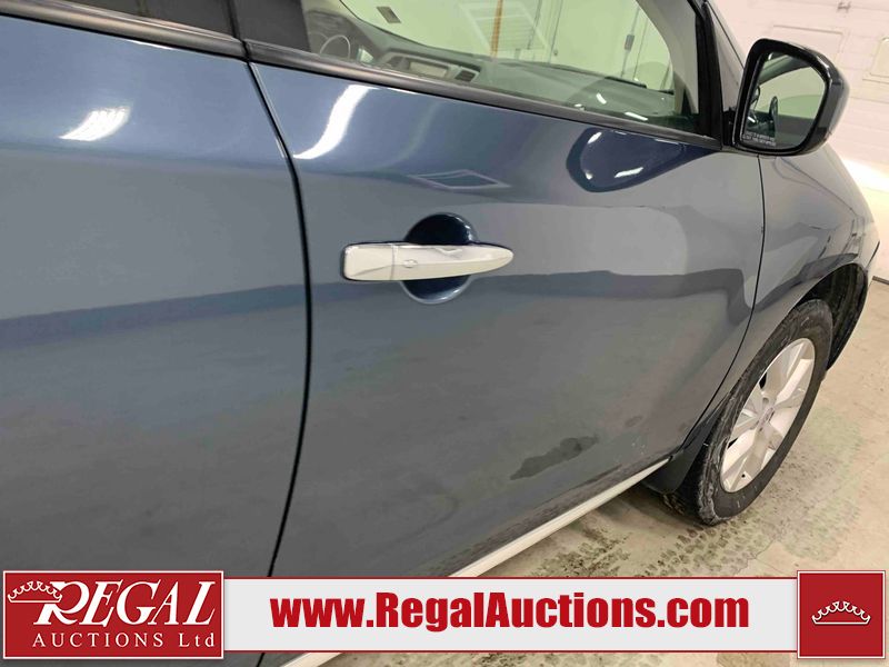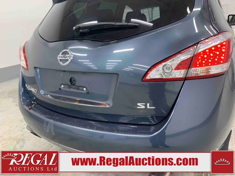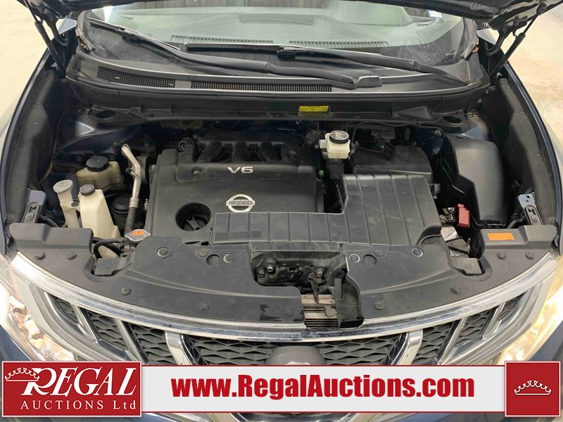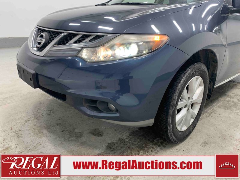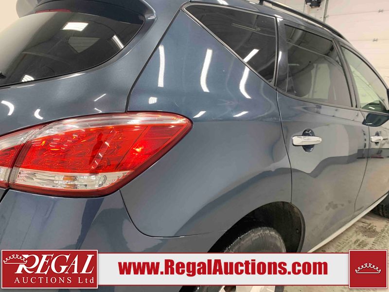 This 2013 NISSAN MURANO SL 4D UTILITY is powered by a 3.5L V6 gasoline engine and an automatic transmission. It is equipped with all-wheel drive. The SUV has seats for 5 people. The SUV has low mileage for its age. The vehicle has high-value options including leather upholstery, power seats, heated seats, a backup camera, and a power lift gate. The body looks to be in fair condition overall. There are scratches on the front bumper, hood, left front fender, left front door, left rear door, left rear fender, rear bumper, rear door, right rear fender, right rear door, right front door, and right front fender. There is slight dent damage on the roof, left rear fender, and right rear fender. There are incidental chips on the rear bumper. There are very minor chips in many areas around the body. There are very minor scratches on the roof. There is very minor dent damage on the left rear door. The front bumper is misaligned. The interior looks to be in good condition overall. The windshield looks to be in good condition. The front tires and the passenger side rear tire are all nearly bald and should be replaced. This SUV is being sold by an automotive broker. The vehicle will be sold with the following declarations: Claims Total $3000 - $4999 (See Footnote 1), Out of Province - BC (See Footnote 2), and Out of Province - AB OVERRIDE (See Footnote 3). Footnotes: 1) The vehicle's total recorded insurance claims history is between $3,000 - $4,999. This is the amount of money that was paid out by an insurance company for repairs to cover claims against the vehicle's insurance policy. This information is provided by CarFax. 2) The vehicle's last registered jurisdiction is British Columbia. The purchaser must have the vehicle undergo and pass an Out of Province inspection before it can be registered in Alberta. 3) Out of province inspection for registering the vehicle in Alberta has been completed. Regal Auctions Ltd. makes no guarantee or warranty, either express or implied, with respect to the data provided in this report. The information has been provided from the consignor and from sources generally believed to be reliable, however the accuracy of this information cannot be guaranteed by Regal Auctions.