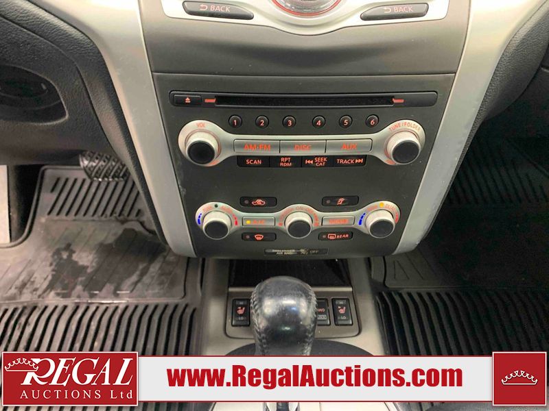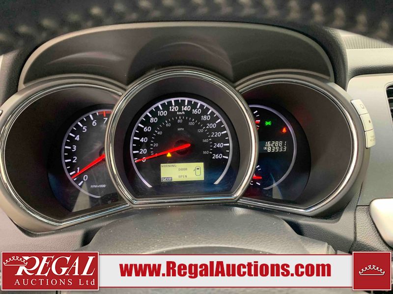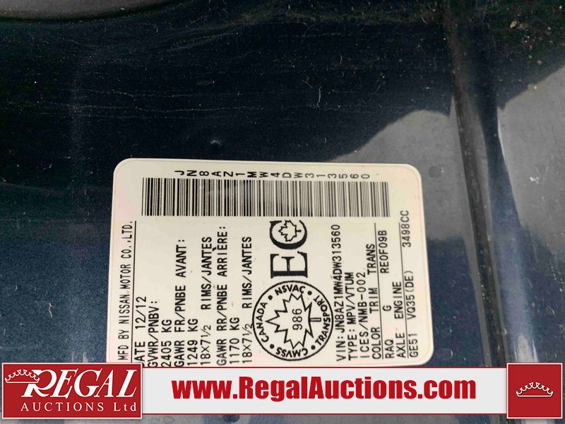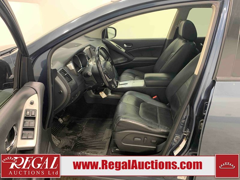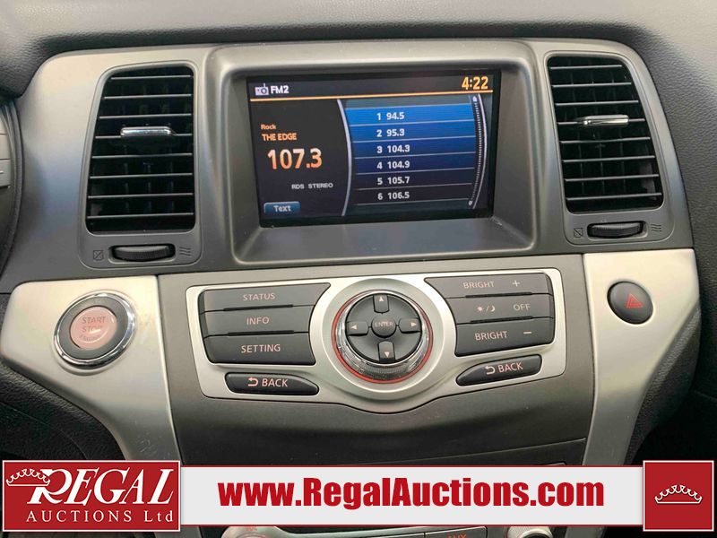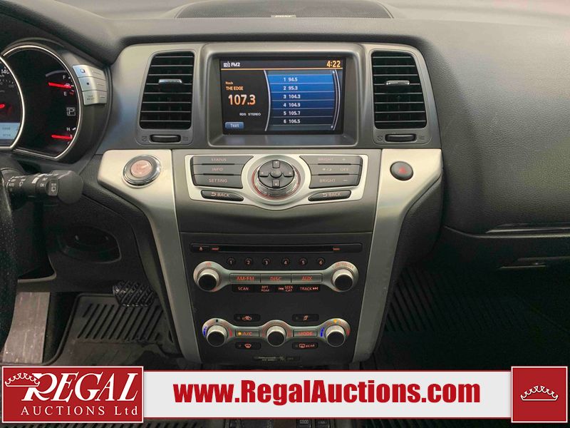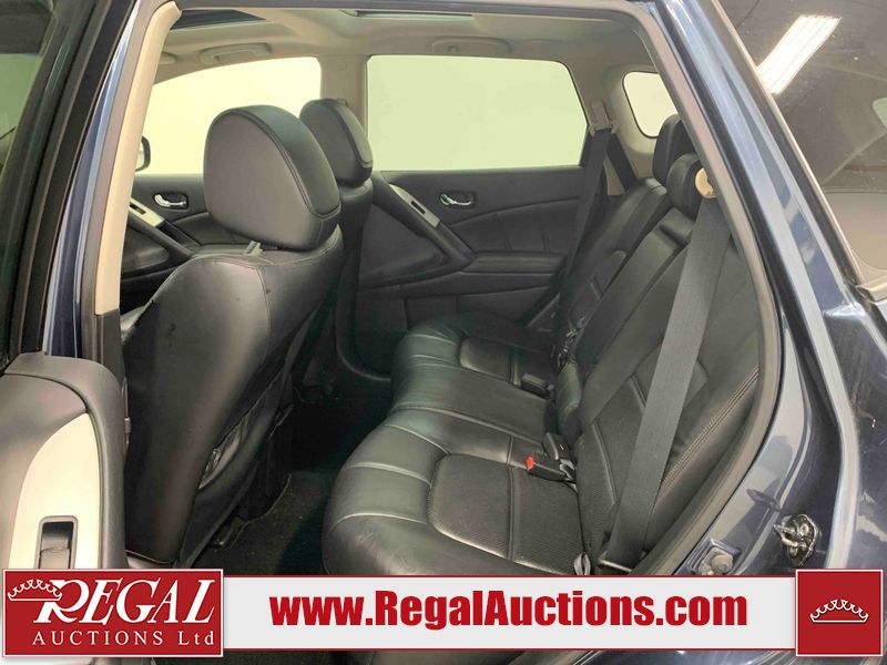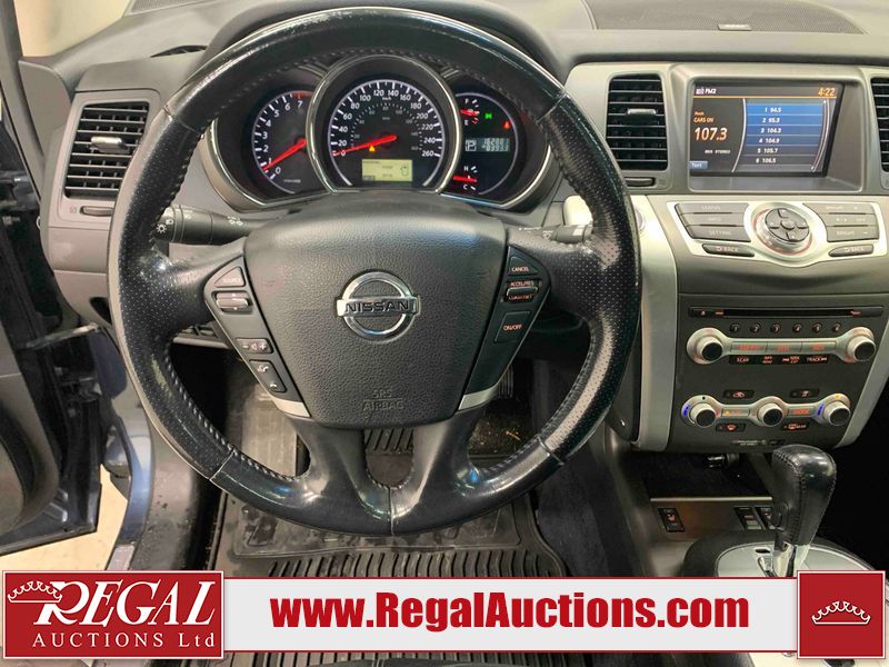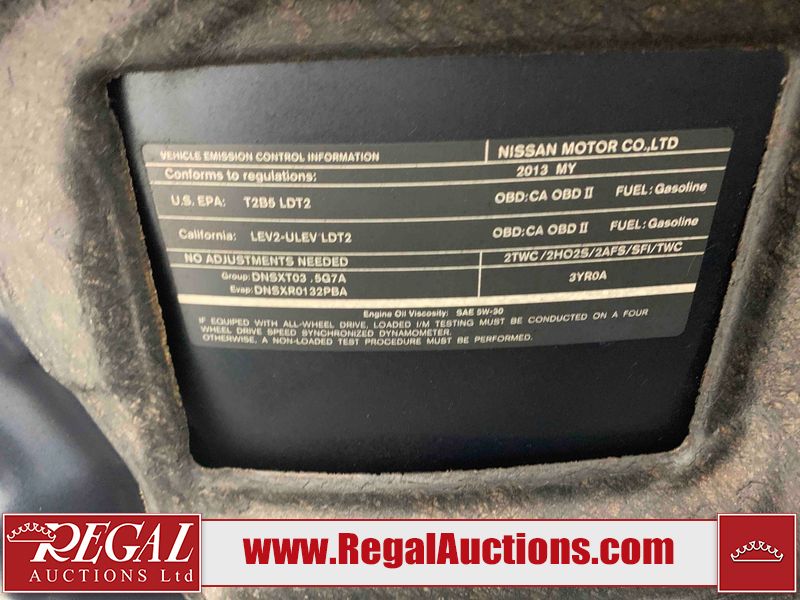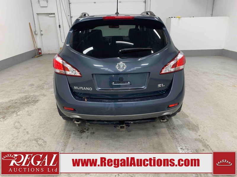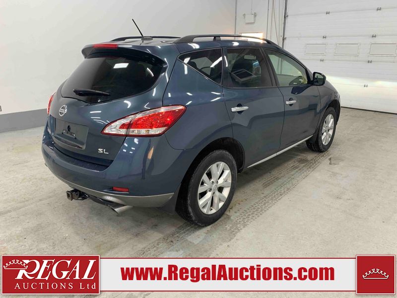 This 2013 NISSAN MURANO SL 4D UTILITY is powered by a 3.5L V6 gasoline engine and an automatic transmission. It is equipped with all-wheel drive. The SUV has seats for 5 people. The SUV has low mileage for its age. The vehicle has high-value options including leather upholstery, power seats, heated seats, a backup camera, and a power lift gate. The body looks to be in fair condition overall. There are scratches on the front bumper, hood, left front fender, left front door, left rear door, left rear fender, rear bumper, rear door, right rear fender, right rear door, right front door, and right front fender. There is slight dent damage on the roof, left rear fender, and right rear fender. There are incidental chips on the rear bumper. There are very minor chips in many areas around the body. There are very minor scratches on the roof. There is very minor dent damage on the left rear door. The front bumper is misaligned. The interior looks to be in good condition overall. The windshield looks to be in good condition. The front tires and the passenger side rear tire are all nearly bald and should be replaced. This SUV is being sold by an automotive broker. The vehicle will be sold with the following declarations: Claims Total $3000 - $4999 (See Footnote 1), Out of Province - BC (See Footnote 2), and Out of Province - AB OVERRIDE (See Footnote 3). Footnotes: 1) The vehicle's total recorded insurance claims history is between $3,000 - $4,999. This is the amount of money that was paid out by an insurance company for repairs to cover claims against the vehicle's insurance policy. This information is provided by CarFax. 2) The vehicle's last registered jurisdiction is British Columbia. The purchaser must have the vehicle undergo and pass an Out of Province inspection before it can be registered in Alberta. 3) Out of province inspection for registering the vehicle in Alberta has been completed. Regal Auctions Ltd. makes no guarantee or warranty, either express or implied, with respect to the data provided in this report. The information has been provided from the consignor and from sources generally believed to be reliable, however the accuracy of this information cannot be guaranteed by Regal Auctions.