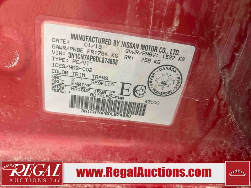 This 2013 NISSAN VERSA 4D SEDAN is powered by a 1.6L 4 cylinder gasoline engine and an automatic transmission. It is a two wheel drive model. The SUV has seats for 5 people. The SUV has low mileage for its age. The vehicle has some mechanical problems. **TRANSMISSION SLIPPING** (See Footnote 1) The body looks to be in fair condition overall. The front bumper, rear bumper, and right rear fender have been repainted poorly. The front bumper is broken. There is pronounced rust on the right rear fender. The front bumper has parts missing. There is rust on the roof and left front fender. There are slight scratches on the right rear door. There are very minor chips in many areas around the body. There are very minor scratches in many areas around the body. There is very minor dent damage in a few areas around the body. The interior looks to be in good condition overall. The windshield is cracked. The driver's side front tire is nearly bald and should be replaced. All of the other tires have lots of tread remaining. This SUV is being sold by an automotive broker. The vehicle will be sold with the following declarations: Mechanical Problems (See Footnote 1). Footnotes: 1) We've identified some mechanical problems with the vehicle. However, the vehicle has not undergone a mechanical inspection and our findings are not to be considered a complete evaluation of the vehicle's mechanical condition. Review our Buyer Protection Policy to see how Regal Auctions protects you from undisclosed mechanical problems. Regal Auctions Ltd. makes no guarantee or warranty, either express or implied, with respect to the data provided in this report. The information has been provided from the consignor and from sources generally believed to be reliable, however the accuracy of this information cannot be guaranteed by Regal Auctions.