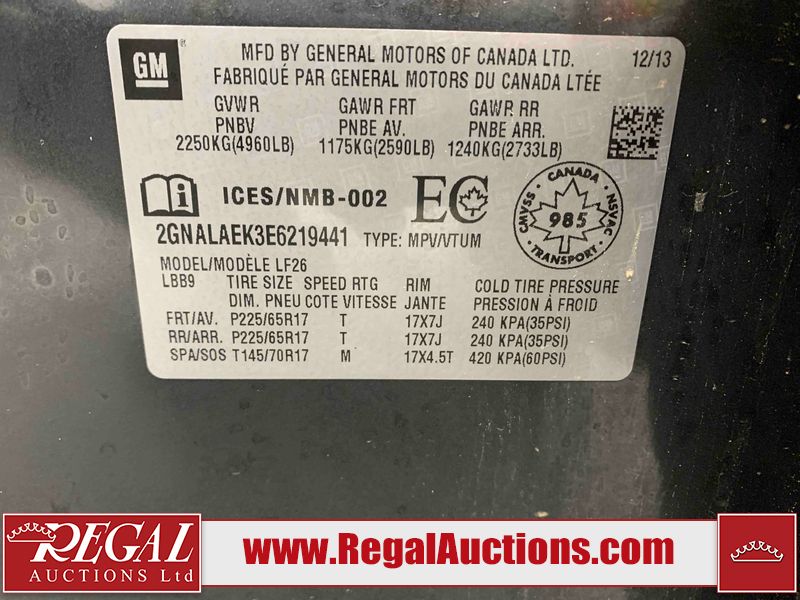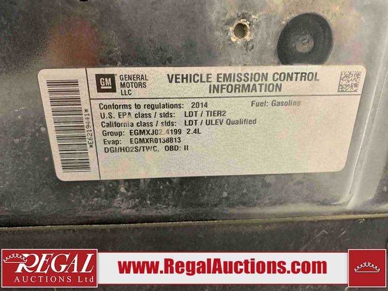 This 2014 CHEVROLET EQUINOX 4D SPORT UTILITY is powered by a 2.4L 4-cylinder gasoline engine and an automatic transmission. It is a two-wheel drive model. The SUV has seats for 5 people. The mileage is average considering the SUV's age. The Check Engine light is on. The body looks to be in rough condition overall. There is conspicuous rust on the hood, left front fender, left front door, left rear fender, rear door, right rear fender, and right front fender. There are chips on the front bumper, hood, left front fender, and right front fender. There are minor scratches on the front bumper, left front door, left rear door, left rear fender, rear bumper, right rear fender, right rear door, right front door, and right front fender. There is dent damage on the rear bumper. The interior looks to be in good condition overall. The windshield looks to be in good condition. The rear tires are worn. The front tires have lots of tread remaining. This SUV is being sold by a franchise dealership. The vehicle will be sold with the following declarations: Dealership Trade-In (See Footnote 1). Footnotes: 1) This vehicle is being sold on behalf of a franchise dealership. Franchise Dealerships are automotive sales companies who are directly connected to an automotive manufacturer like Ford, Tesla, Honda, BMW, or similar. Regal Auctions Ltd. makes no guarantee or warranty, either express or implied, with respect to the data provided in this report. The information has been provided from the consignor and from sources generally believed to be reliable, however the accuracy of this information cannot be guaranteed by Regal Auctions.