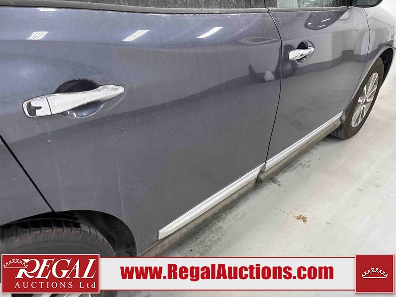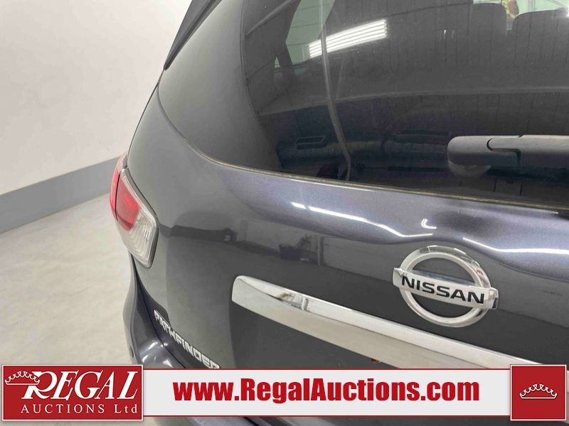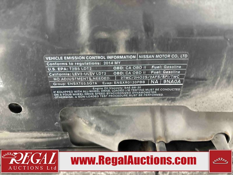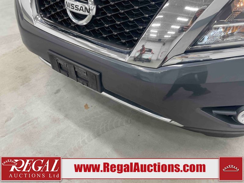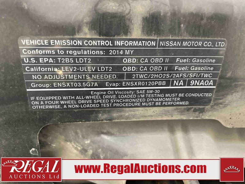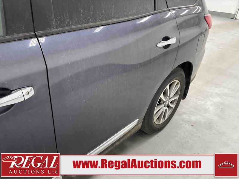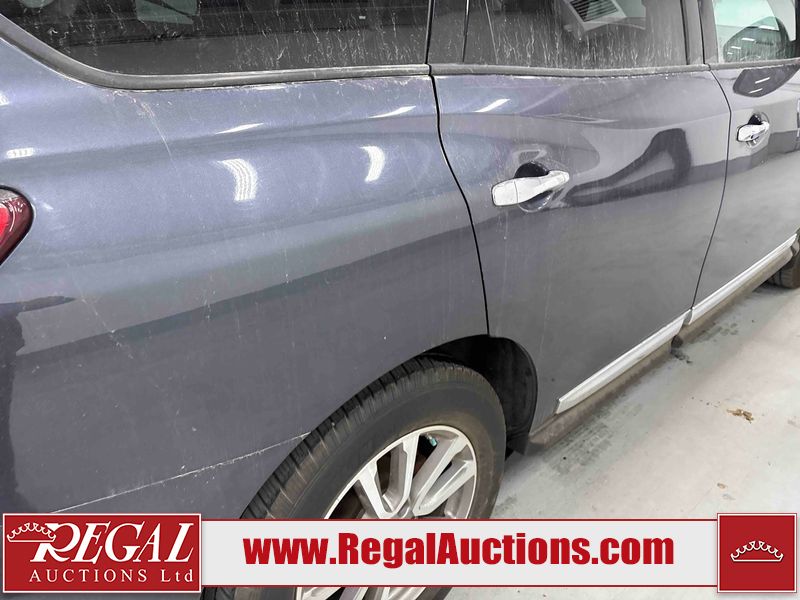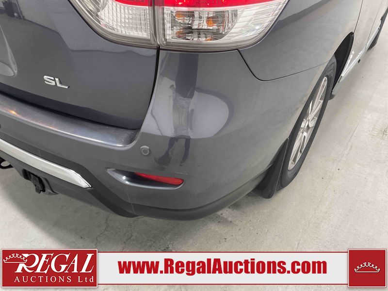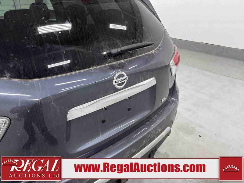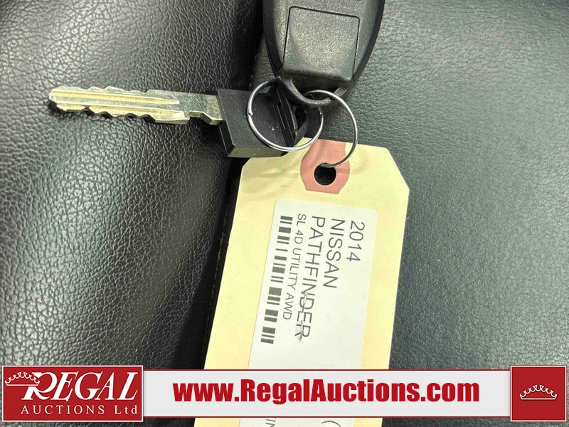 This 2014 NISSAN PATHFINDER SL 4D UTILITY AWD is powered by a 3.5L V6 gasoline engine and an automatic transmission. The SUV has seats for 7 people. The SUV has low mileage for its age. The vehicle has high-value options including leather upholstery, power seats, heated seats, a backup camera, and a power lift gate. The body looks to be in fair condition overall. There is dent damage on the hood, left front fender, right rear fender, and right rear door. There are minor scratches on the left front door, left rear door, and right front fender. There are very minor chips in many areas around the body. There are very minor scratches in many areas around the body. There is very minor dent damage on the right front fender. The interior looks to be in fair condition overall. The driver's seat is torn. The passenger seat and rear seats are worn. The windshield is chipped. The rear tires are worn. The front tires have lots of tread remaining. This SUV is being sold by an automotive broker. The vehicle will be sold with the following declarations: Out of Province - BC (See Footnote 1). Footnotes: 1) The vehicle's last registered jurisdiction is British Columbia. The purchaser must have the vehicle undergo and pass an Out of Province inspection before it can be registered in Alberta. Regal Auctions Ltd. makes no guarantee or warranty, either express or implied, with respect to the data provided in this report. The information has been provided from the consignor and from sources generally believed to be reliable, however the accuracy of this information cannot be guaranteed by Regal Auctions.