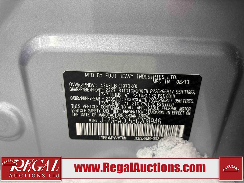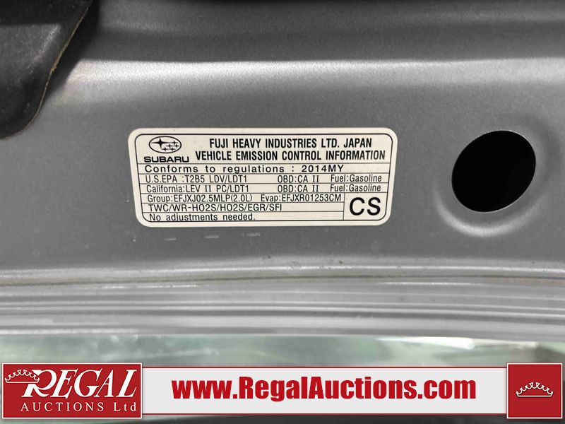 This 2014 SUBARU XV CROSSTREK 4D UTILITY AWD is powered by a 2.0L 4-cylinder gasoline engine and a 5-speed manual transmission. It is equipped with all-wheel drive. The SUV has seats for 5 people. The SUV has low mileage for its age. The vehicle has high-value options including a backup camera. The body looks to be in good condition overall. There are minimal scratches on the left front door. There are very minor chips in many areas around the body. There are very minor scratches in many areas around the body. There is very minor dent damage on the right front fender. The interior looks to be in good condition overall. The windshield is cracked. All of the tires have lots of tread remaining. This SUV is being sold by an automotive broker. The vehicle will be sold with the following declarations: Claims Total $5000 - $9999 (See Footnote 1). Footnotes: 1) The vehicle's total recorded insurance claims history is between $5,000 - $9,999. This is the amount of money that was paid out by an insurance company for repairs to cover claims against the vehicle's insurance policy. This information is provided by CarFax. Regal Auctions Ltd. makes no guarantee or warranty, either express or implied, with respect to the data provided in this report. The information has been provided from the consignor and from sources generally believed to be reliable, however the accuracy of this information cannot be guaranteed by Regal Auctions.