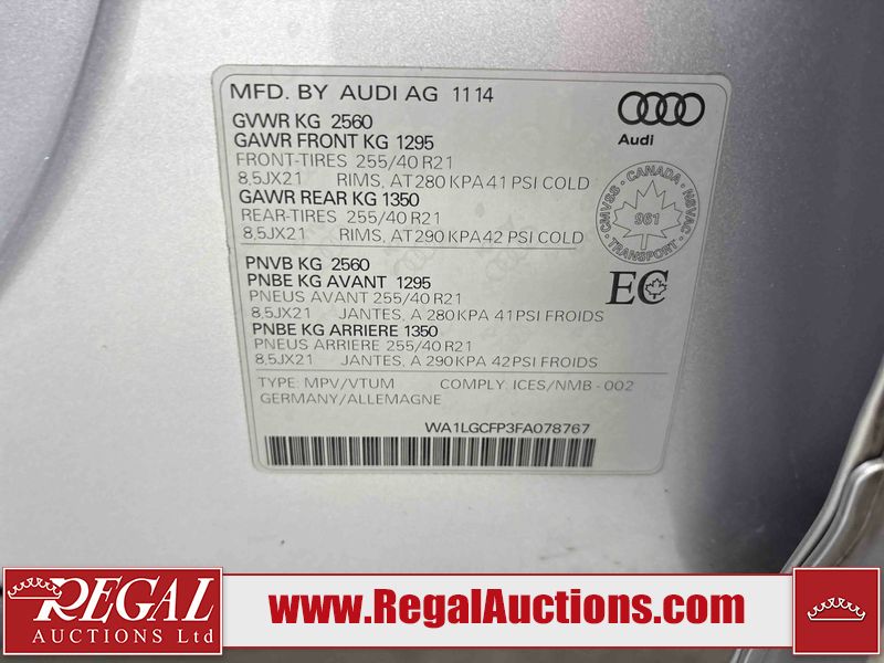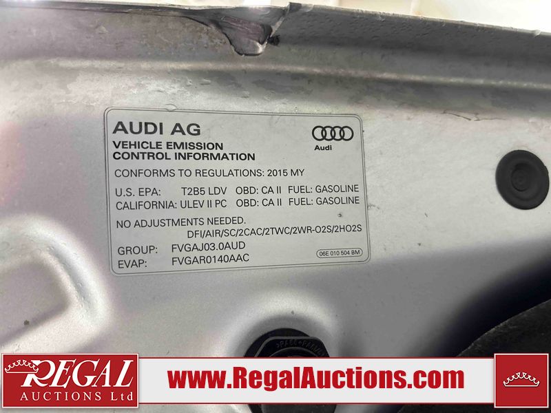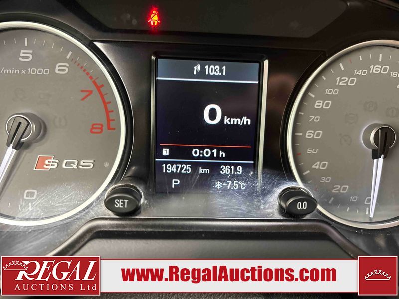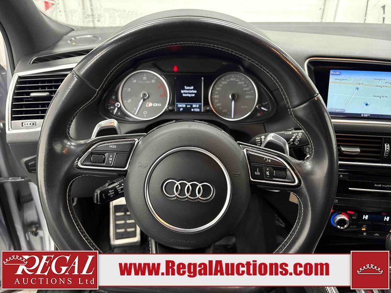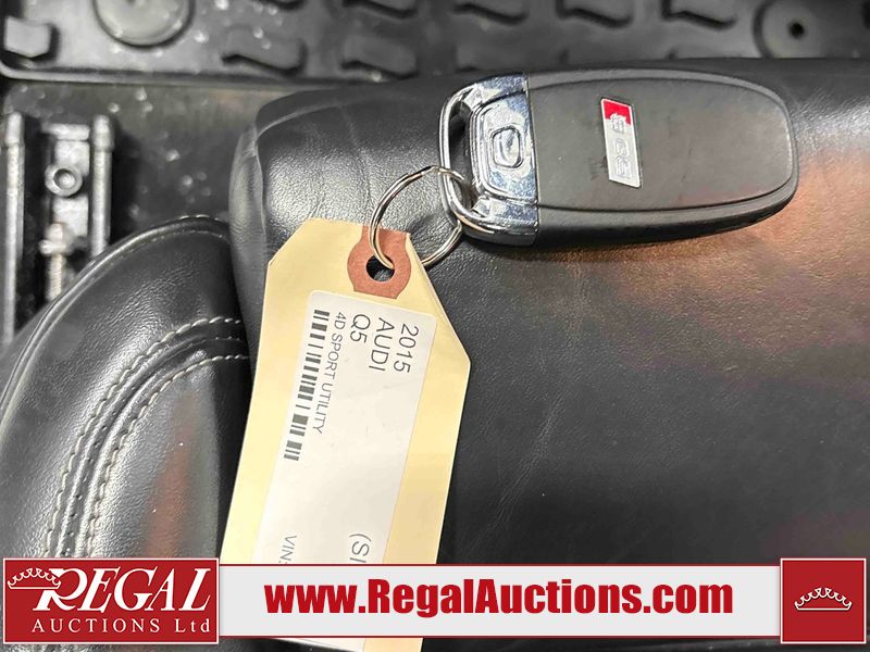 This 2015 AUDI Q5 4D SPORT UTILITY is powered by a 3.0L V6 gasoline engine and an automatic transmission. It is equipped with all-wheel drive. The SUV has seats for 5 people. The SUV has low mileage for its age. The vehicle has high-value options including a sunroof, leather upholstery, power seats, heated seats, navigation, and a backup camera. The body looks to be in good condition overall. There are minor scratches on the rear bumper. There are very minor chips in many areas around the body. There are very minor scratches in many areas around the body. There is very minor dent damage on the left front fender. The interior looks to be in good condition overall. The windshield looks to be in good condition. The front tires are nearly bald and should be replaced. The rear tires are worn. This SUV is being sold by an automotive broker. Regal Auctions Ltd. makes no guarantee or warranty, either express or implied, with respect to the data provided in this report. The information has been provided from the consignor and from sources generally believed to be reliable, however the accuracy of this information cannot be guaranteed by Regal Auctions.