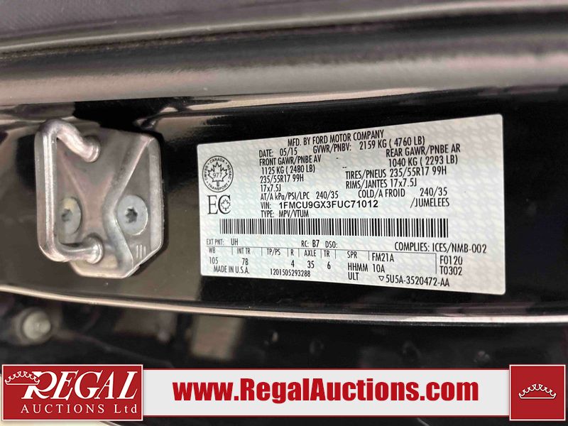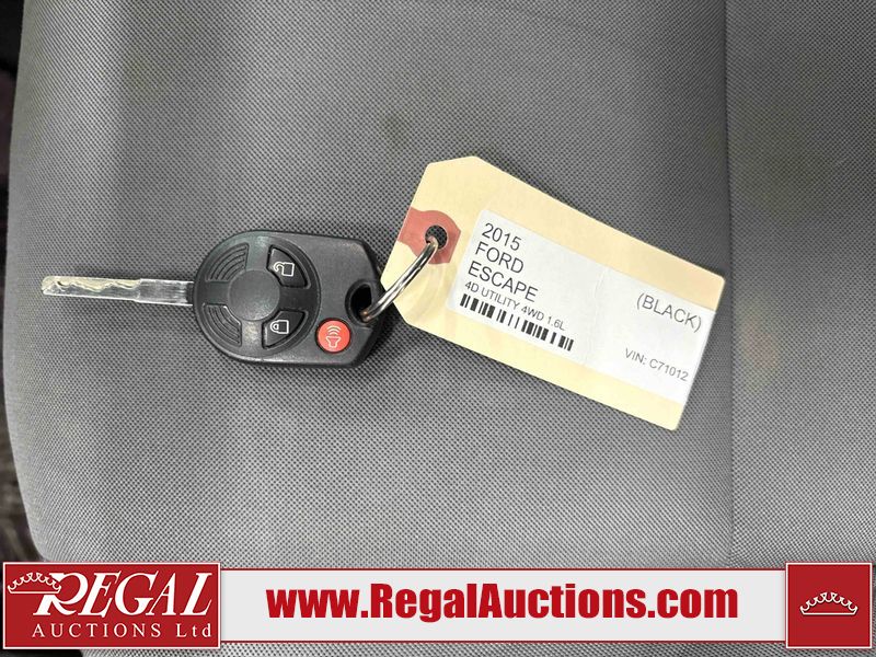 This 2015 FORD ESCAPE SE 4D UTILITY 4WD 1.6L is powered by a 1.6 liter 4 cylinder gasoline engine and an automatic transmission. It is equipped with four wheel drive. The SUV has seats for 5 people. The SUV has low mileage for its age. The vehicle has high value options including a backup camera. The ABS light is on. The body looks to be in good condition overall. There are slight scratches on the hood. There are incidental chips on the right rear door. There are scratches in many areas around the body. There are chips in many areas around the body. There is dent damage on the left rear door. The interior looks to be in good condition overall. The windshield looks to be in good condition. All of the tires have lots of tread remaining. This SUV is being sold by a private individual. The vehicle will be sold with the following declarations: Out of Province - BC (See Footnote 1) and Out of Province - AB OVERRIDE (See Footnote 2). Footnotes: 1) The vehicle's last registered jurisdiction is British Columbia. The purchaser must have the vehicle undergo and pass an Out of Province inspection before it can be registered in Alberta. 2) Out of province inspection for registering the vehicle in Alberta has been completed. Regal Auctions Ltd. makes no guarantee or warranty, either express or implied, with respect to the data provided in this report. The information has been provided from the consignor and from sources generally believed to be reliable, however the accuracy of this information cannot be guaranteed by Regal Auctions.