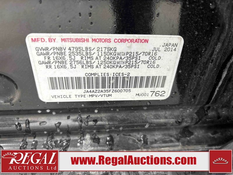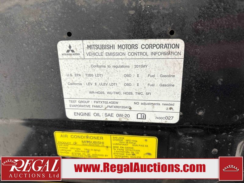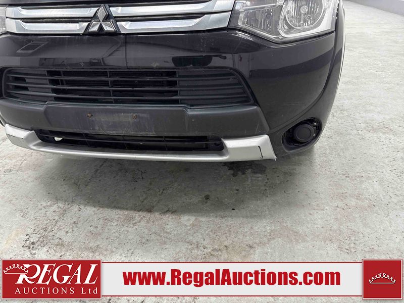 This 2015 MITSUBISHI OUTLANDER ES 4D UTILITY AWD is powered by a 2.4L 4-cylinder gasoline engine and an automatic transmission. It is equipped with all-wheel drive. The SUV has seats for 5 people. The SUV has low mileage for its age. The vehicle has high-value options including leather upholstery. The Tire Pressure light is on. The body looks to be in fair condition overall. The front bumper is broken. The right front door has been repainted poorly. There are minimal scratches on the front bumper, left rear door, right rear fender, right rear door, and right front fender. There is dent damage on the hood and right front fender. There is rust on the right front door and right front fender. There are very minor chips in many areas around the body. There are very minor scratches in many areas around the body. There is very minor dent damage on the left front door. the roof is partially wrapped. The interior looks to be in good condition overall. The windshield is chipped. The front tires are nearly bald and should be replaced. The rear tires are worn. This SUV is being sold by an automotive broker. The vehicle will be sold with the following declarations: Claims Total $3000 - $4999 (See Footnote 1) and Out of Province - BC (See Footnote 2). Footnotes: 1) The vehicle's total recorded insurance claims history is between $3,000 - $4,999. This is the amount of money that was paid out by an insurance company for repairs to cover claims against the vehicle's insurance policy. This information is provided by CarFax. 2) The vehicle's last registered jurisdiction is British Columbia. The purchaser must have the vehicle undergo and pass an Out of Province inspection before it can be registered in Alberta. Regal Auctions Ltd. makes no guarantee or warranty, either express or implied, with respect to the data provided in this report. The information has been provided from the consignor and from sources generally believed to be reliable, however the accuracy of this information cannot be guaranteed by Regal Auctions.