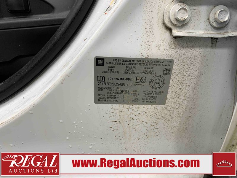 This 2016 CHEVROLET EQUINOX LT 4D SPORT UTILITY AWD is powered by a 3.6L V6 cylinder gasoline engine and an automatic transmission. It is equipped with all-wheel drive. The SUV has seats for 5 people. The SUV has low mileage for its age. The vehicle has high-value options, including a sunroof, power seats, heated seats, and a backup camera. The body looks to be in fair condition overall. There are incidental chips on the front bumper, hood, roof, left front fender, left front door, left rear door, left rear fender, rear bumper, rear door, right rear fender, right rear door, right front door, and right front fender. There are minimal scratches on the front bumper, left front fender, left front door, left rear door, rear bumper, and rear door. There are very minor chips on the grille. There are very minor scratches in many areas around the body. The taillights are broken. The interior looks to be in good condition overall. The windshield looks to be in good condition. The tires are all worn. This SUV is being sold by an automotive broker. The vehicle will be sold with the following declarations: Claims Total $1000 - $2999 (See Footnote 1), Out of Province - BC (See Footnote 2) and Out of Province - AB OVERRIDE (See Footnote 3) Footnotes: 1) The vehicle's total recorded insurance claims history is between $1,000 - $2,999. This is the amount of money that was paid out by an insurance company for repairs to cover claims against the vehicle's insurance policy. This information is provided by CarFax. 2) The vehicle's last registered jurisdiction is British Columbia. The purchaser must have the vehicle undergo and pass an Out of Province inspection before it can be registered in Alberta. 3) Out of province inspection for registering the vehicle in Alberta has been completed Regal Auctions Ltd. makes no guarantee or warranty, either express or implied, with respect to the data provided in this report. The information has been provided from the consignor and from sources generally believed to be reliable, however the accuracy of this information cannot be guaranteed by Regal Auctions.