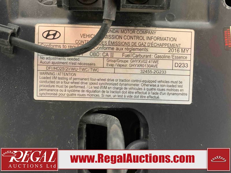 This 2016 HYUNDAI SANTA FE SPORT 4D SPORT UTILITY is powered by a 2.4 liter 4 cylinder gasoline engine and an automatic transmission. It is equipped with all wheel drive. The SUV has seats for 5 people. The SUV has low mileage for its age. The vehicle has high value options including a sunroof, leather upholstery, power seats, heated seats, a backup camera, and a power lift gate. The vehicle has some mechanical problems. The engine is making an abnormal noise. (See Footnote 1) The body looks to be in good condition overall. There are slight chips on the front bumper and hood. There are minor scratches on the rear bumper. There are chips in many areas around the body. There are scratches in many areas around the body. The interior looks to be in good condition overall. The windshield looks to be in good condition. The passenger front tire is worn. The rest of the tires all have lots of tread remaining. This SUV is being sold by a franchise dealership. The vehicle will be sold with the following declarations: Dealership Trade-In (See Footnote 1). Footnotes: 1) We've identified some mechanical problems with the vehicle. However, the vehicle has not undergone a mechanical inspection and our findings are not to be considered a complete evaluation of the vehicle's mechanical condition. Review our Buyer Protection Policy to see how Regal Auctions protects you from undisclosed mechanical problems. 2) This vehicle is being sold on behalf of a franchise dealership. Franchise Dealerships are automotive sales companies who are directly connected to an automotive manufacturer like Ford, Tesla, Honda, BMW, or similar. Regal Auctions Ltd. makes no guarantee or warranty, either express or implied, with respect to the data provided in this report. The information has been provided from the consignor and from sources generally believed to be reliable, however the accuracy of this information cannot be guaranteed by Regal Auctions.