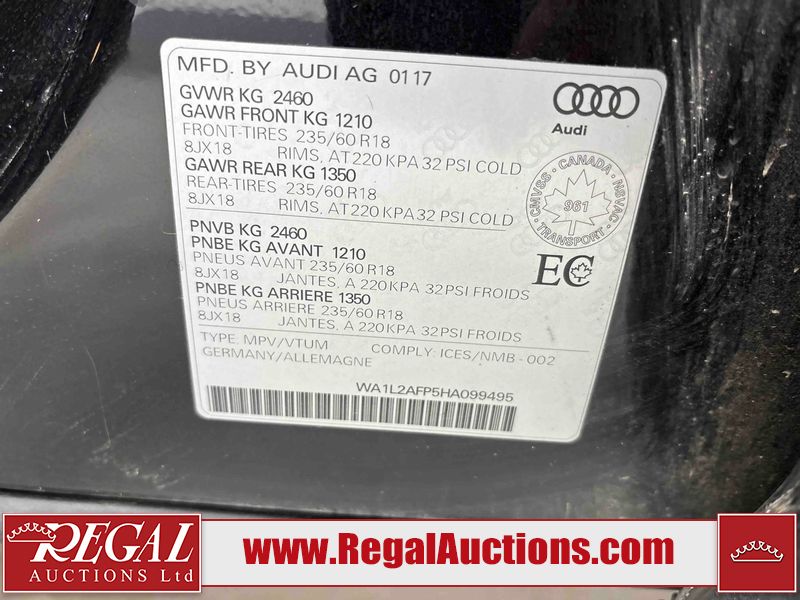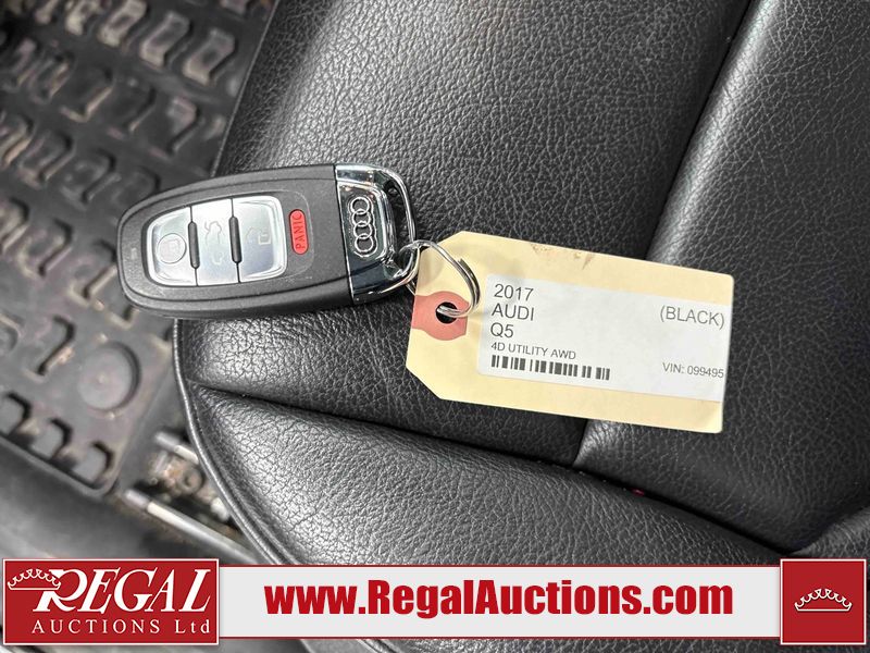 This 2017 AUDI Q5 4D UTILITY AWD is powered by a 2.0 liter 4 cylinder gasoline engine and an automatic transmission. It is equipped with all wheel drive. The SUV has seats for 5 people. The SUV has low mileage for its age. The vehicle has high value options including a sunroof, leather upholstery, power seats, heated seats, navigation, and a backup camera. The Tire Pressure light is on. The body looks to be in good condition overall. There are minimal scratches on the left front door, left rear fender, and rear bumper. There are chips in many areas around the body. There are scratches in many areas around the body. The interior looks to be in good condition overall. The windshield is chipped. The passenger side front tire and the driver's side rear tire are both worn. The other tires have lots of tread remaining. This SUV is being sold by an automotive broker. The vehicle will be sold with the following declarations: Claims Total Above $20,000 (See Footnote 1), Out of Province - BC (See Footnote 2), and Out of Province - AB OVERRIDE (See Footnote 3). Footnotes: 1) The vehicle's total recorded insurance claims history is above $20,000. This is the amount of money that was paid out by an insurance company for repairs to cover claims against the vehicle's insurance policy. This information is provided by CarFax. 2) The vehicle's last registered jurisdiction is British Columbia. The purchaser must have the vehicle undergo and pass an Out of Province inspection before it can be registered in Alberta. 3) Out of province inspection for registering the vehicle in Alberta has been completed. Regal Auctions Ltd. makes no guarantee or warranty, either express or implied, with respect to the data provided in this report. The information has been provided from the consignor and from sources generally believed to be reliable, however the accuracy of this information cannot be guaranteed by Regal Auctions.