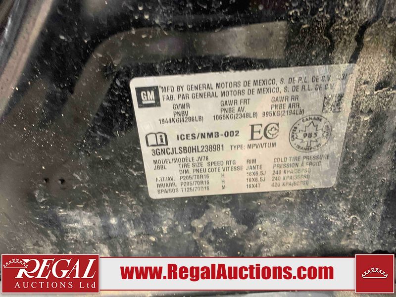This 2017 CHEVROLET TRAX LT 4D UTILITY FWD 1.4L is powered by a turbocharged 4 cylinder gasoline engine and an automatic transmission. It is a two wheel drive model. The SUV has seats for 5 people. The mileage is average considering the SUV's age. The vehicle has high value options including a backup camera. The Check Engine light is on.The vehicle has some mechanical problems. The brakes are not working and require repair. The body looks to be in rough condition overall. The rear bumper is cracked. The grille is cracked. There are conspicuous chips on the rear bumper. There is pronounced paint peeling on the right rear fender. There are slight chips on the front bumper, hood, roof, rear door, right rear fender, and right rear door. There are minimal scratches on the front bumper, hood, left front fender, left front door, left rear door, left rear fender, rear bumper, rear door, and right front door. The grille has parts missing. There is dent damage on the hood. There are very minor chips in many areas around the body. There are very minor scratches in a few areas around the body. The front bumper is not properly aligned. There is plastic trim that is loose around the left rear fender. The interior looks to be in fair condition overall. The dashboard, driver's seat, passenger seat, rear seats, and doors are dirty. The windshield is cracked. The driver's side front tire is nearly bald and should be replaced. The other tires are worn.