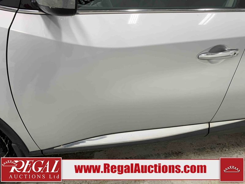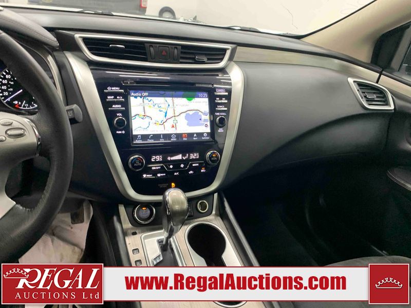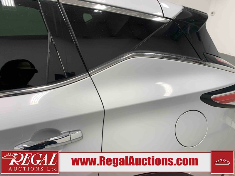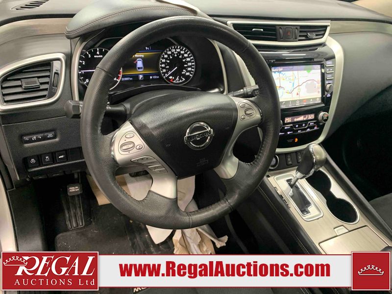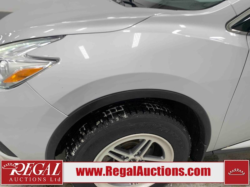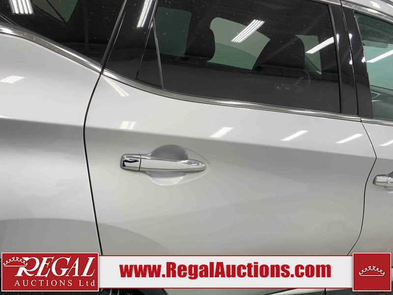 This 2017 NISSAN MURANO SV 4D UTILITY 4WD 3.5L is powered by a 6 cylinder gasoline engine and an automatic transmission. It is equipped with four wheel drive. The SUV has seats for 5 people. The SUV has high mileage for its age. The vehicle has high value options including a sunroof, power seats, heated seats, navigation, a backup camera, and a power lift gate. The body looks to be in fair condition overall. There are chips on the front bumper, grille, hood, left front fender, left front door, rear bumper, right rear fender, and right front fender. There are scratches on the front bumper, hood, rear bumper, and right rear fender. The grille has parts missing. There is minor paint peeling on the roof. There are very minor chips in many areas around the body. There are very minor scratches in many areas around the body. There is very minor dent damage on the right rear door. The interior looks to be in fair condition overall. There are a fair amount of cigarette burns on the driver's seat and passenger seat. The carpet is dirty. The windshield is damaged. The driver side mirror housing is broken. The passenger side mirror housing is broken. All of the tires have lots of tread remaining. Aftermarket alloy rims with tires have been mounted, the factory alloys are missing.