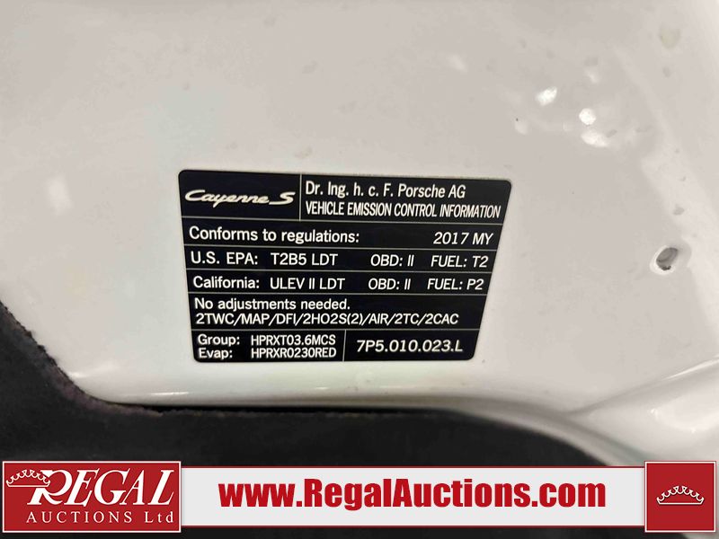 This 2017 PORSCHE CAYENNE 4D SPORT UTILITY is powered by a 420HP 3.6L 6 cylinder gasoline engine and an automatic transmission. It is equipped with four wheel drive. The SUV has seats for 5 people. The SUV has low mileage for its age. The vehicle has high value options including a sunroof, leather upholstery, power seats, heated seats, navigation, and a backup camera. The body looks to be in good condition overall. There are minor scratches on the front bumper and left front fender. There are very minor chips in many areas around the body. There are very minor scratches in many areas around the body. The interior looks to be in good condition overall. The windshield is chipped. All of the tires have lots of tread remaining. This SUV is being sold by an automotive broker. The vehicle will be sold with the following declarations: Out of Province - ON (See Footnote 1). Footnotes: 1) The vehicle's last registered jurisdiction is Ontario. The purchaser must have the vehicle undergo and pass an Out of Province inspection before it can be registered in Alberta. Regal Auctions Ltd. makes no guarantee or warranty, either express or implied, with respect to the data provided in this report. The information has been provided from the consignor and from sources generally believed to be reliable, however the accuracy of this information cannot be guaranteed by Regal Auctions.