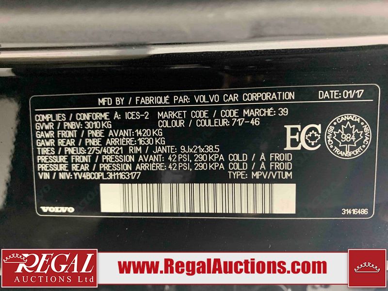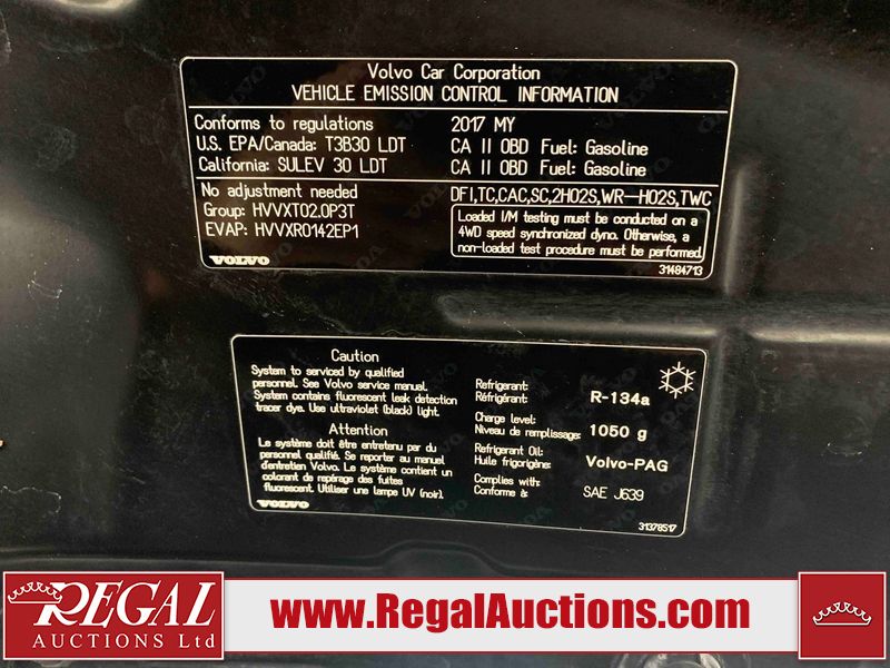 This 2017 VOLVO XC90 T8 4D UTILITY is powered by a turbocharged 2.0L 4-cylinder hybrid engine and an automatic transmission. It is equipped with all-wheel drive. The SUV has seats for 7 people. The SUV has low mileage for its age. The vehicle has high-value options including a sunroof, leather upholstery, power seats, heated seats, a backup camera, and a power lift gate. The body looks to be in good condition overall. There are incidental chips on the front bumper. There are scratches on the rear bumper and rear door. There are very minor scratches in many areas around the body. There are very minor chips in many areas around the body. The interior looks to be in good condition overall. The driver's seat is worn. The windshield is chipped. All of the tires have lots of tread remaining. This SUV is being sold by a franchise dealership. The vehicle will be sold with the following declarations: Claims Total $10,000 - $14,999 (See Footnote 1) and Dealership Trade-In (See Footnote 2). Footnotes: 1) The vehicle's total recorded insurance claims history is between $10,000 - $14,999. This is the amount of money that was paid out by an insurance company for repairs to cover claims against the vehicle's insurance policy. This information is provided by CarFax. 2) This vehicle is being sold on behalf of a franchise dealership. Franchise Dealerships are automotive sales companies who are directly connected to an automotive manufacturer like Ford, Tesla, Honda, BMW, or similar. Regal Auctions Ltd. makes no guarantee or warranty, either express or implied, with respect to the data provided in this report. The information has been provided from the consignor and from sources generally believed to be reliable, however the accuracy of this information cannot be guaranteed by Regal Auctions.