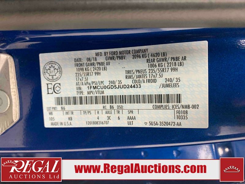 This 2018 FORD ESCAPE SE 4D SPORT UTILITY is powered by a turbocharged 1.5L 4C 4 cylinder gasoline engine and an automatic transmission. It is a two wheel drive model. The SUV has seats for 5 people. The SUV has low mileage for its age. The vehicle has high value options including power seats, heated seats, a backup camera, and a power lift gate. The body looks to be in fair condition overall. There are chips on the front bumper, grille, hood, roof, left front fender, and left rear door. There are scratches on the front bumper and left rear door. There are very minor scratches in many areas around the body. There are very minor chips in many areas around the body. There is very minor dent damage in a few areas around the body. The interior looks to be in good condition overall. The windshield is cracked. All of the tires have lots of tread remaining. This SUV is being sold by a private individual. The vehicle will be sold with the following declarations: Claims Total $1000 - $2999 (See Footnote 1). Footnotes: 1) The vehicle's total recorded insurance claims history is between $1,000 - $2,999. This is the amount of money that was paid out by an insurance company for repairs to cover claims against the vehicle's insurance policy. This information is provided by CarFax. Regal Auctions Ltd. makes no guarantee or warranty, either express or implied, with respect to the data provided in this report. The information has been provided from the consignor and from sources generally believed to be reliable, however the accuracy of this information cannot be guaranteed by Regal Auctions.