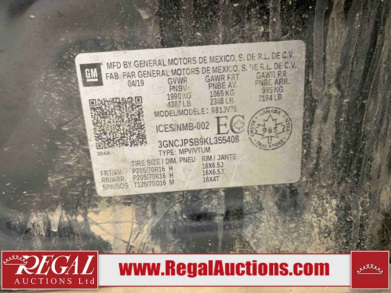 This 2019 CHEVROLET TRAX LT 4D UTILITY AWD 1.4L is powered by a 4 cylinder gasoline engine and an automatic transmission. It is equipped with four wheel drive. The SUV has seats for 5 people. The SUV has low mileage for its age. The vehicle has high value options including leather upholstery, power seats, and a backup camera. The body looks to be in fair condition overall. The hood has been repainted poorly. There are incidental scratches on the front bumper, hood, left front door, left rear fender, rear bumper, right rear door, right front door, and right front fender. There are very minor chips in many areas around the body. There are very minor scratches in many areas around the body. There is license plate light bracket damage to the rear door. The interior looks to be in good condition overall. The windshield looks to be in good condition. The front tires are both worn. The rear tires both have lots of tread remaining.