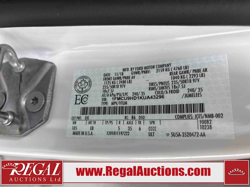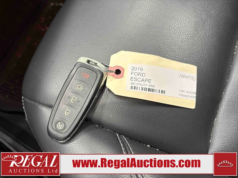 This 2019 FORD ESCAPE 4D UTILITY 4WD is powered by a turbocharged 1.5L 4-cylinder gasoline engine and an automatic transmission. It is equipped with four-wheel drive. The SUV has seats for 5 people. The SUV has high mileage for its age. The vehicle has high-value options including a sunroof, leather upholstery, power seats, and a backup camera. The body looks to be in good condition overall. There are minor chips on the left front fender. There is dent damage on the right rear fender. There are very minor chips in many areas around the body. There are very minor scratches in many areas around the body. The interior looks to be in good condition overall. The windshield is chipped. All of the tires have lots of tread remaining. This SUV is being sold by a franchise dealership. The vehicle will be sold with the following declarations: Dealership Trade-In (See Footnote 1). Footnotes: 1) This vehicle is being sold on behalf of a franchise dealership. Franchise Dealerships are automotive sales companies who are directly connected to an automotive manufacturer like Ford, Tesla, Honda, BMW, or similar. Regal Auctions Ltd. makes no guarantee or warranty, either express or implied, with respect to the data provided in this report. The information has been provided from the consignor and from sources generally believed to be reliable, however the accuracy of this information cannot be guaranteed by Regal Auctions.